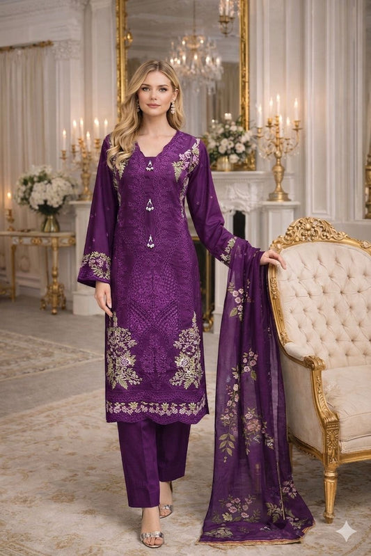 LS-3060 Premium Ready-to-Wear 3 Piece Viscose Suit |Sequins & Thread Embroidery|Trouser & Matching Dupatta - Midnight Purple