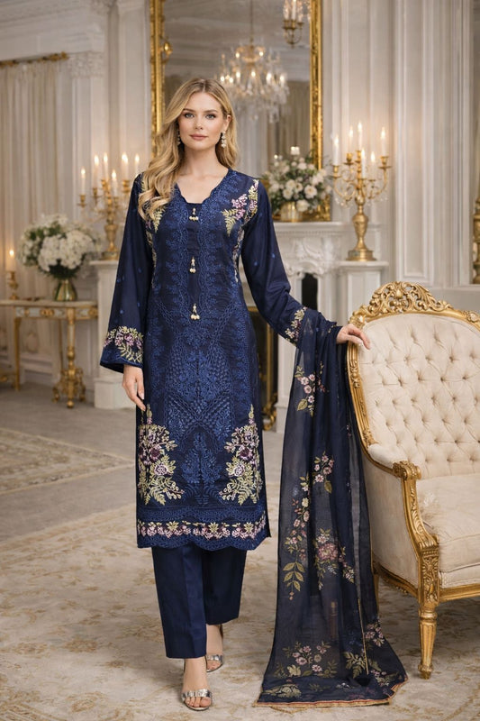 LS-3064 Premium Ready-to-Wear 3 Piece Linen Suit | Digital Printed & Stone Work |Trouser & Matching Dupatta - Navy Blue