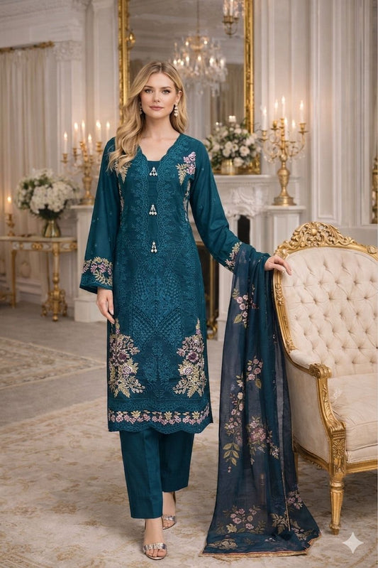 LS-3066 LS-3051 Premium Ready-to-Wear 3 Piece Viscose Suit | Thread Embroidery|Trouser & Linen Slub Printed Dupatta - Oceanic Teal