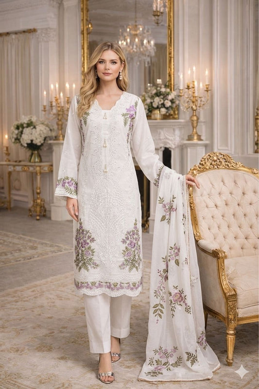 LS-3066 LS-3051 Premium Ready-to-Wear 3 Piece Viscose Suit | Thread Embroidery|Trouser & Linen Slub Printed Dupatta - White