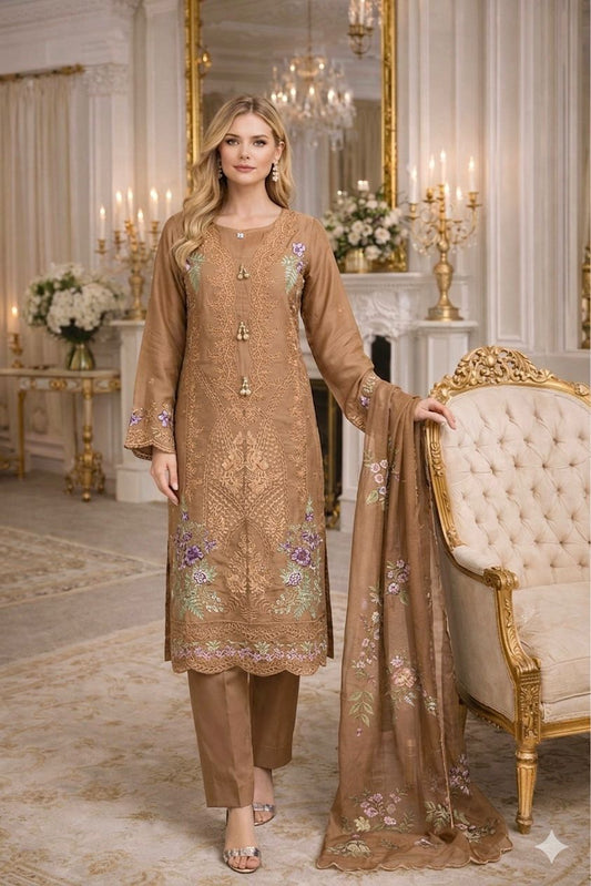 LS-3066 LS-3051 Premium Ready-to-Wear 3 Piece Viscose Suit | Thread Embroidery|Trouser & Linen Slub Printed Dupatta - Amber Brown