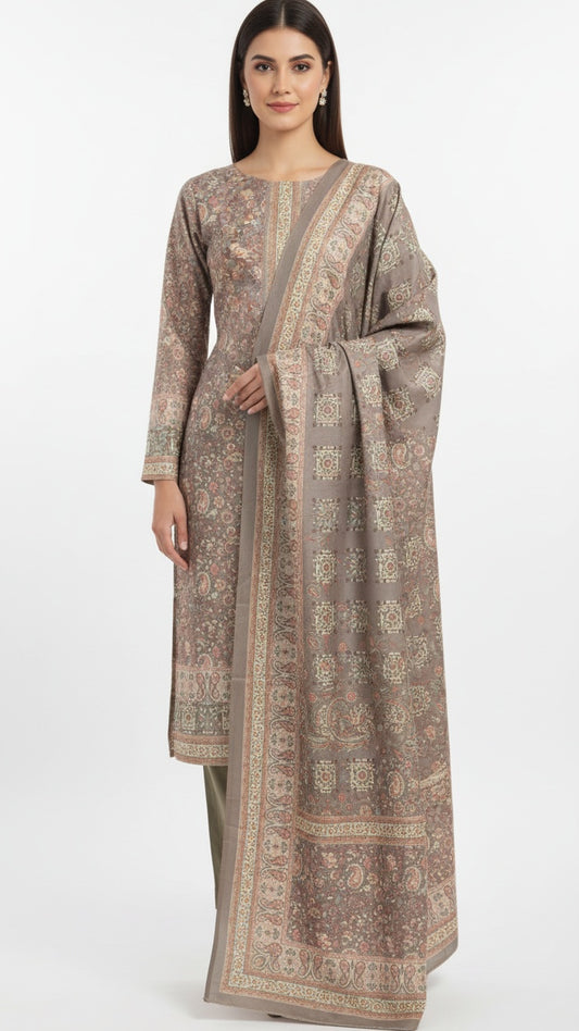FBLSU-04 Affordable Premium Pashmina Winter Suit – Ready-to-Wear Printed Kameez, Shawl & Trousers - Ash Olive