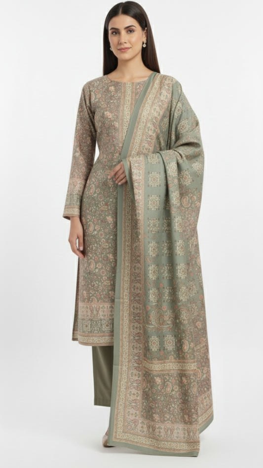 FBLSU-04 Affordable Premium Pashmina Winter Suit – Ready-to-Wear Printed Kameez, Shawl & Trousers - Dusty Green