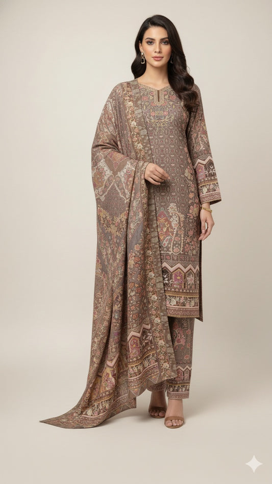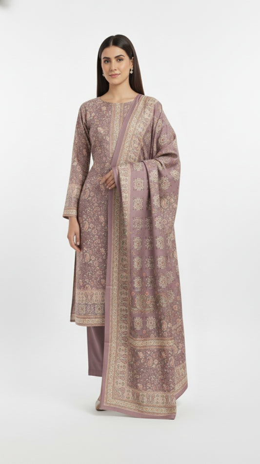 FBLSU-04 Affordable Premium Pashmina Winter Suit – Ready-to-Wear Printed Kameez, Shawl & Trousers - Smokey Lilac