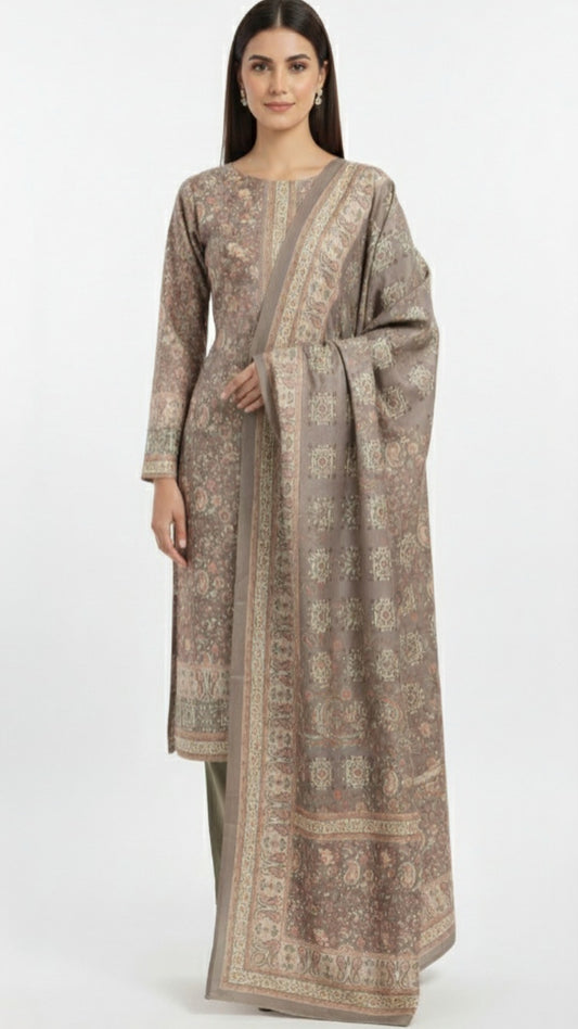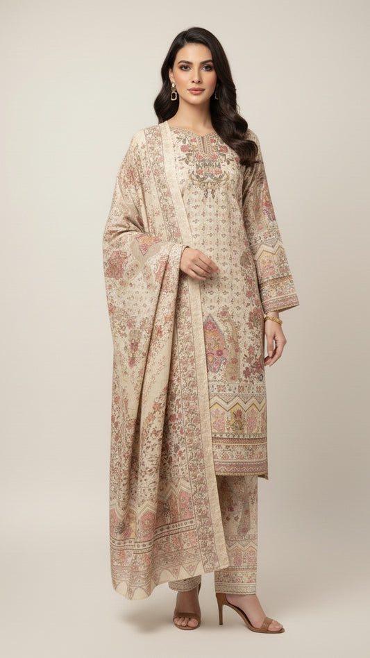 FBLSU-04 Affordable Premium Pashmina Winter Suit – Ready-to-Wear Printed Kameez, Shawl & Trousers - Warm Beige