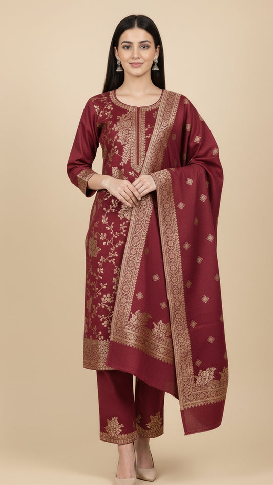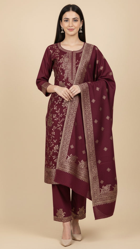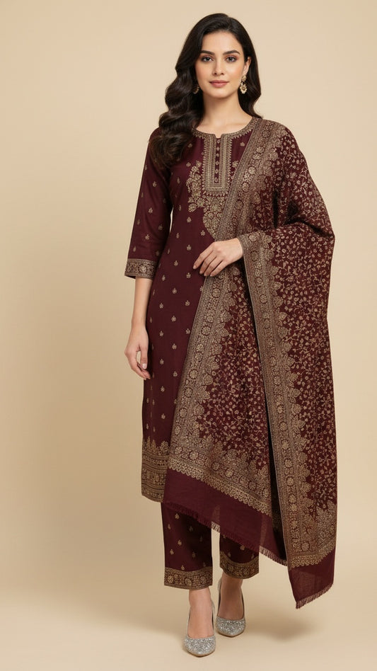 FBLSU-02 Affordable Premium Pashmina Suit | Woven Embroidery Shawl | Ready-to-Wear 3-Piece Set - Wine Berry