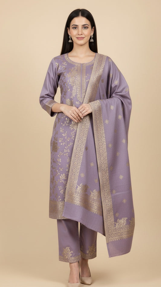 FBLSU-01 Affordable Premium Pashmina Suit | All-Over Woven Embroidery | Ready-to-Wear 3-Piece Set - Lavender