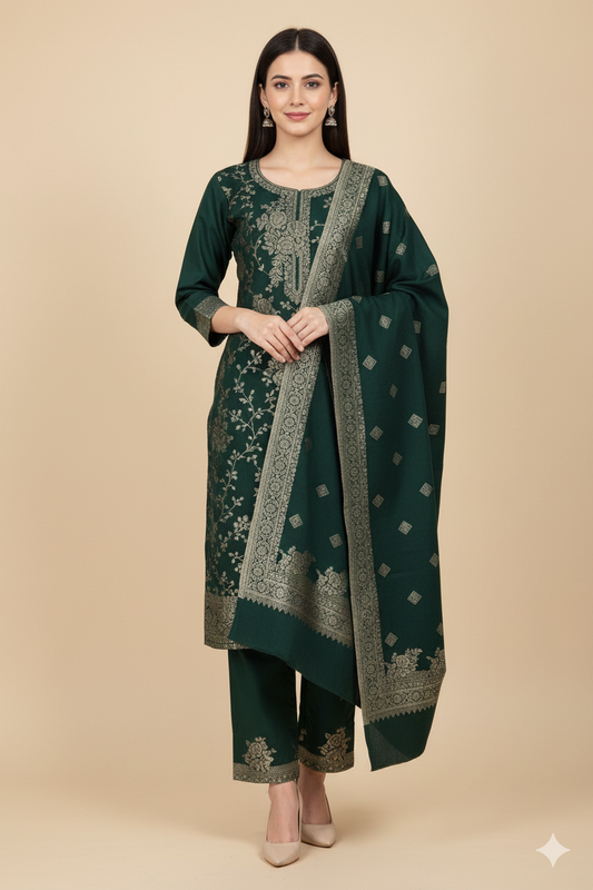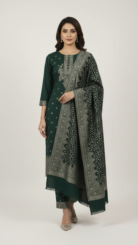 FBLSU-02 Affordable Premium Pashmina Suit | Woven Embroidery Shawl | Ready-to-Wear 3-Piece Set - Green Oasis