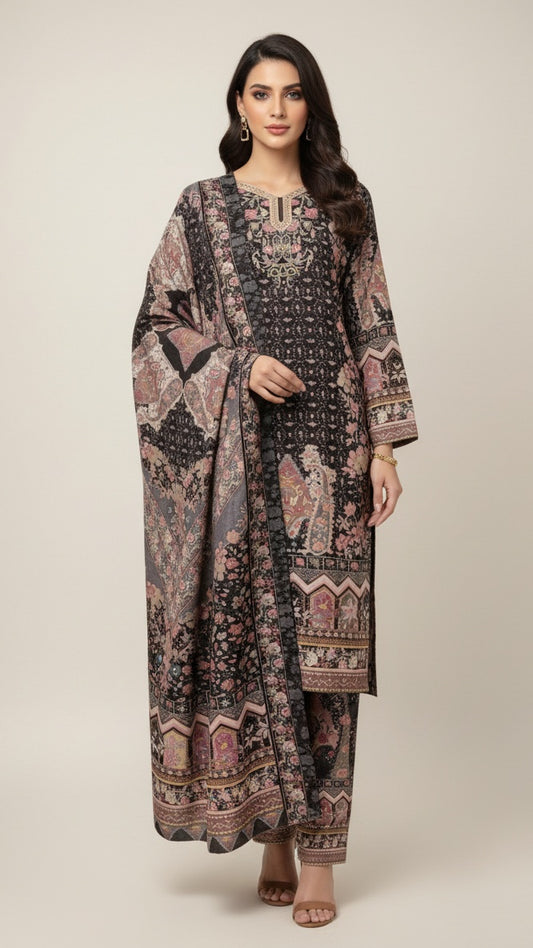 FBLSU-03 Affordable Premium Pashmina Suit | Intricate Digital Print Shawl | Ready-to-Wear 3-Piece Set - Storm Grey