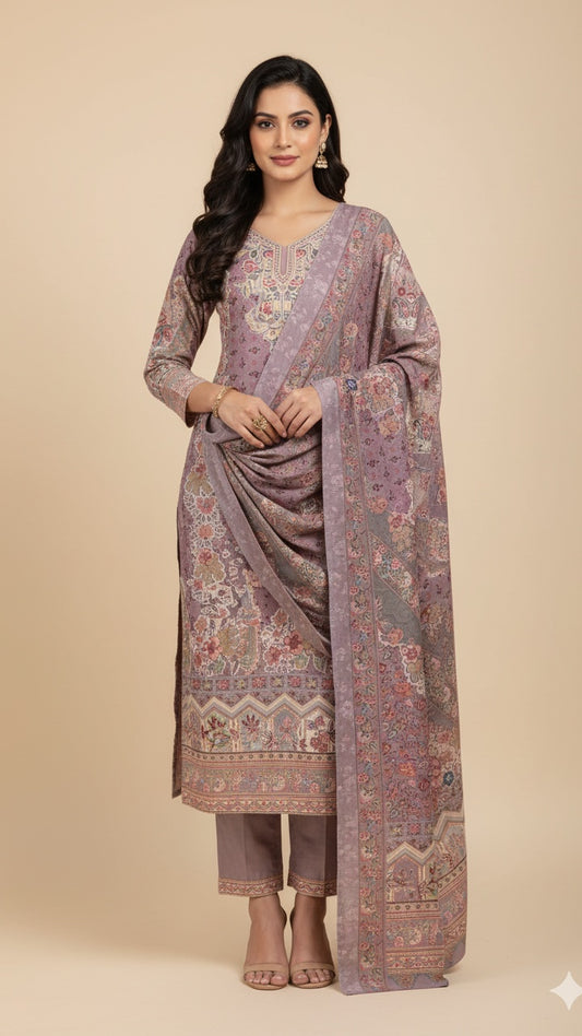 FBLSU-03 Affordable Premium Pashmina Suit | Intricate Digital Print Shawl | Ready-to-Wear 3-Piece Set - Ash Lilac