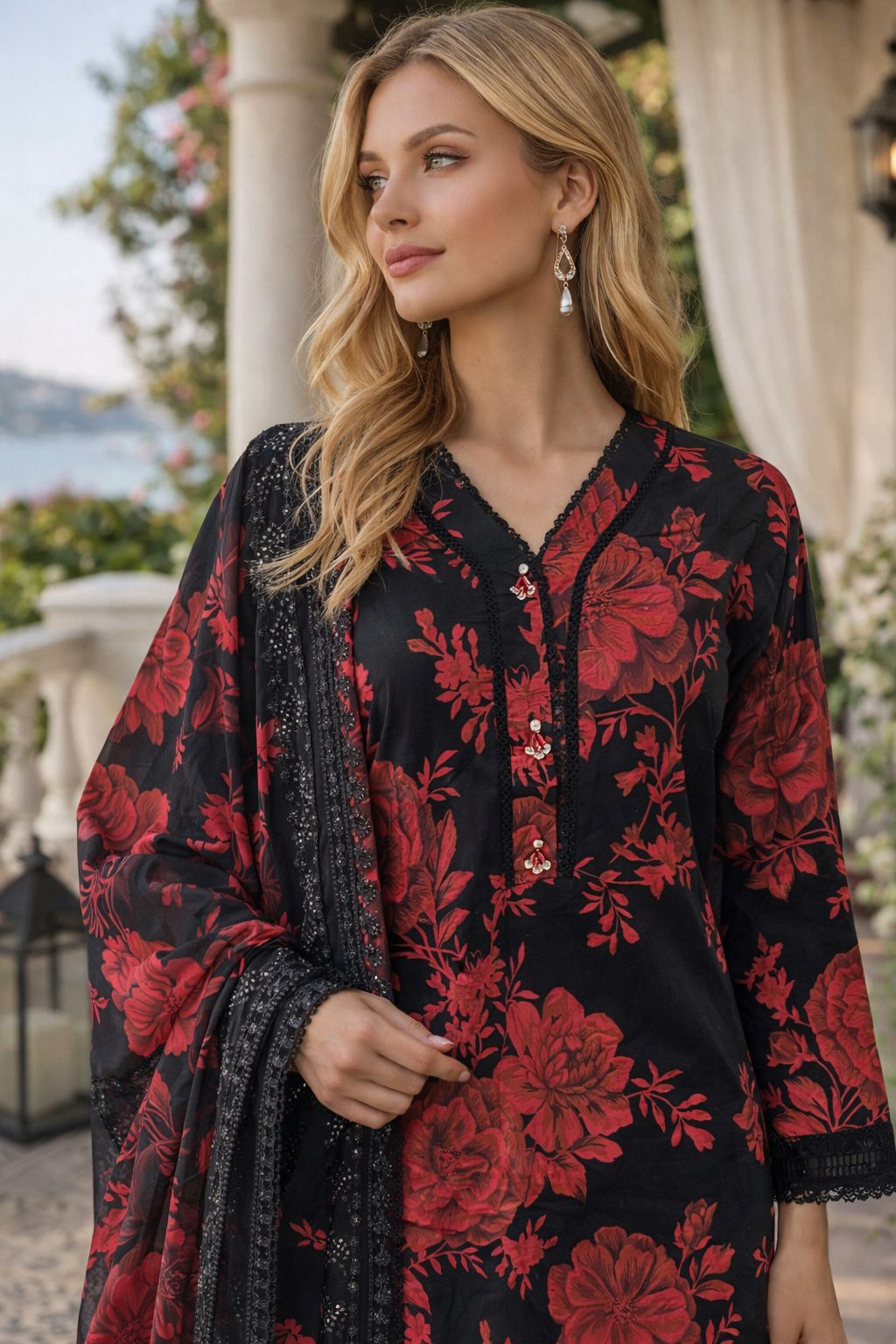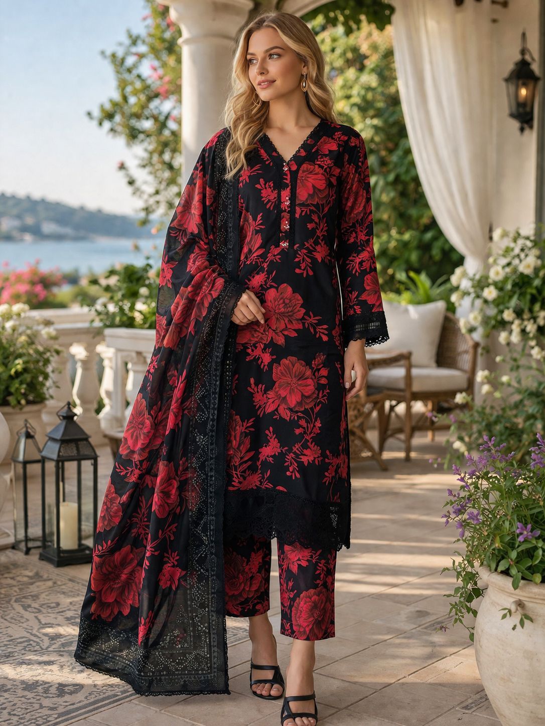 Lawn fabric offers breathable comfort without compromising on luxury, making it ideal for warm-weather celebrations, weddings, and formal gatherings. The refined floral pattern paired with delicate lace creates a striking visual narrative that speaks to refined taste and attention to detail.