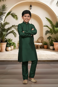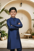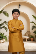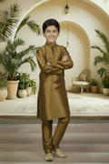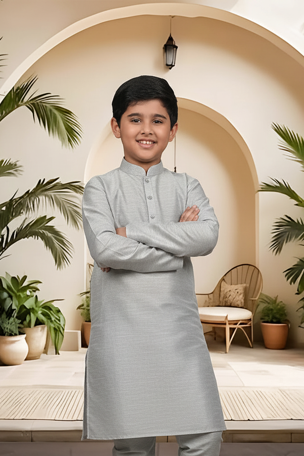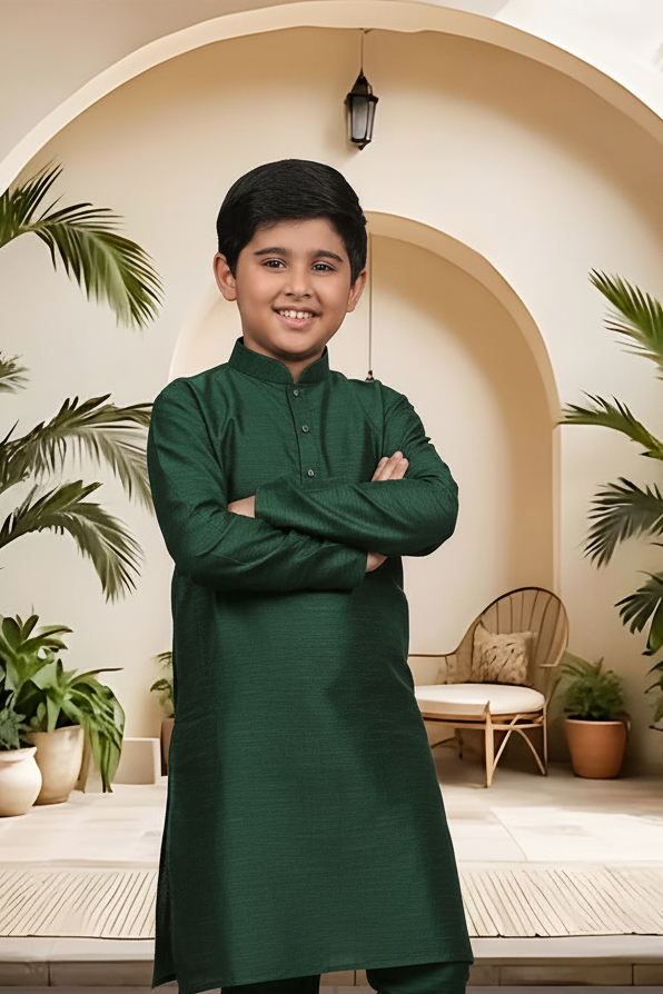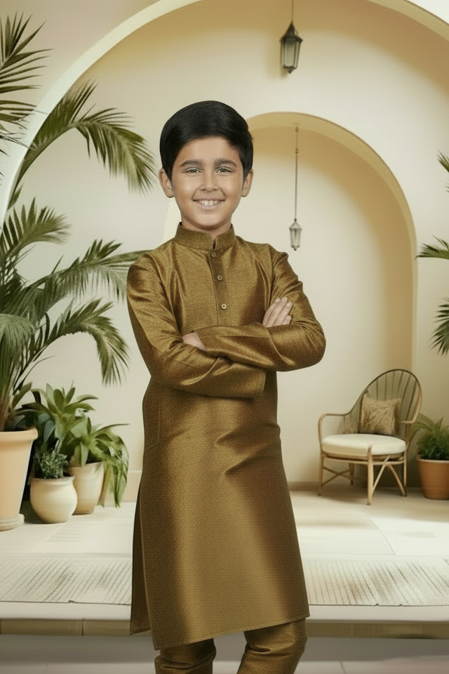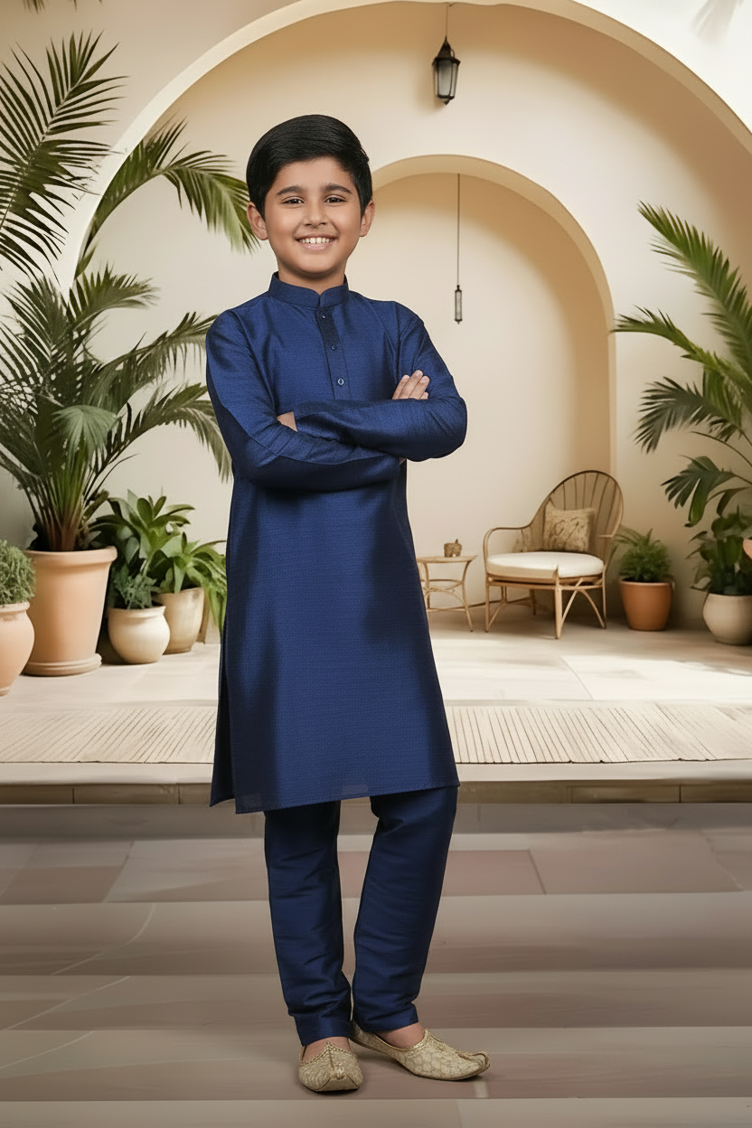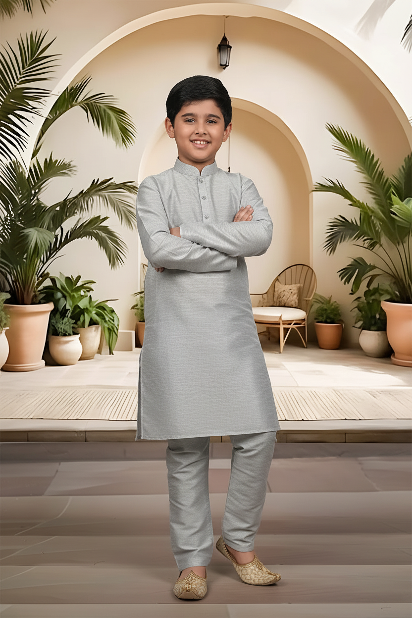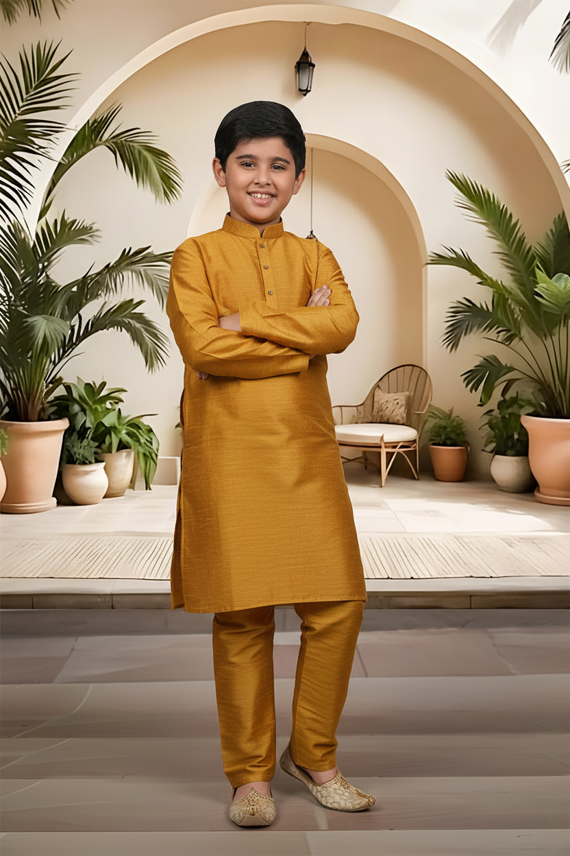 Introduce a touch of artisanal sophistication to your little man's traditional wardrobe. Crafted from the same high-quality raw silk blend as our Menswear set, this boys' Kurta Pyjama (Product Code: FBBS-116) features the same distinguished textured linear grain and subtle, rich sheen. It is engineered with a slightly more generous cut to ensure all-day comfort and easy movement, making it the perfect choice for family celebrations and formal events. Complete his ceremonial look by styling this set with traditional Khusas, classic loafers, or small Mojaris.