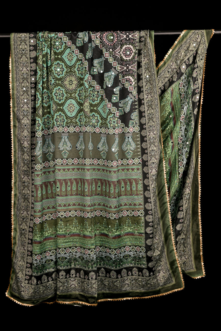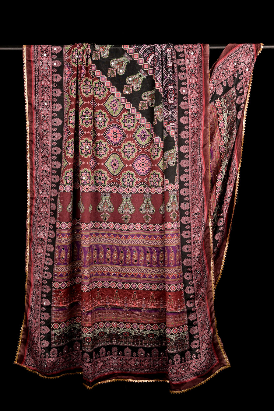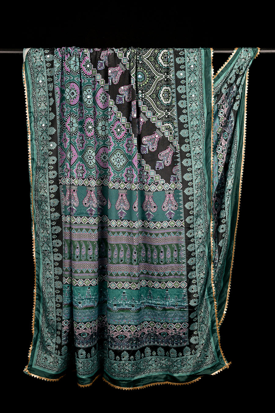 Elevate your wardrobe with this Elegant Chinnon Digital Print Dupatta, crafted in soft, flowy chinnon for a luxurious drape. The design showcases a vibrant mix of traditional and modern motifs in rich jewel tones, highlighted with delicate stone and mirror embellishments that shimmer beautifully under the light.