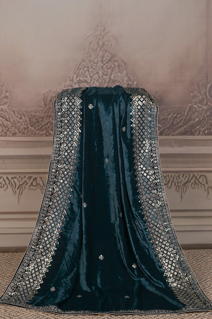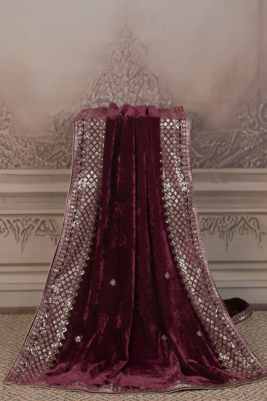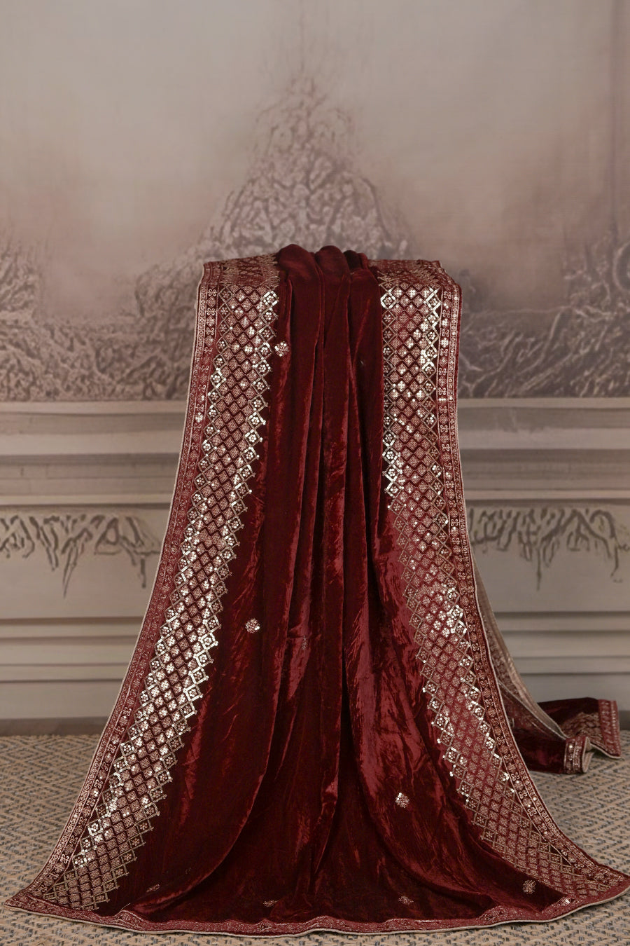 Indulge in pure elegance with this Premium Micro Velvet Dupatta, crafted for those who love timeless luxury. The rich velvet fabric offers a regal drape and a soft, plush feel, while delicate embroidered motifs and an intricately designed border create a stunning blend of tradition and sophistication.