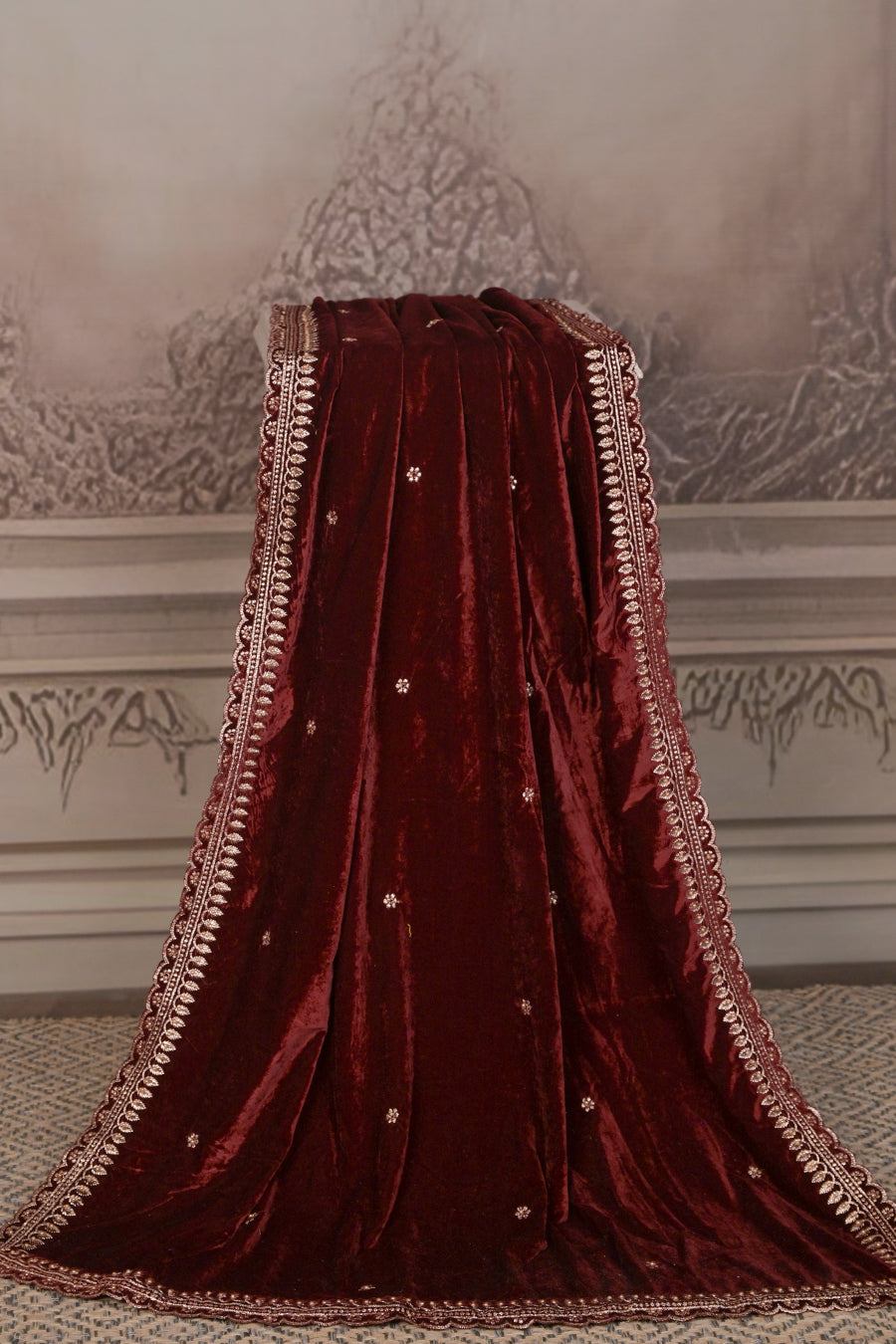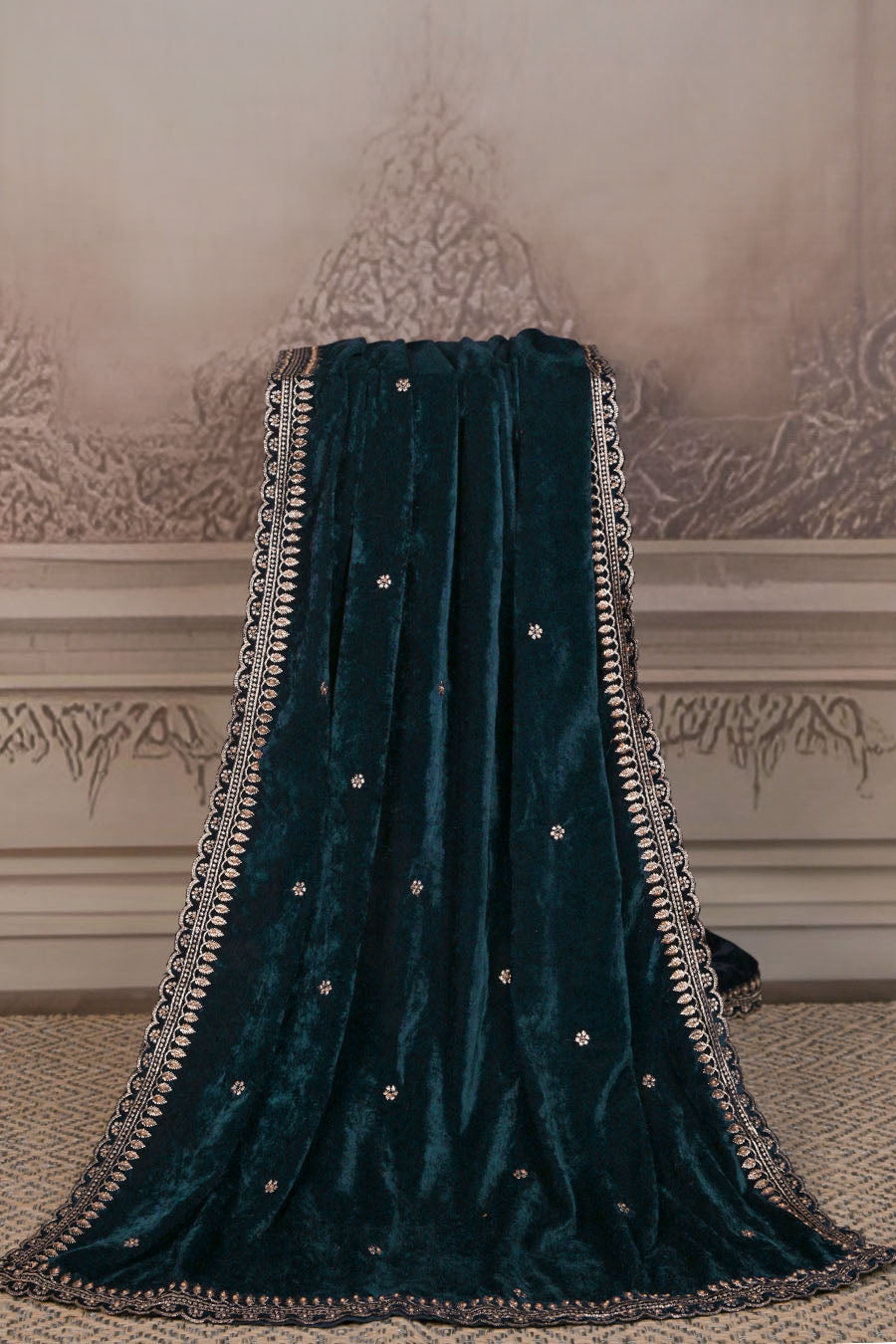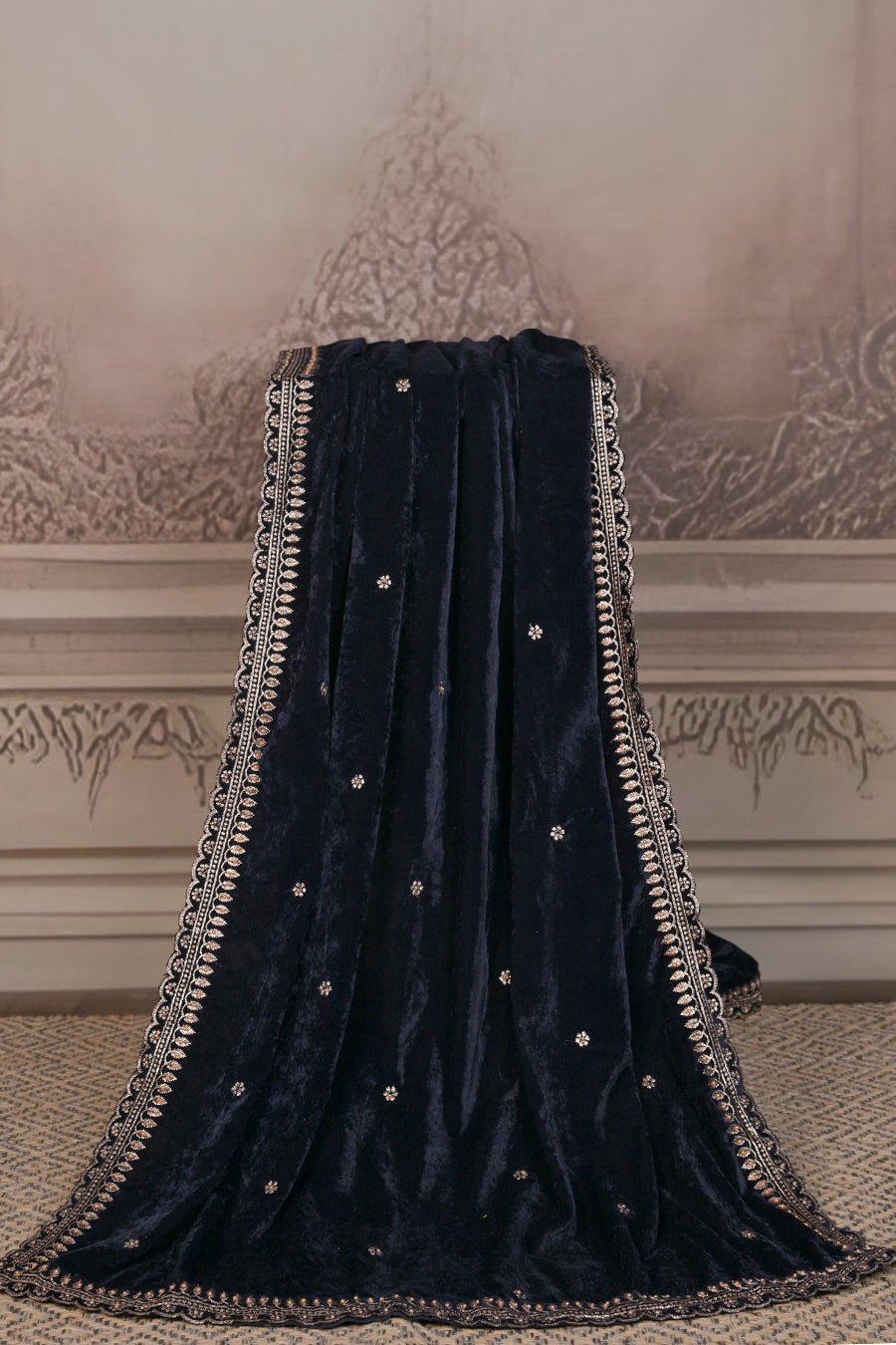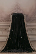 Step into royal elegance with this breathtaking black velvet dupatta, designed to make every occasion unforgettable. Crafted from sumptuous velvet, it showcases delicate embroidered motifs scattered across the fabric, while the luxuriously detailed border frames it with an opulent finish.