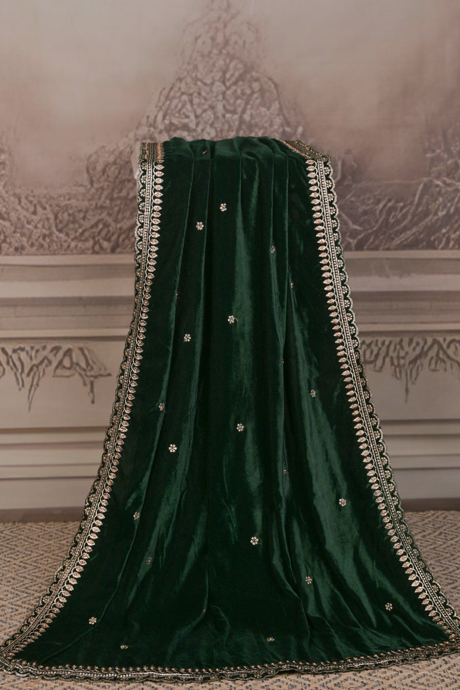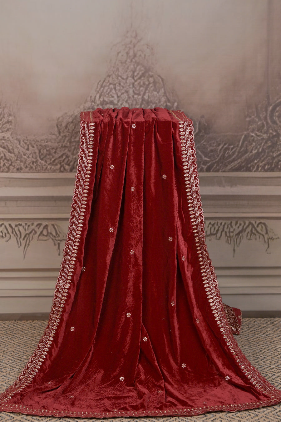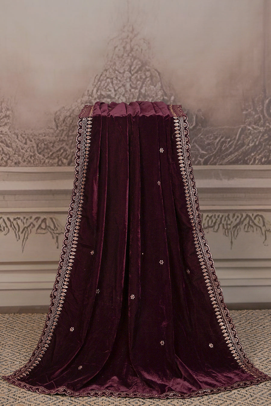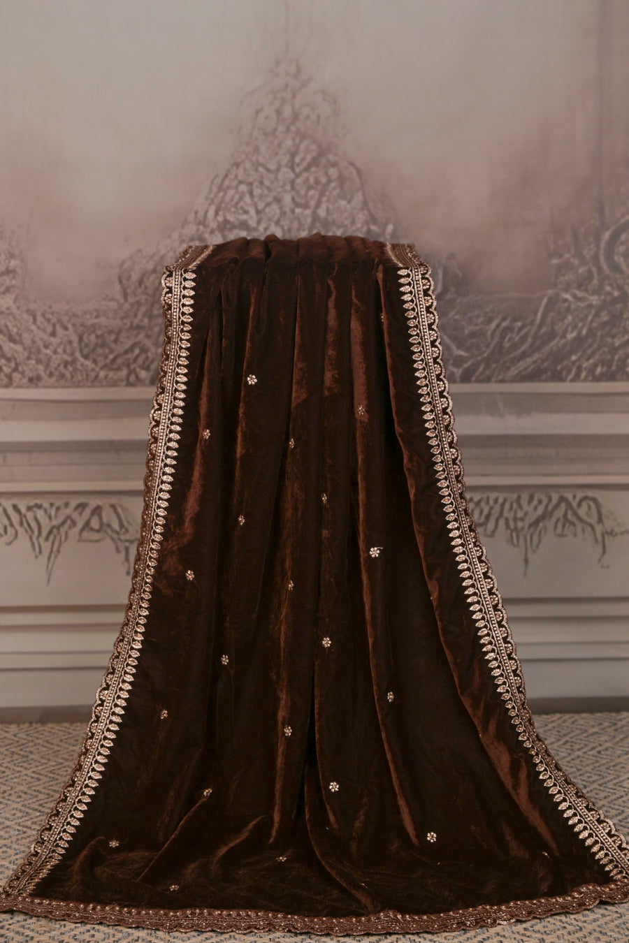 Step into royal elegance with this breathtaking black velvet dupatta, designed to make every occasion unforgettable. Crafted from sumptuous velvet, it showcases delicate embroidered motifs scattered across the fabric, while the luxuriously detailed border frames it with an opulent finish.