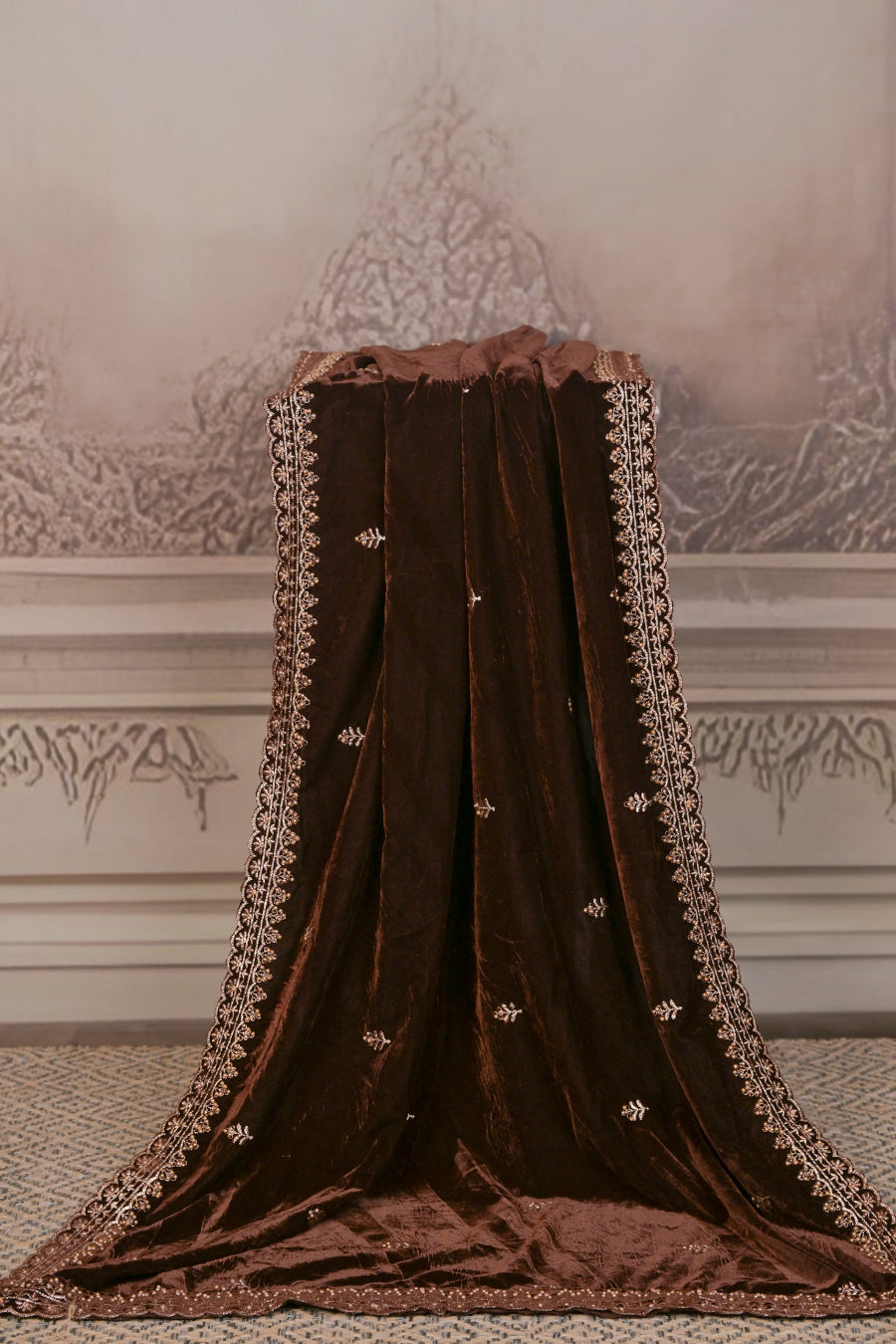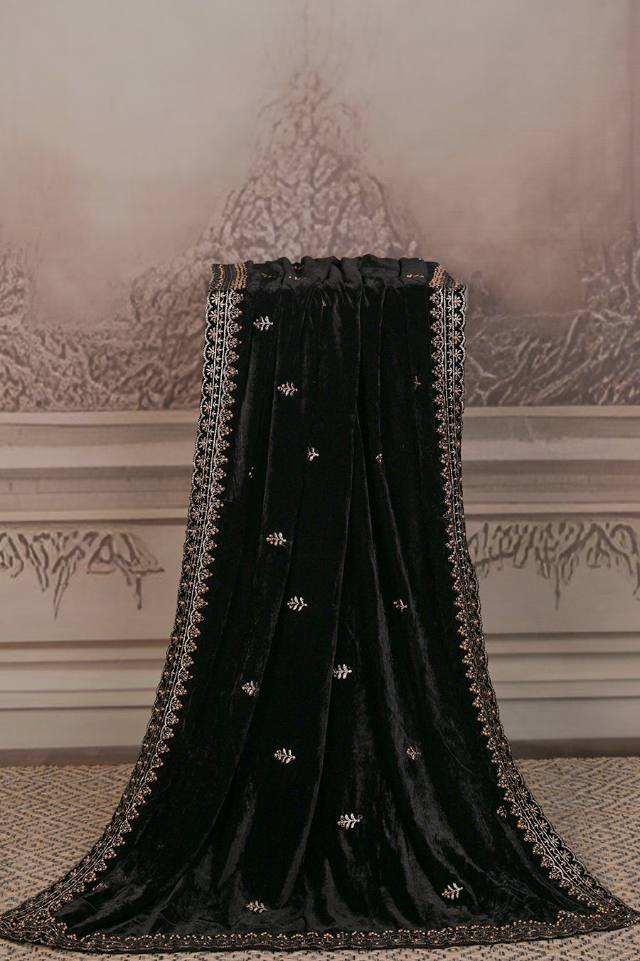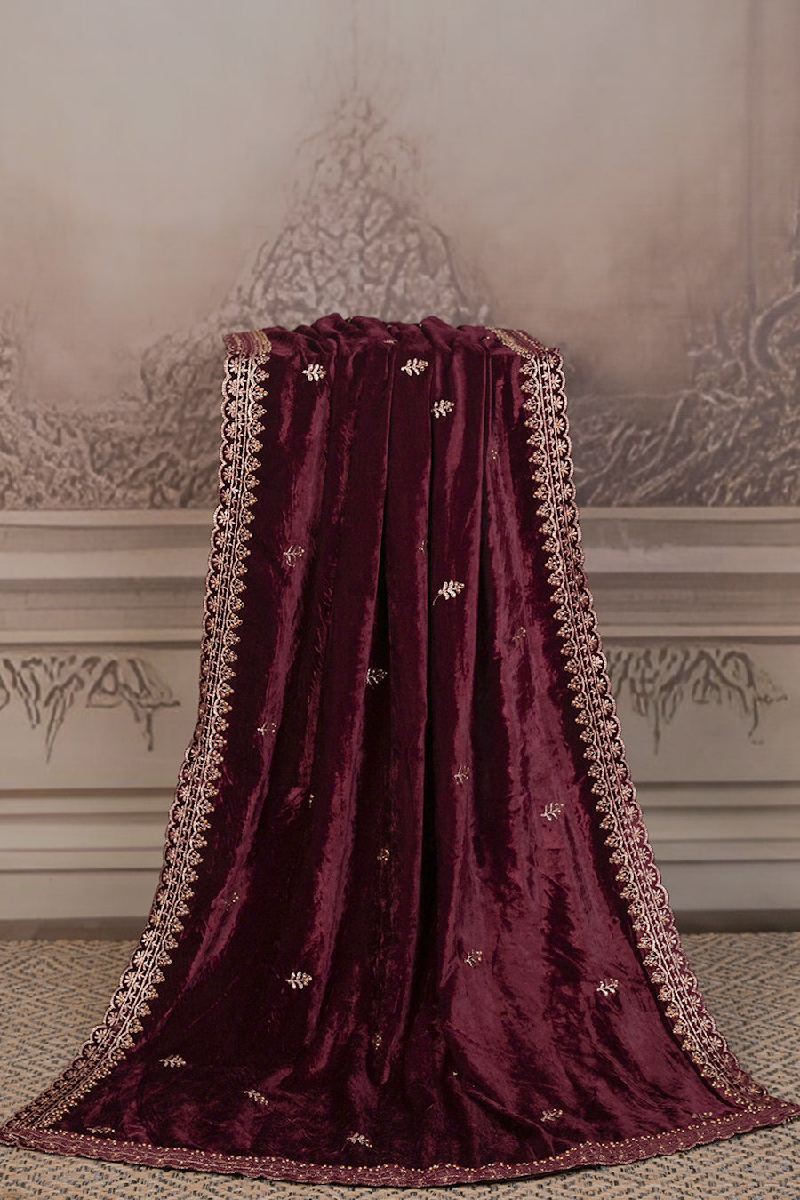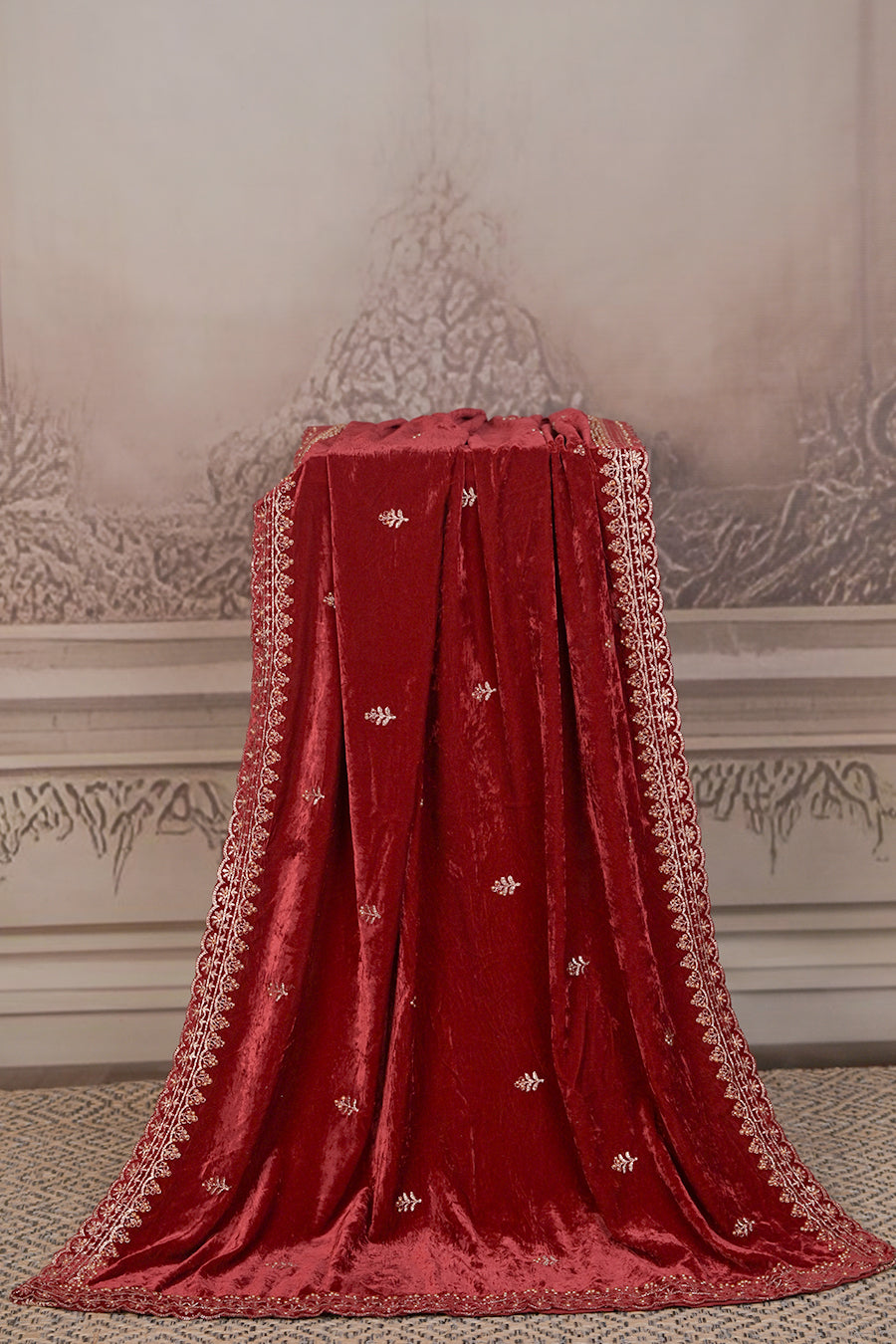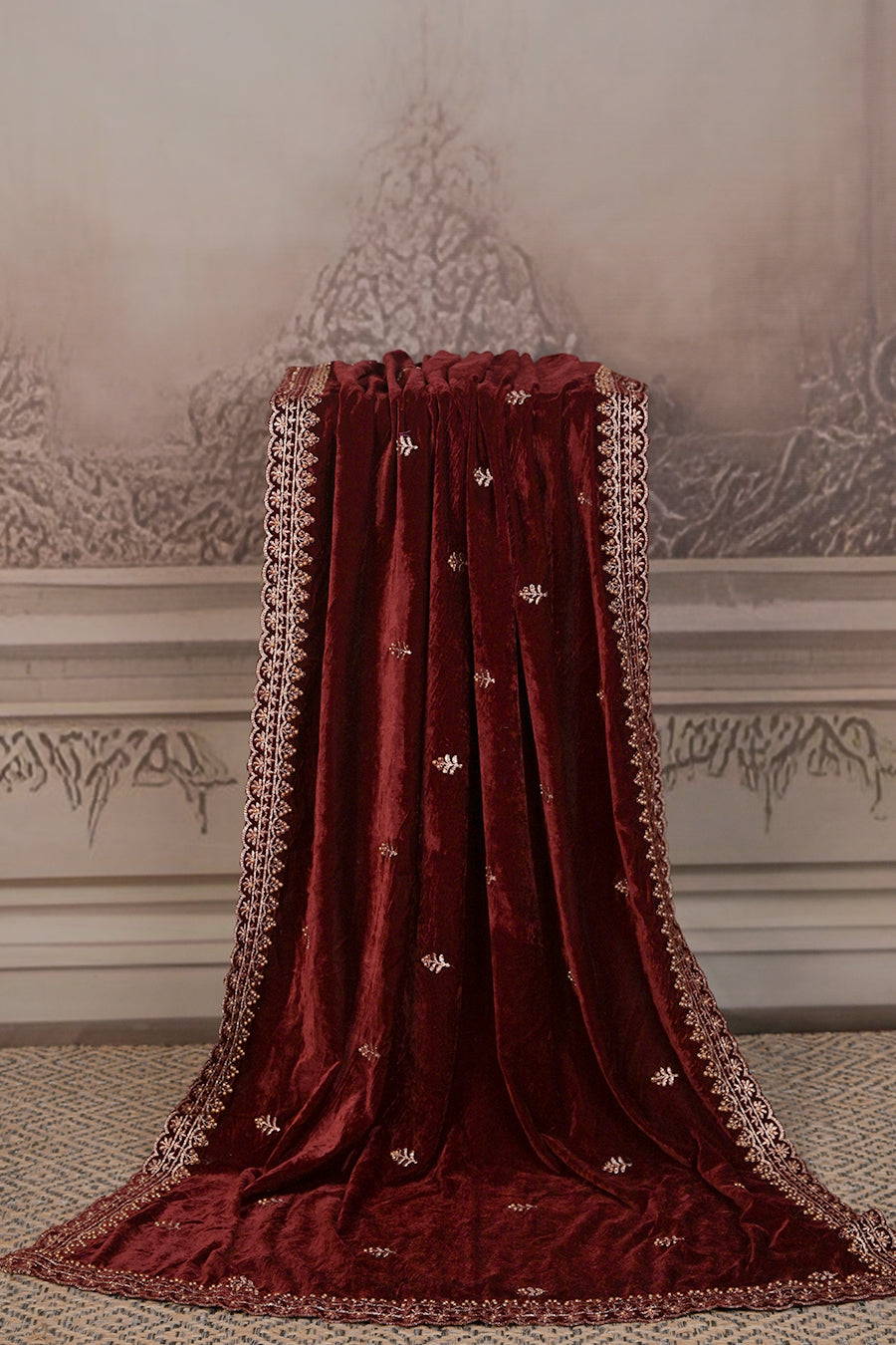 Step into pure elegance with this luxurious micro velvet dupatta, designed to add a royal touch to your festive and wedding ensembles. Crafted from plush velvet that flows with a rich, regal drape, it is adorned with delicate embroidery and an intricately designed border that exudes timeless sophistication.