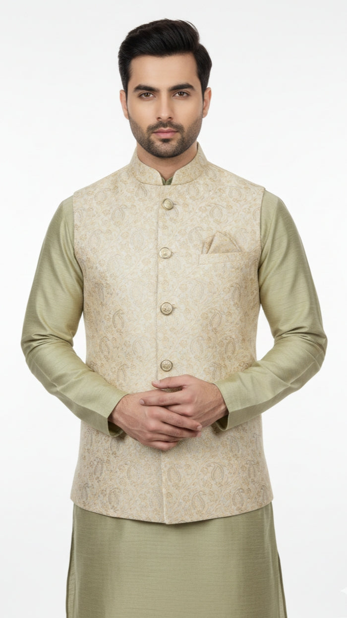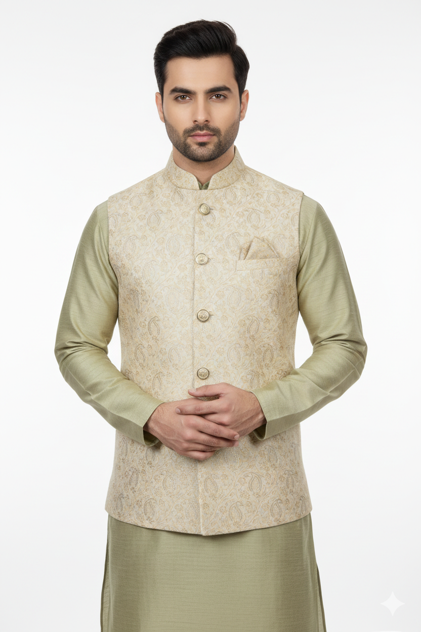 This Jacquard Paisley Waistcoat is a precision-cut standalone piece designed for formal layering. Constructed from high-density jacquard fabric, it features a structural paisley weave in a sophisticated Dark Gold tone, offering a deep metallic luster and refined tactile finish. The garment is engineered with a stand collar and a five-button placket to ensure a sharp, masculine silhouette.