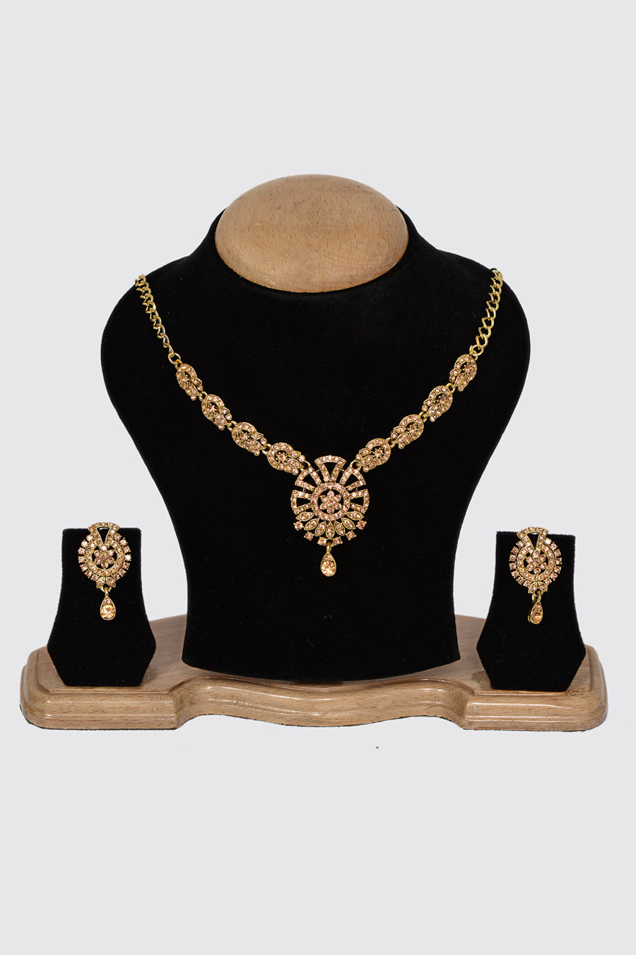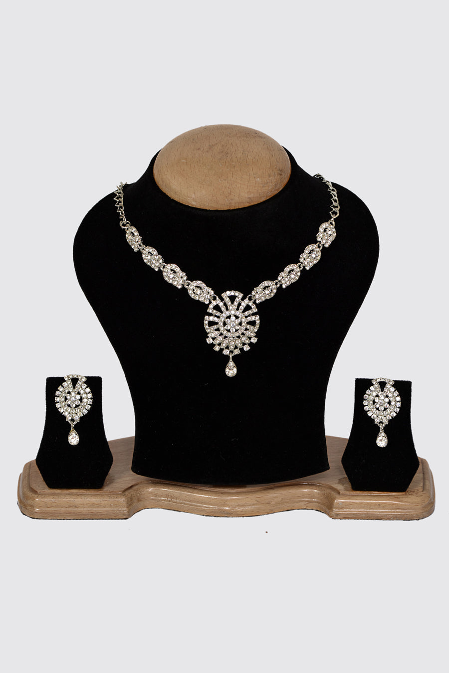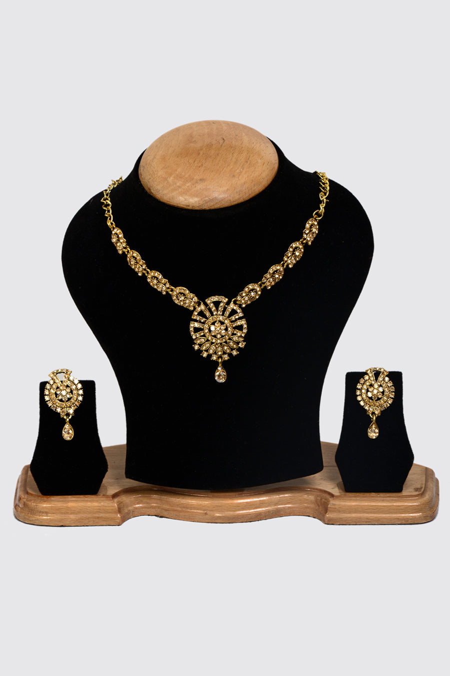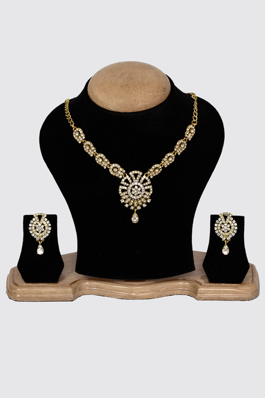 Let your little one sparkle with grace in this beautifully designed diamond-look necklace set. Featuring radiant stones arranged in a delicate floral pattern, the set comes with matching earrings and a lightweight golden chain that's comfortable for kids to wear.