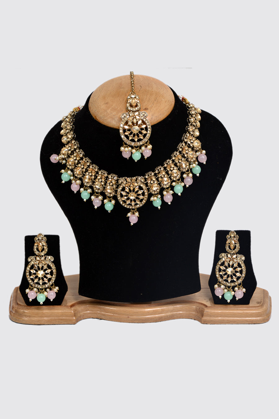 Elevate your traditional attire with these exquisite stone jewelry sets featuring a detailed circular floral motif. Accented with pastel and jewel-toned hanging beads, these sets include a choker necklace, elegant earrings, and a statement maang tikka. Perfect for Mehendi, Haldi, or festive celebrations.