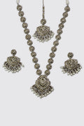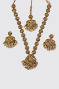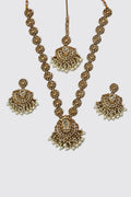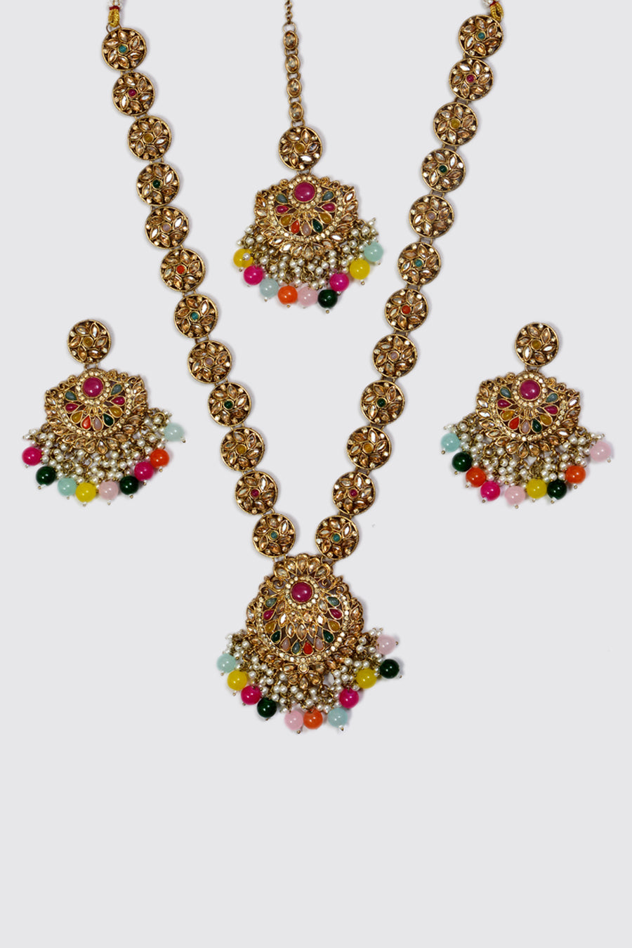 Add a regal touch to your ethnic wardrobe with this Kundan necklace set, intricately detailed with floral motifs and finished with cascading layers of classic white pearls. The set includes a statement necklace, matching earrings, and a maang tikka perfect for bridal occasions and festive wear. This timeless design evokes heritage charm with a luxurious modern finish.