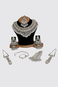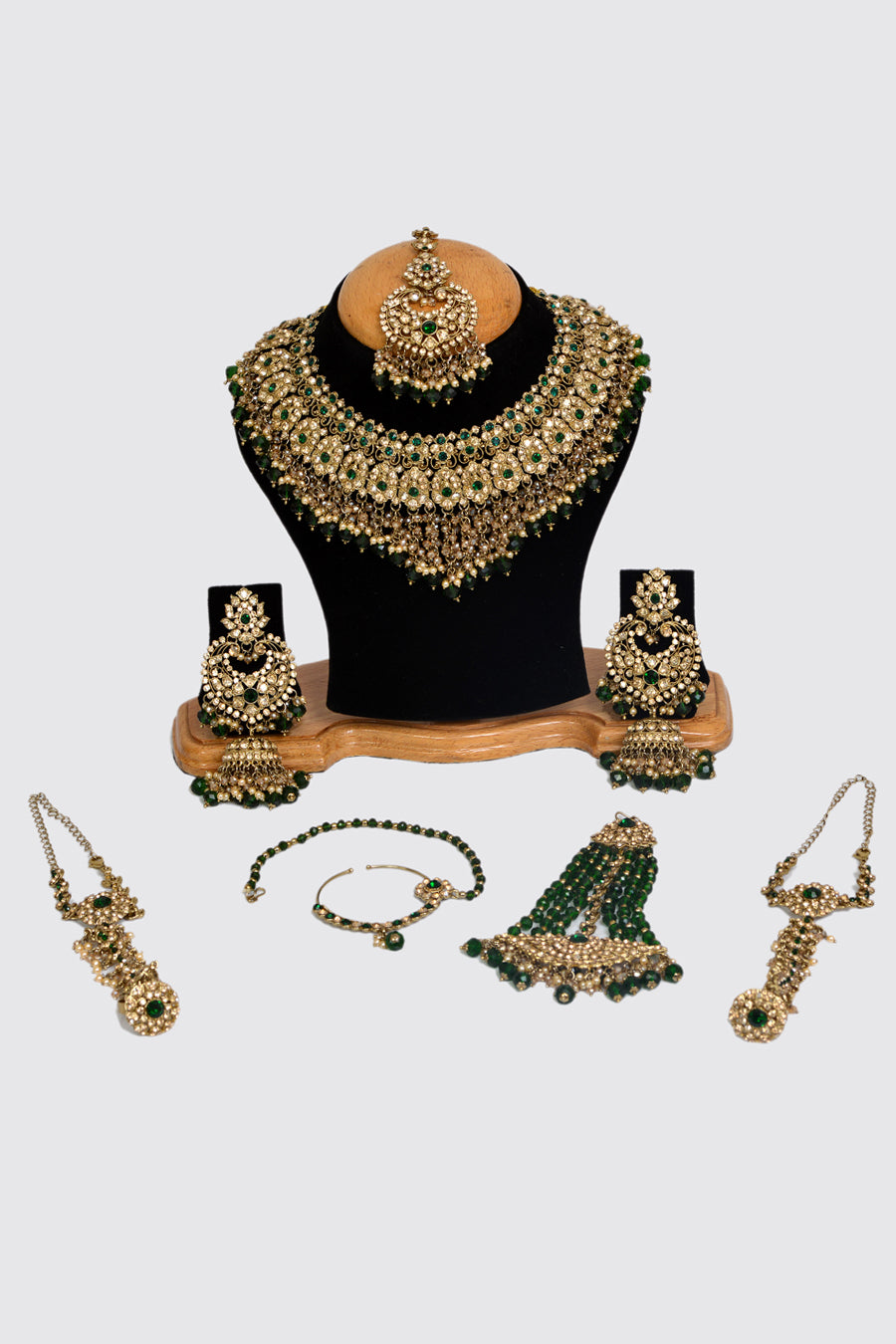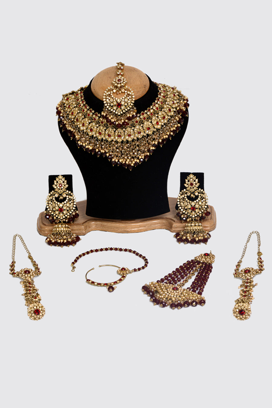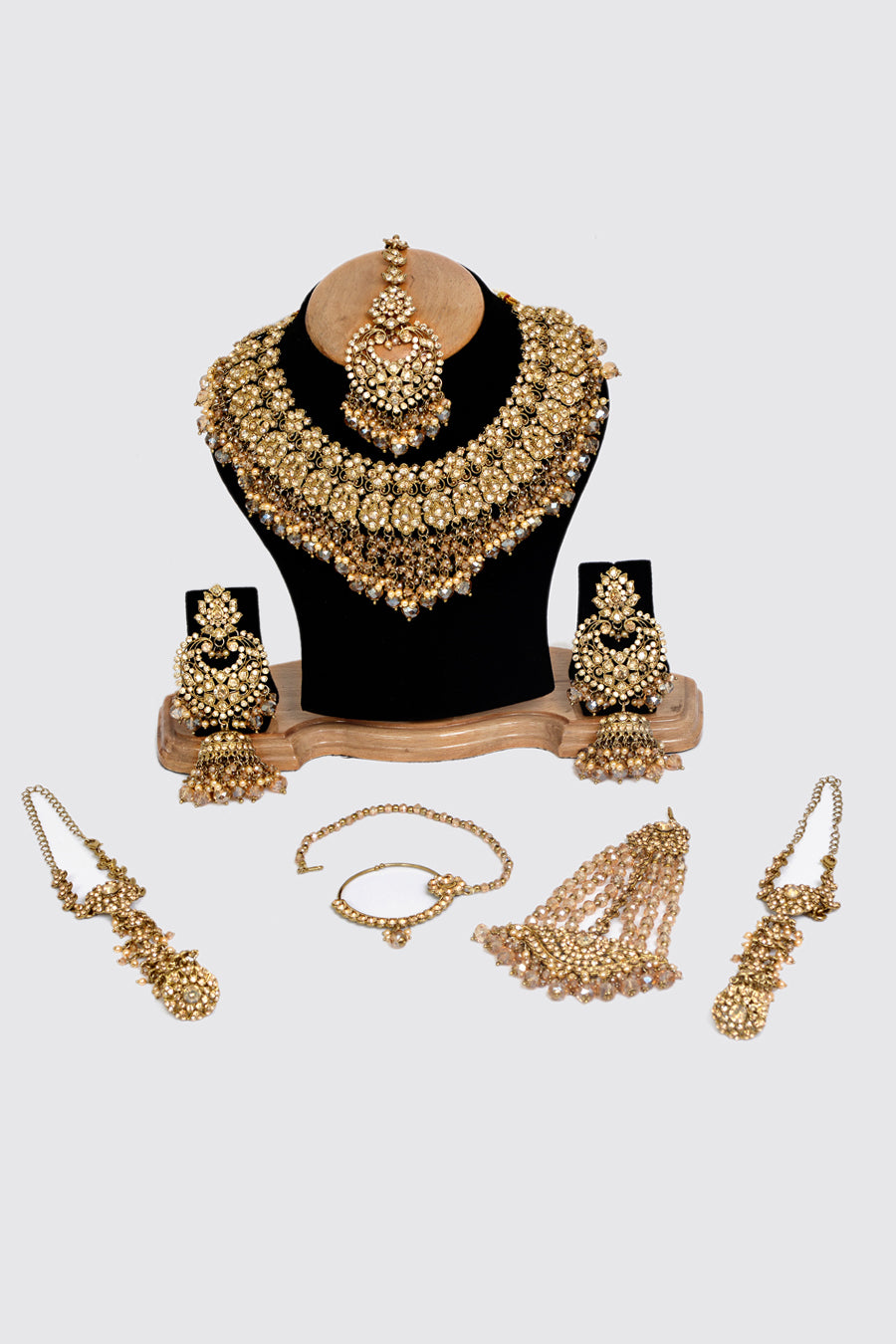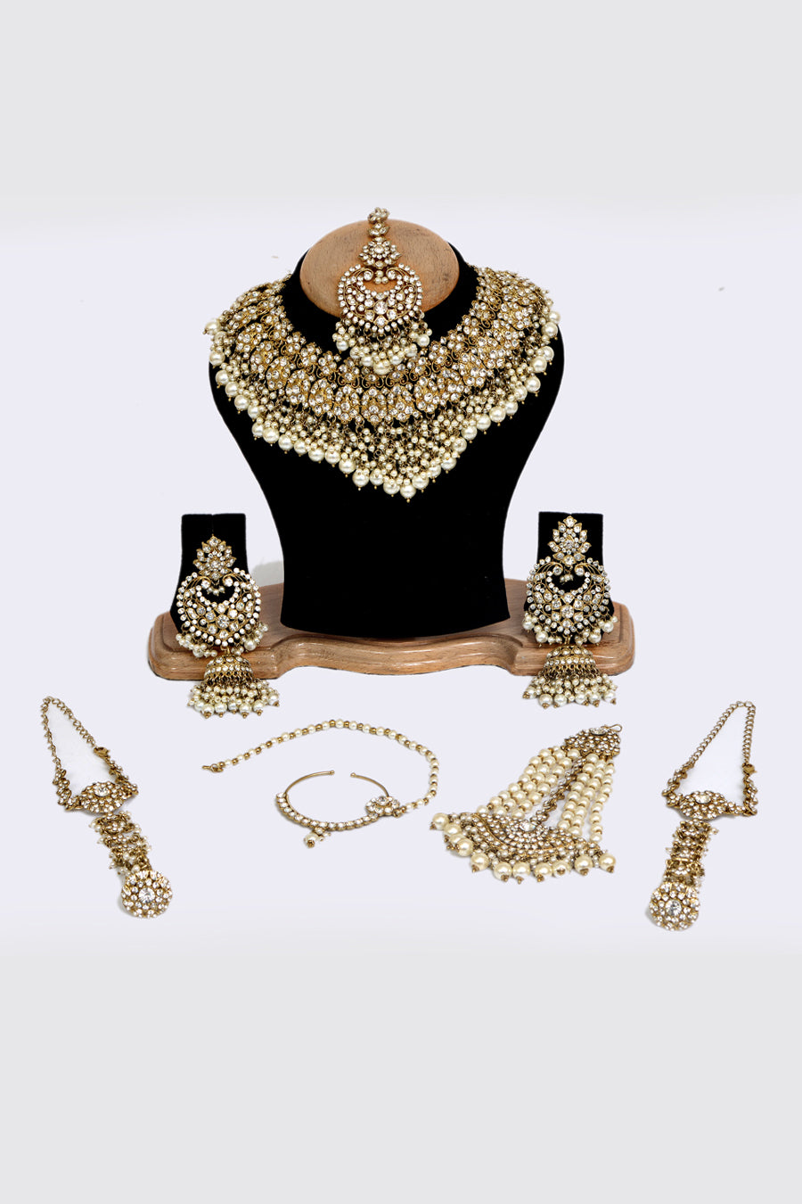 Indulge in elegance with this breathtaking semi bridal jewelry set, adorned with luminous off-white pearls and traditional Kundan work in a royal antique gold finish. This ensemble includes all the essentials to create a full bridal look, ensuring grace from head to toe.