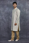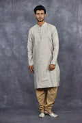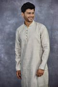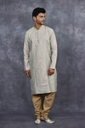 This grey coloured kurta set in self fabric features intricate golden buttons and is paired with a contrasting antique pyjama.