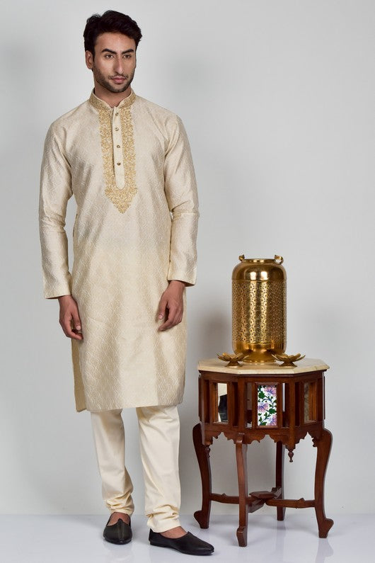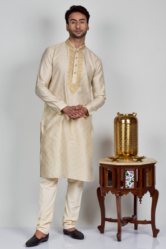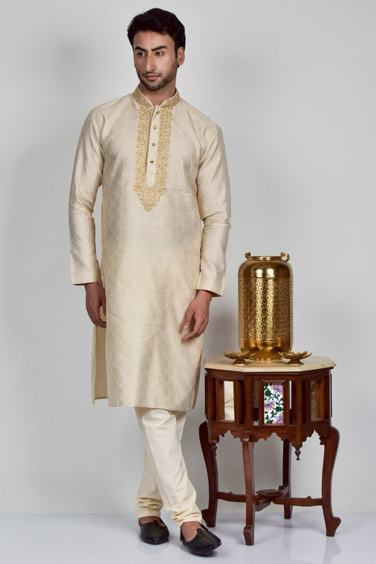 A gold colored royal kurta with embroidery on neckline with gold buttons, paired with contrast pyjama