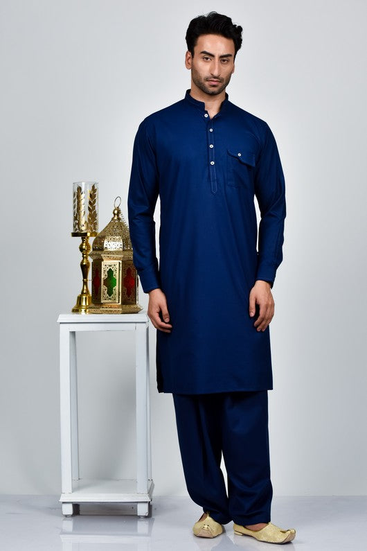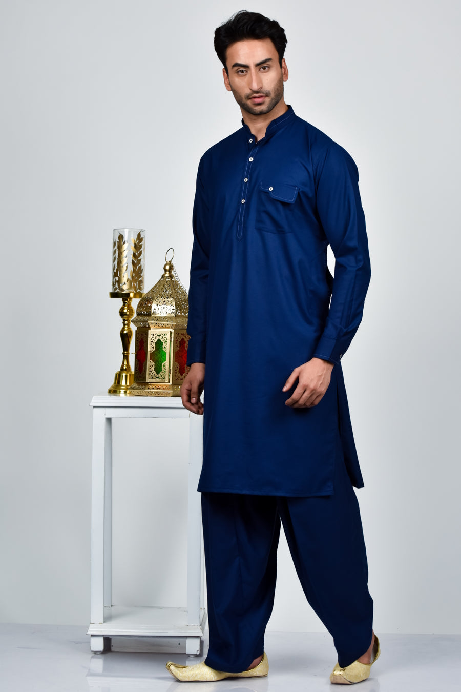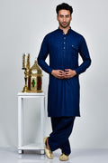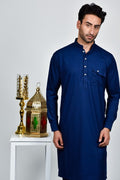 Beautiful midnight blue ban neck kurta with pocket, paired with same color salwar.