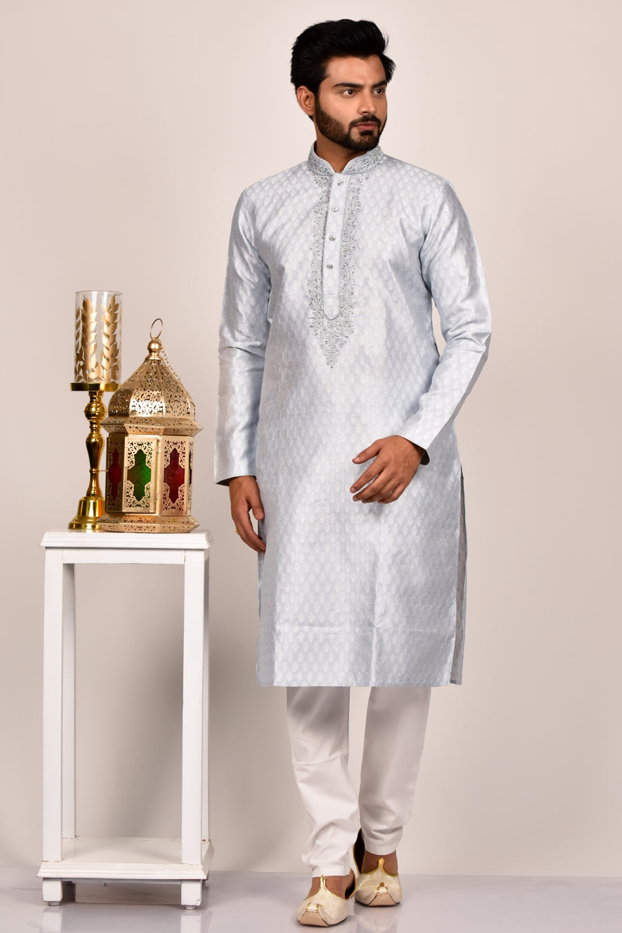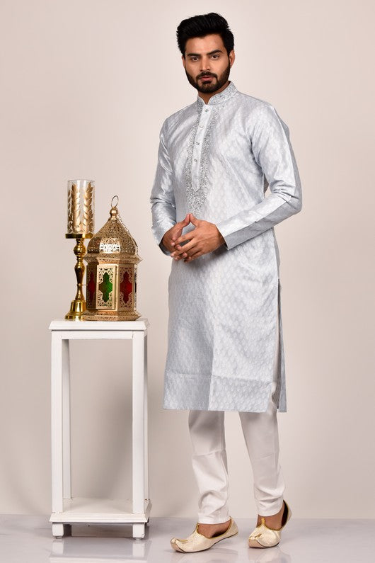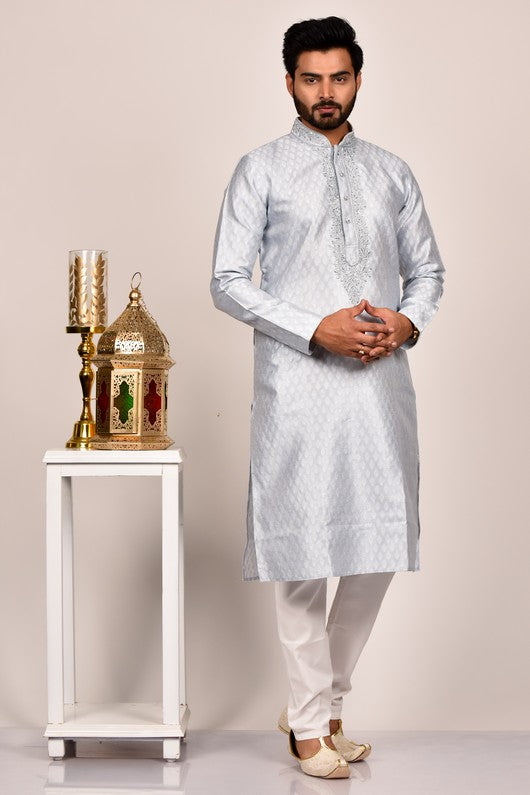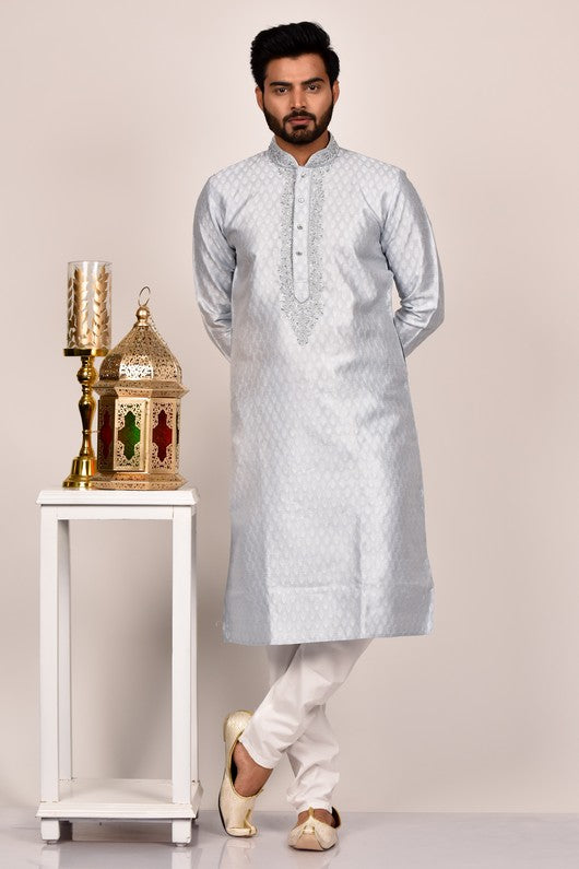 L.Grey color self fabric kurta with silver embroidered ban neck, paired with contrast pyjama.