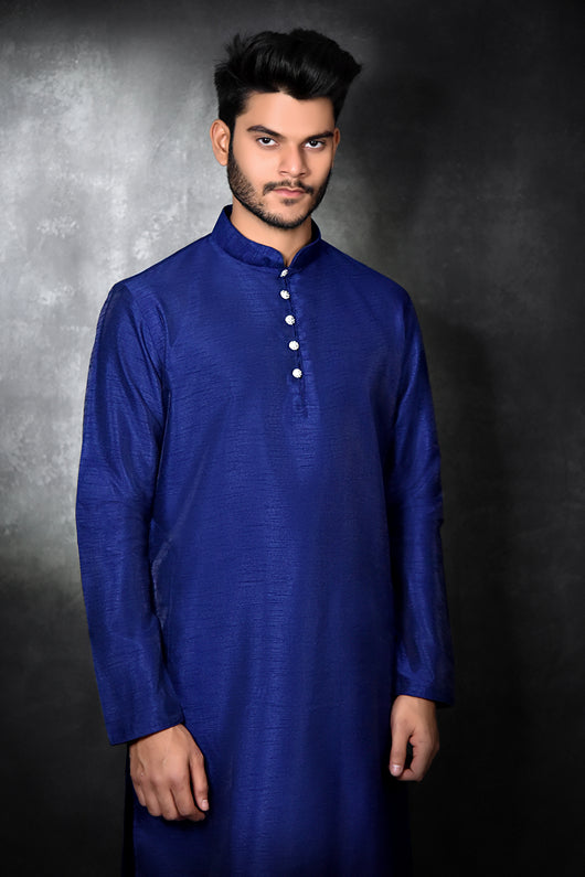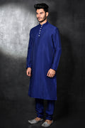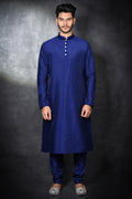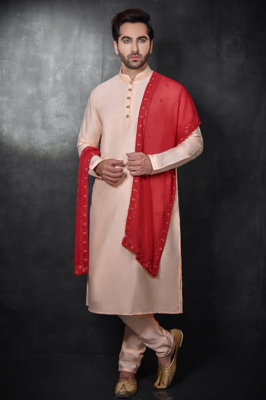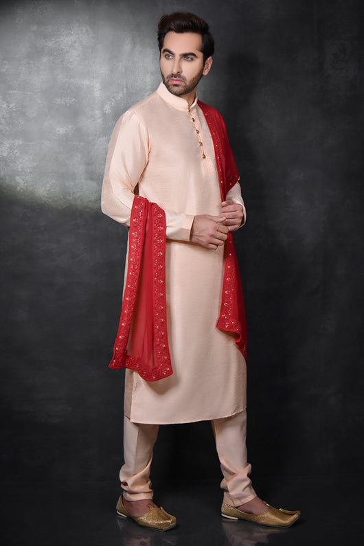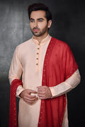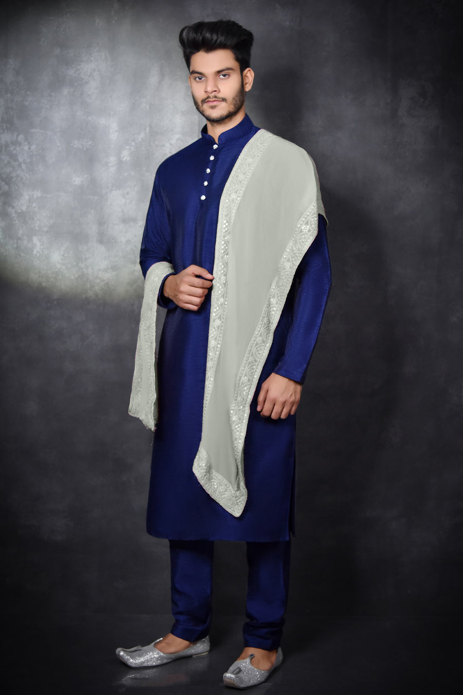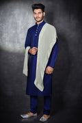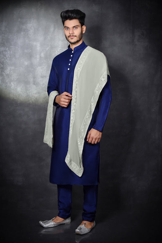 A plain kurta set finished with golden details along the neckline is complimented with a contrasting color stole having embroidered borders.
