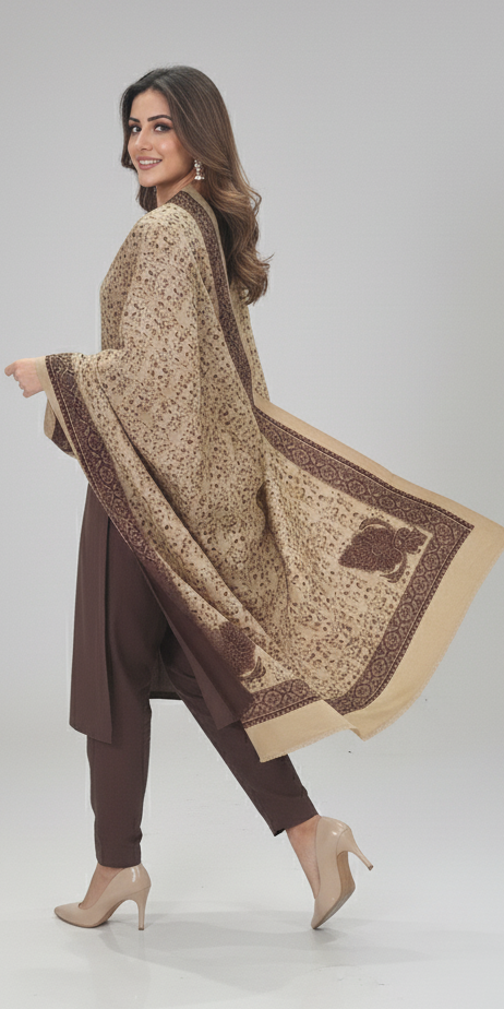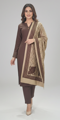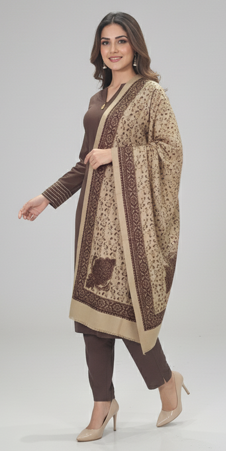 Completing this sensational outfit is a Premium Traditional Shawl in a striking contrast color. This full-size, pashmina-fabric shawl boasts an intricate, classic print concentrated at its four corners, surrounded by a delicate all-over pattern, offering versatility in draping and an undeniable touch of traditional grandeur. Embrace the blend of modern design and timeless elegance with this must-have winter essential.