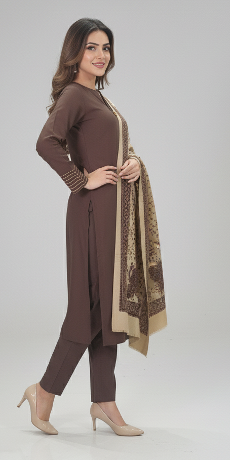 Step into sophisticated comfort with our Premium Ready-to-Wear Winter Rayon Co-ord Set in a rich, inviting Dark Chocolate hue. This exquisite ensemble is meticulously crafted from luxurious, soft winter rayon fabric, designed to offer both warmth and effortless style.