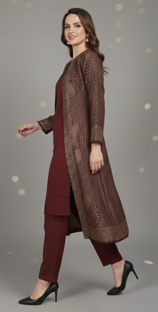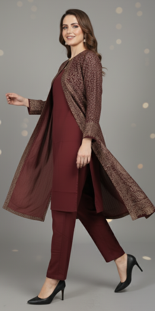 This set is thoughtfully designed for cooler weather and sophisticated gatherings. The cozy, open-front jacket is perfectly paired with meticulously tailored trousers and a complementary inner top crafted from smooth, soft Rayon. This combination ensures a beautiful, non-clingy drape, providing comfort and fluidity while maintaining a clean, contemporary line. It is the definitive garment for making an elegant statement during the autumn and winter seasons.