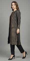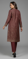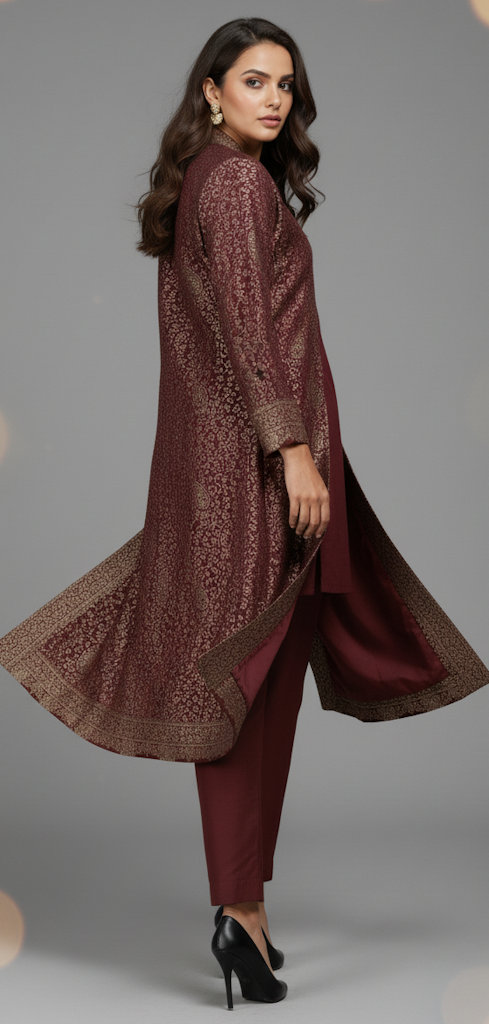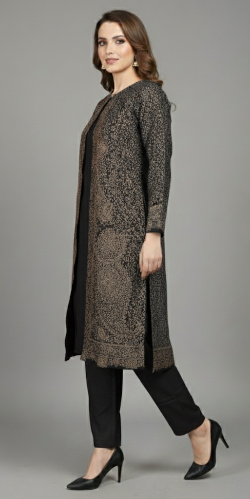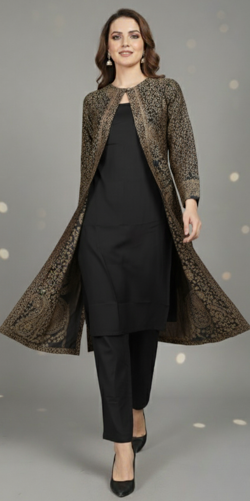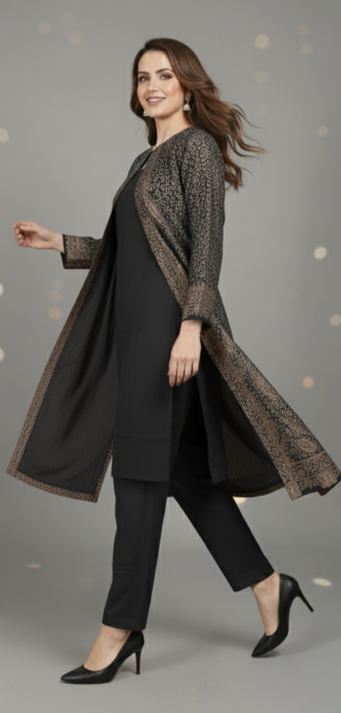 At the heart of this stunning ensemble is the longline jacket, featuring an intricate, all-over traditional woven pattern reminiscent of luxurious Pashmina shawls. Unlike ordinary prints, this detailed motif is masterfully woven directly into the fabric, creating a rich, dimensional texture and an enduring sense of warmth that is both seen and felt. This masterful technique brings a legacy of textile craft into a distinctly modern, structured jacket.