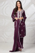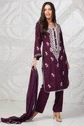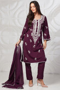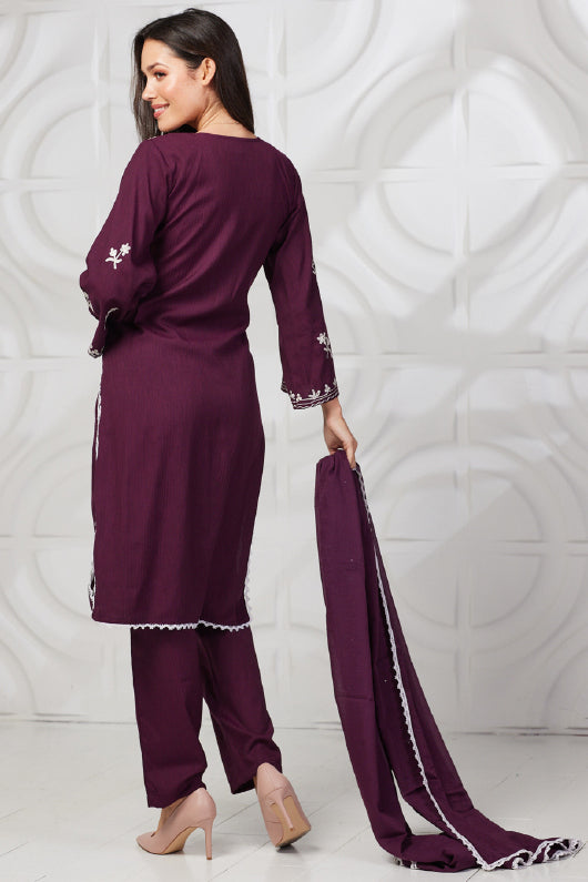 Beautiful Wine color kurta with white embroidery, It is paired with plain trouser with plain malmal dupatta with white lace on four side.