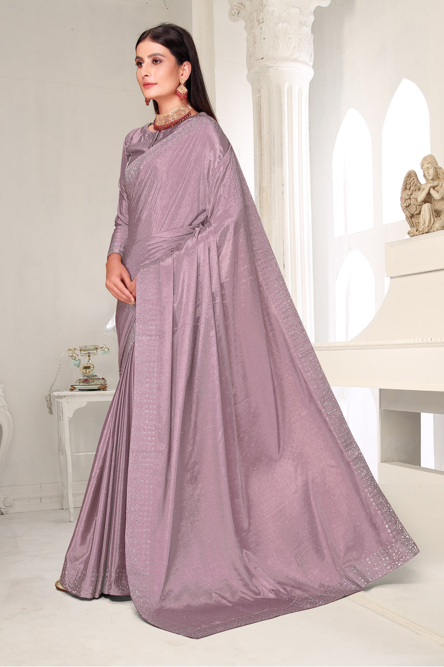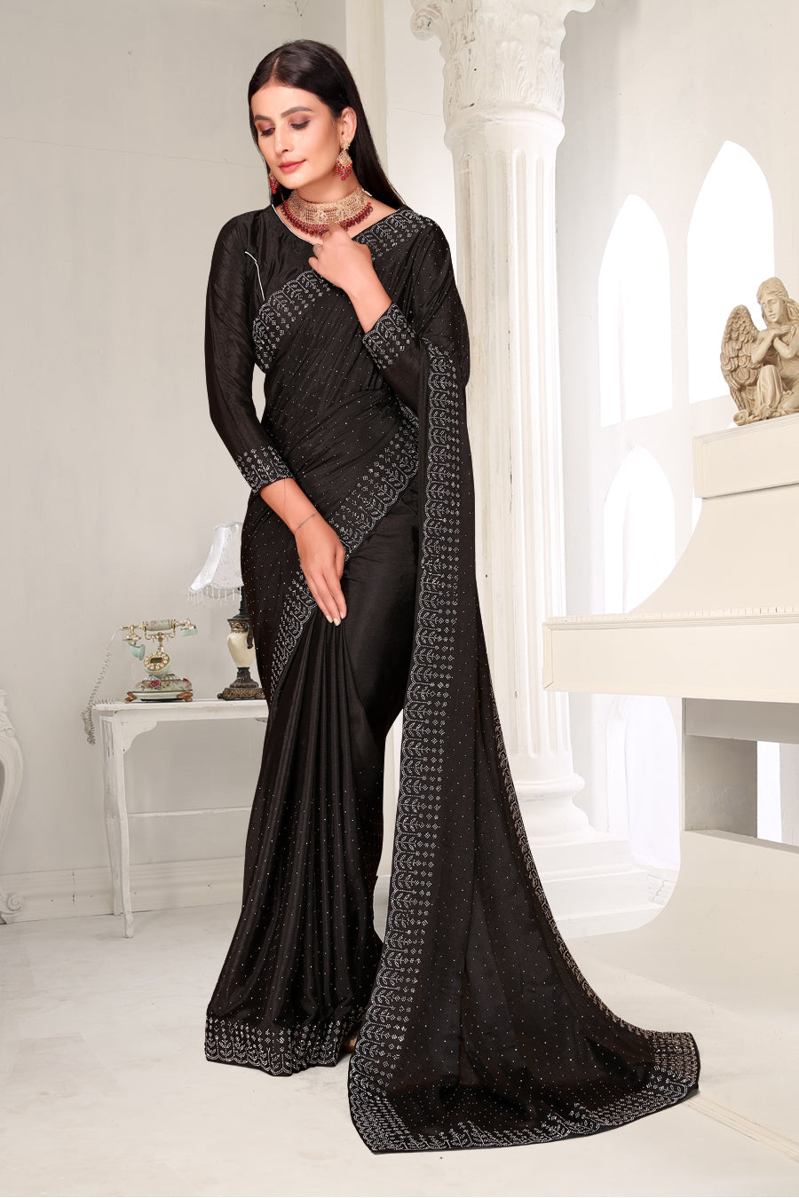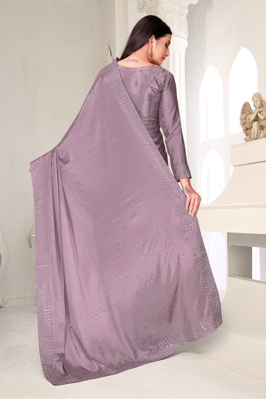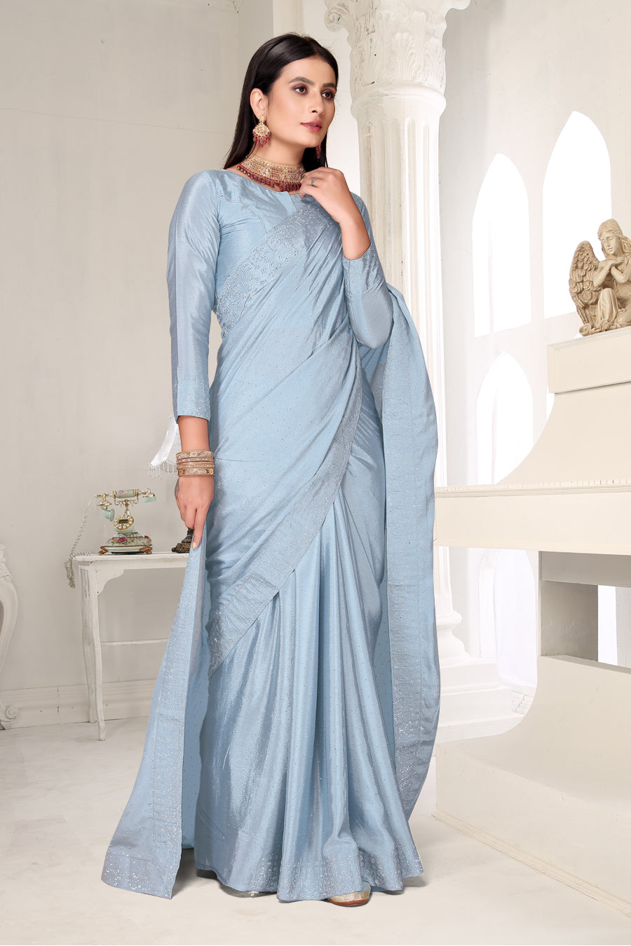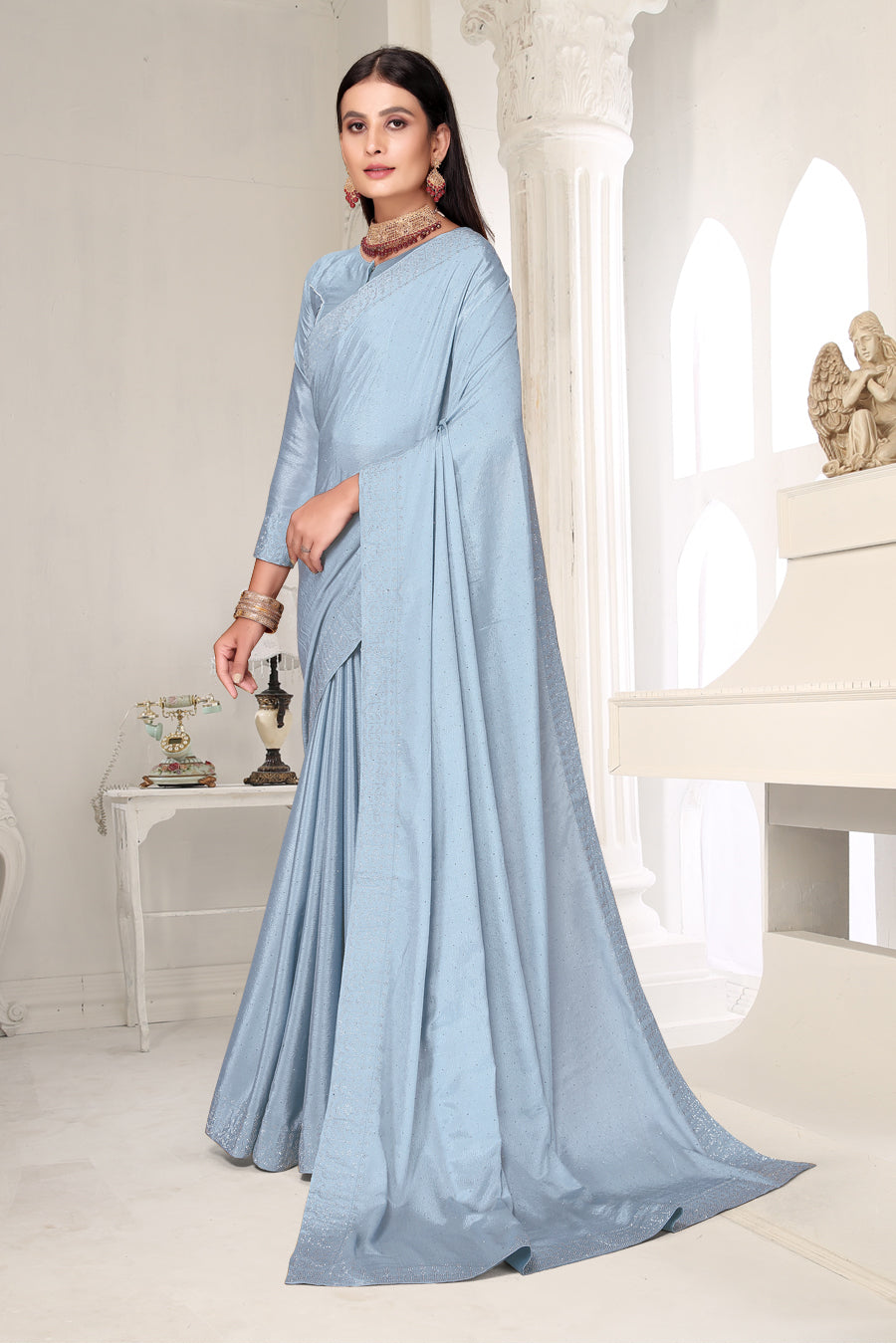 Turn heads with this exquisite saree crafted in luxurious Vichitra fabric, adorned with shimmering all-over Silver stone detailing. The delicate sparkle adds a touch of glamour, while the intricately designed Silver border on all edges elevates its elegance. Paired with a matching blouse featuring coordinated border work on the sleeves and back, this ensemble is perfect for weddings, evening soirées, and festive celebrations.  Effortlessly graceful, this saree blends traditional charm with contemporary sparkle.