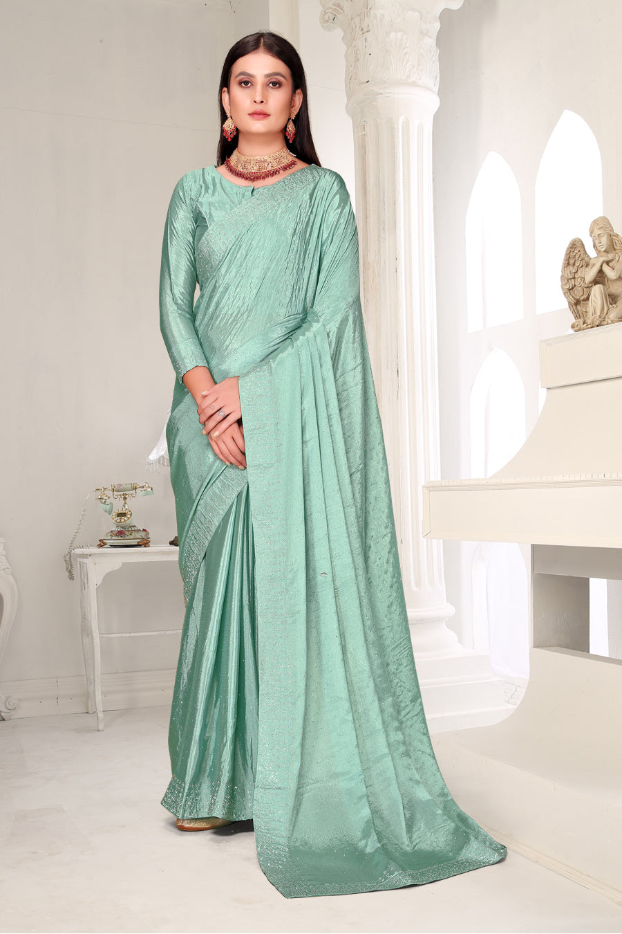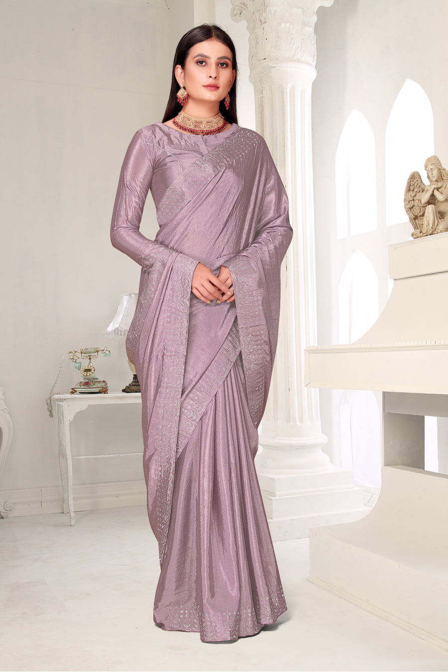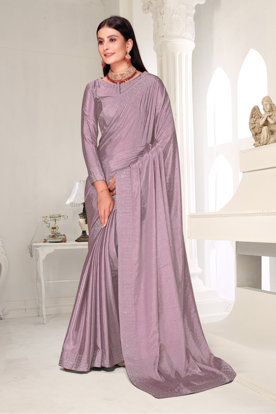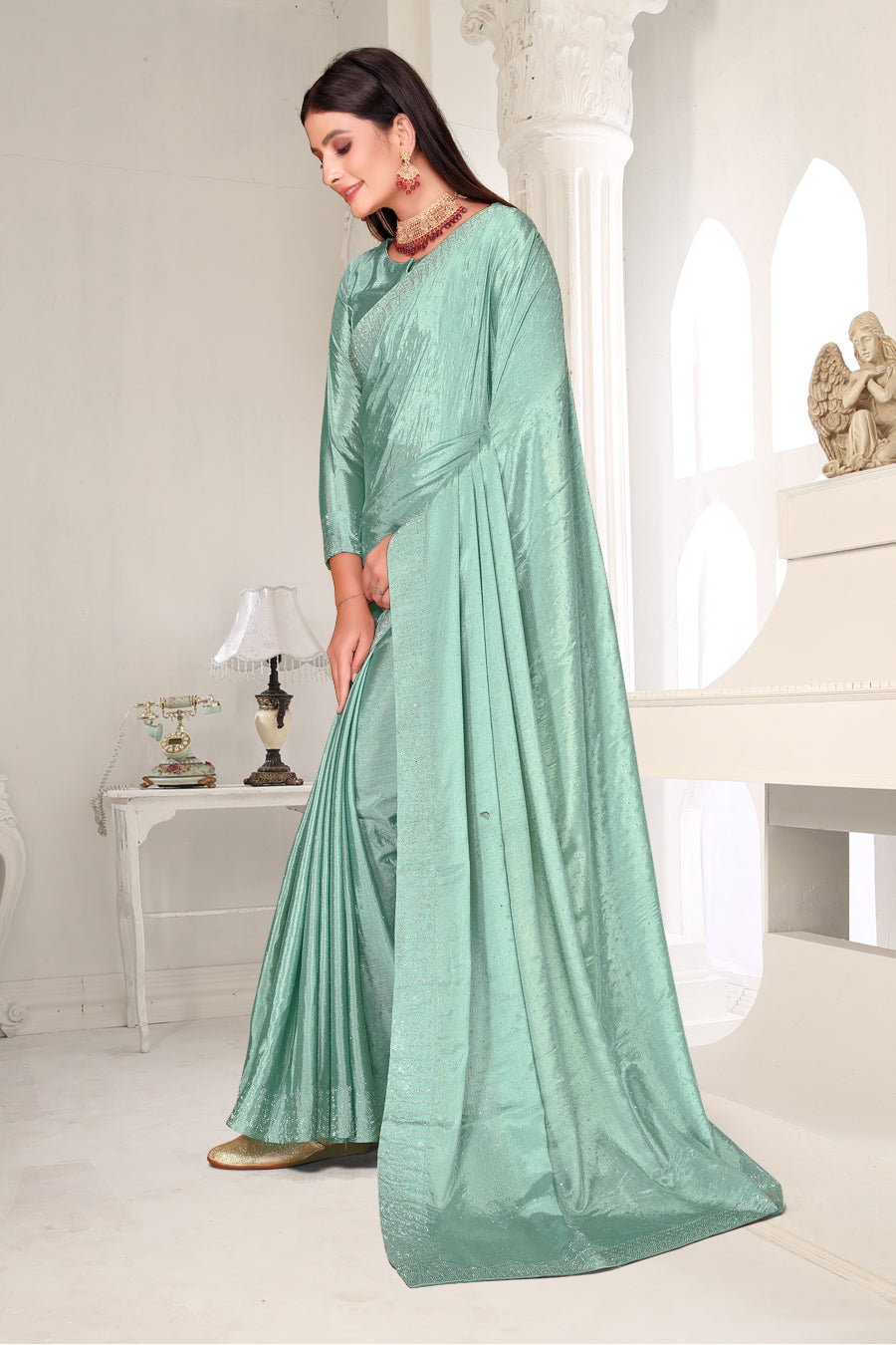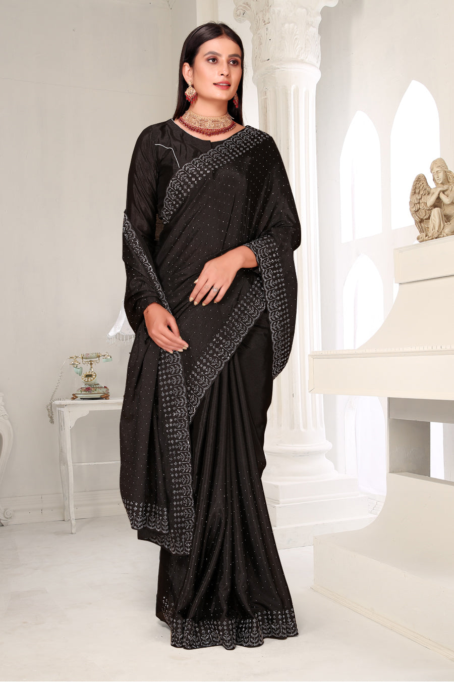 Turn heads with this exquisite saree crafted in luxurious Vichitra fabric, adorned with shimmering all-over Silver stone detailing. The delicate sparkle adds a touch of glamour, while the intricately designed Silver border on all edges elevates its elegance. Paired with a matching blouse featuring coordinated border work on the sleeves and back, this ensemble is perfect for weddings, evening soirées, and festive celebrations.  Effortlessly graceful, this saree blends traditional charm with contemporary sparkle.