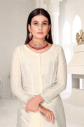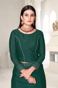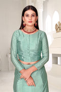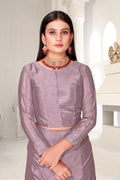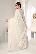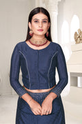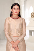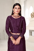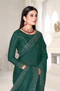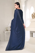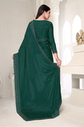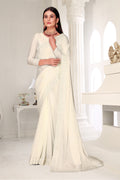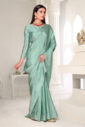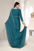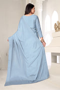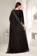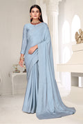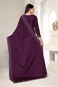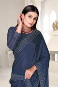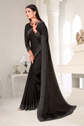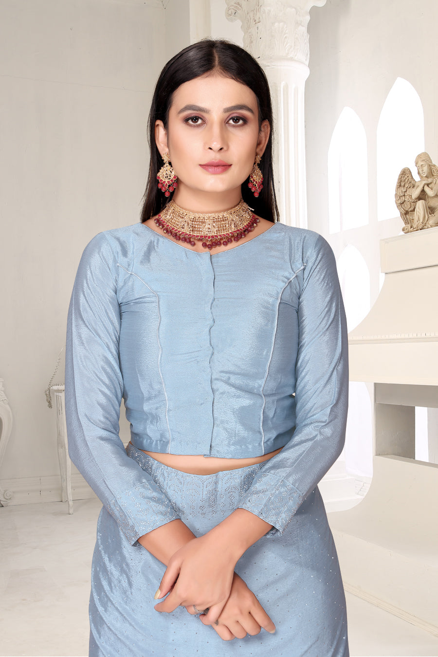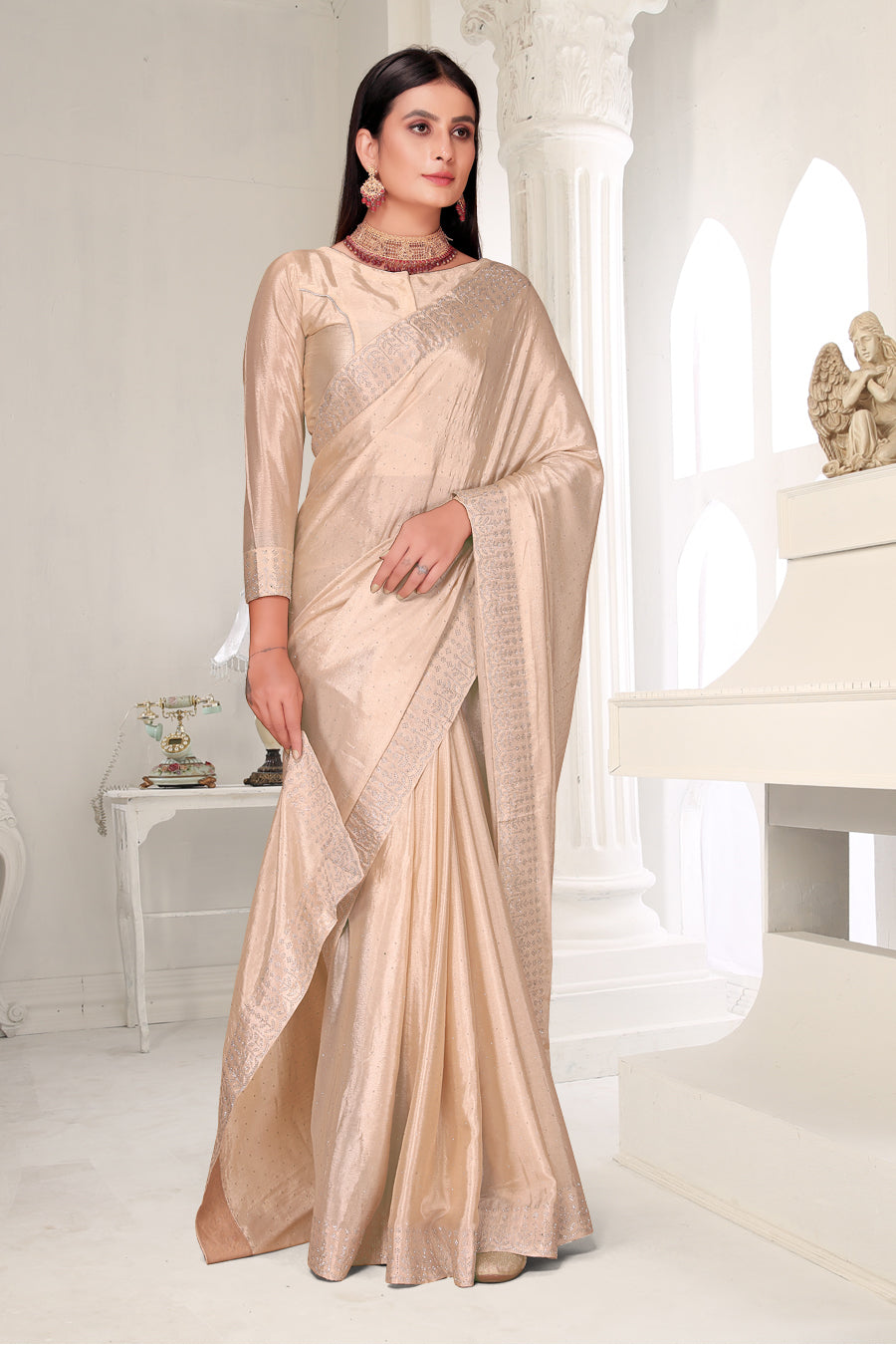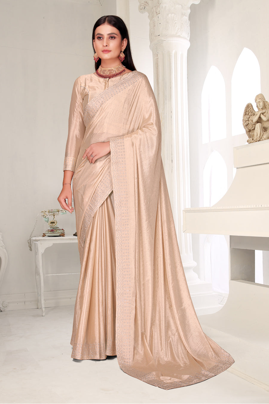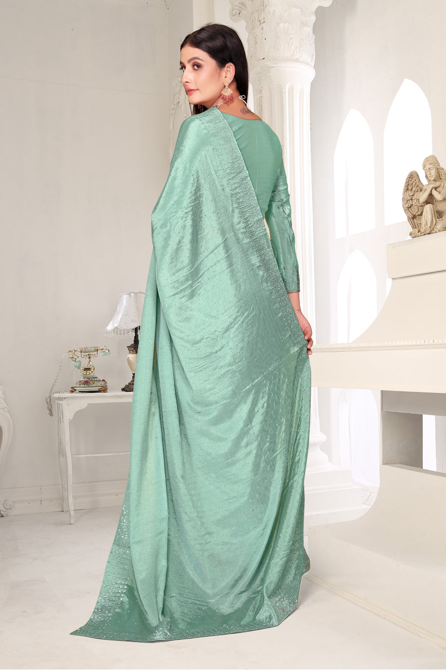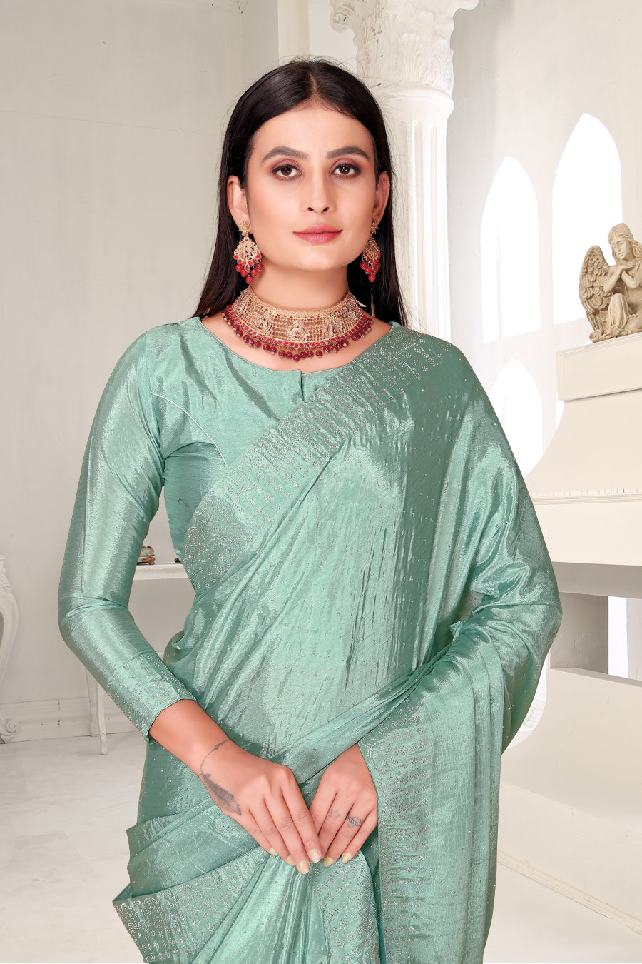 Turn heads with this exquisite saree crafted in luxurious Vichitra fabric, adorned with shimmering all-over Silver stone detailing. The delicate sparkle adds a touch of glamour, while the intricately designed Silver border on all edges elevates its elegance. Paired with a matching blouse featuring coordinated border work on the sleeves and back, this ensemble is perfect for weddings, evening soirées, and festive celebrations.  Effortlessly graceful, this saree blends traditional charm with contemporary sparkle.