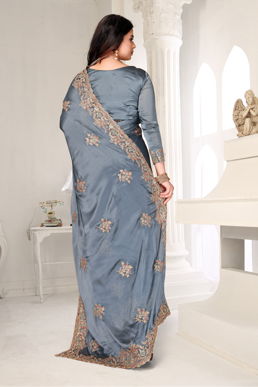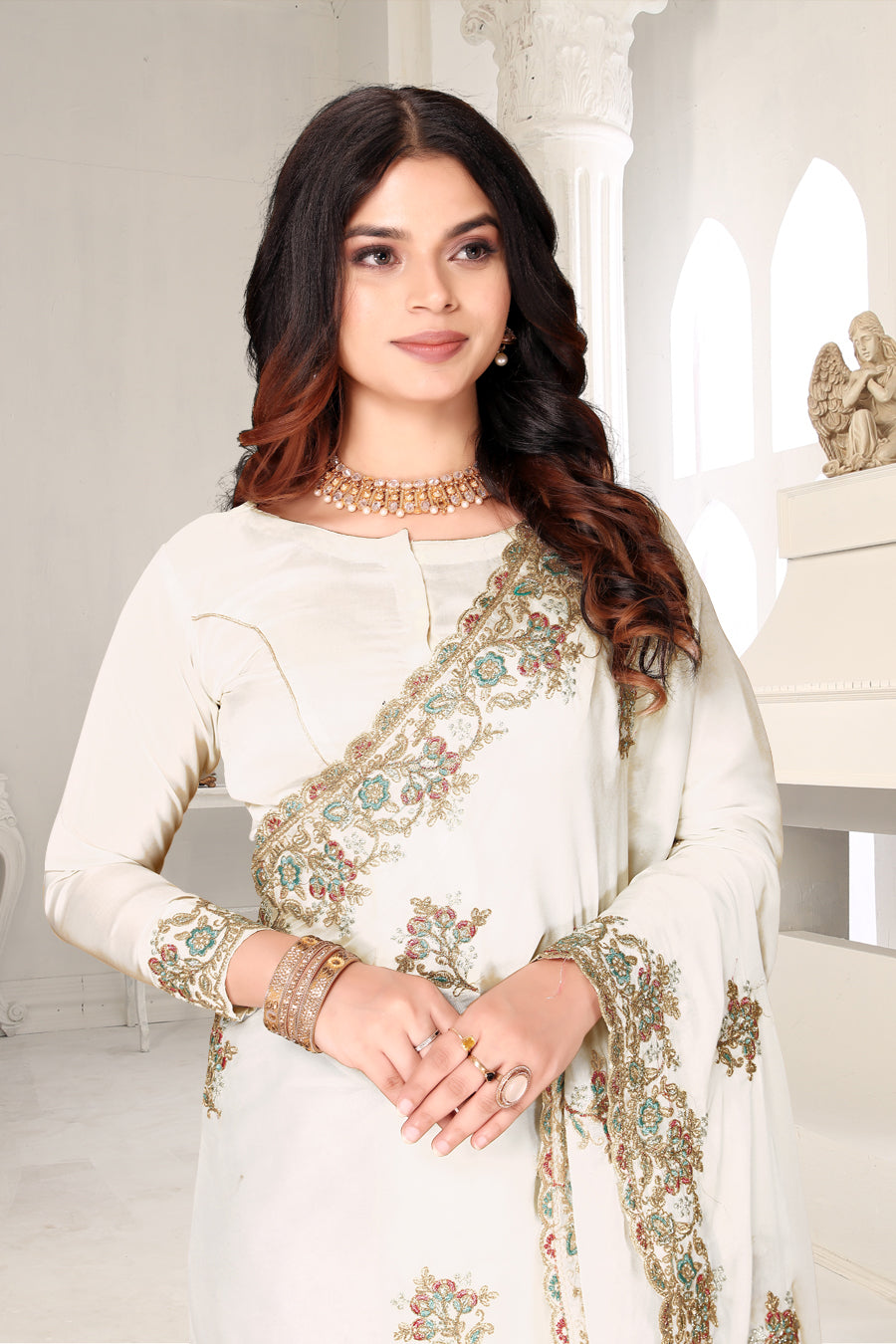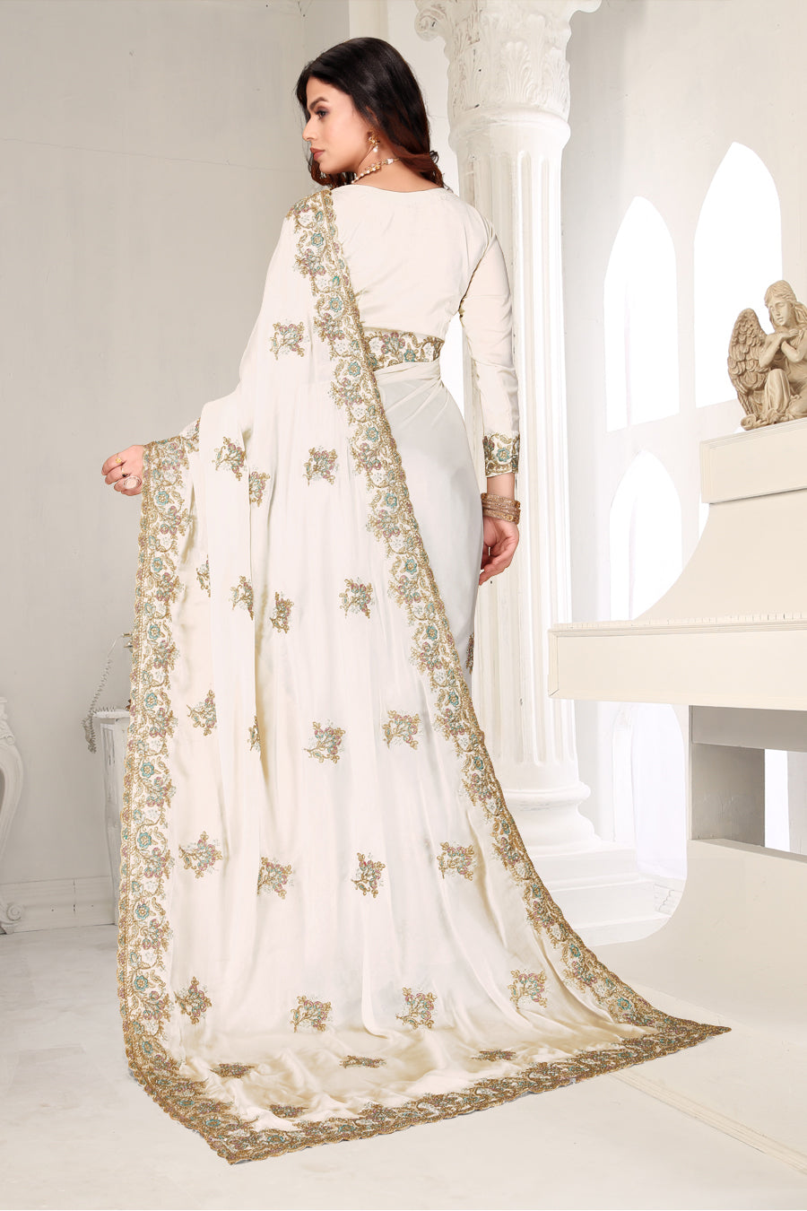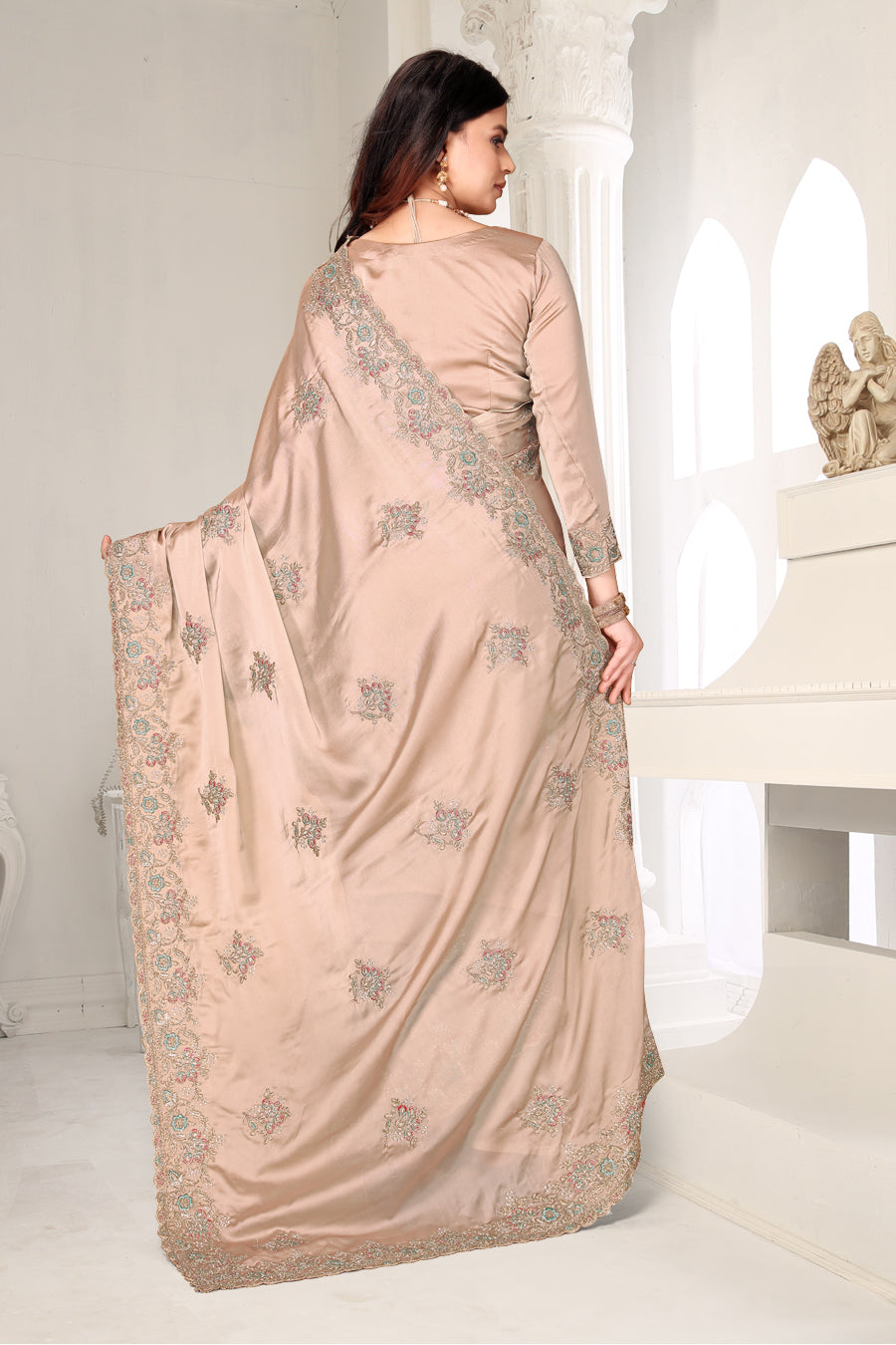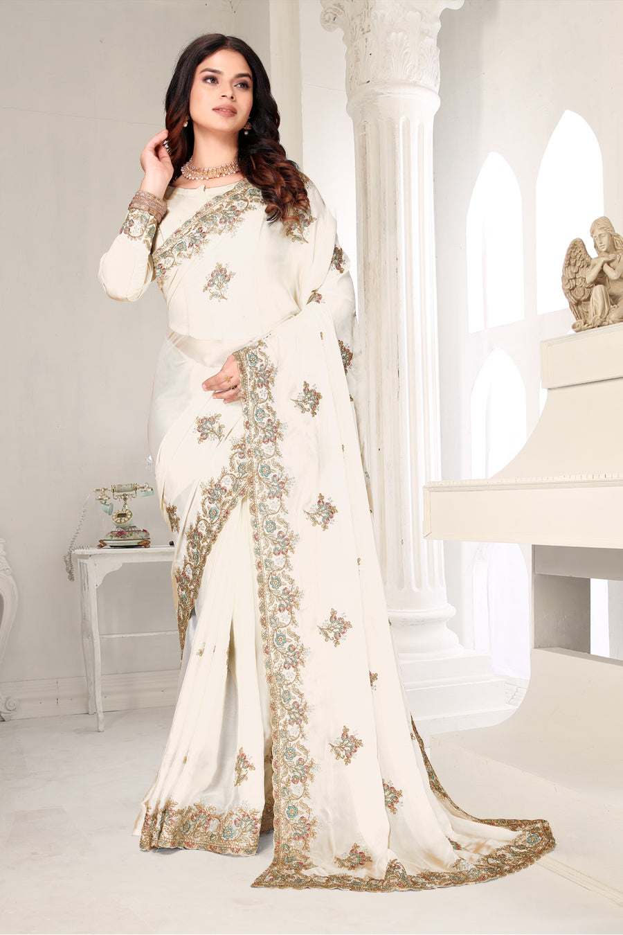 Grace and grandeur meet in this exquisite saree, adorned with intricately embroidered floral motifs and a richly detailed border. Made from luxurious silk fabric, this saree exudes sophistication and is ideal for weddings, festive celebrations, or grand evening functions. The subtle pastel embroidery in hues of gold, green, and pink adds a vintage charm, making it a timeless addition to your ethnic collection.