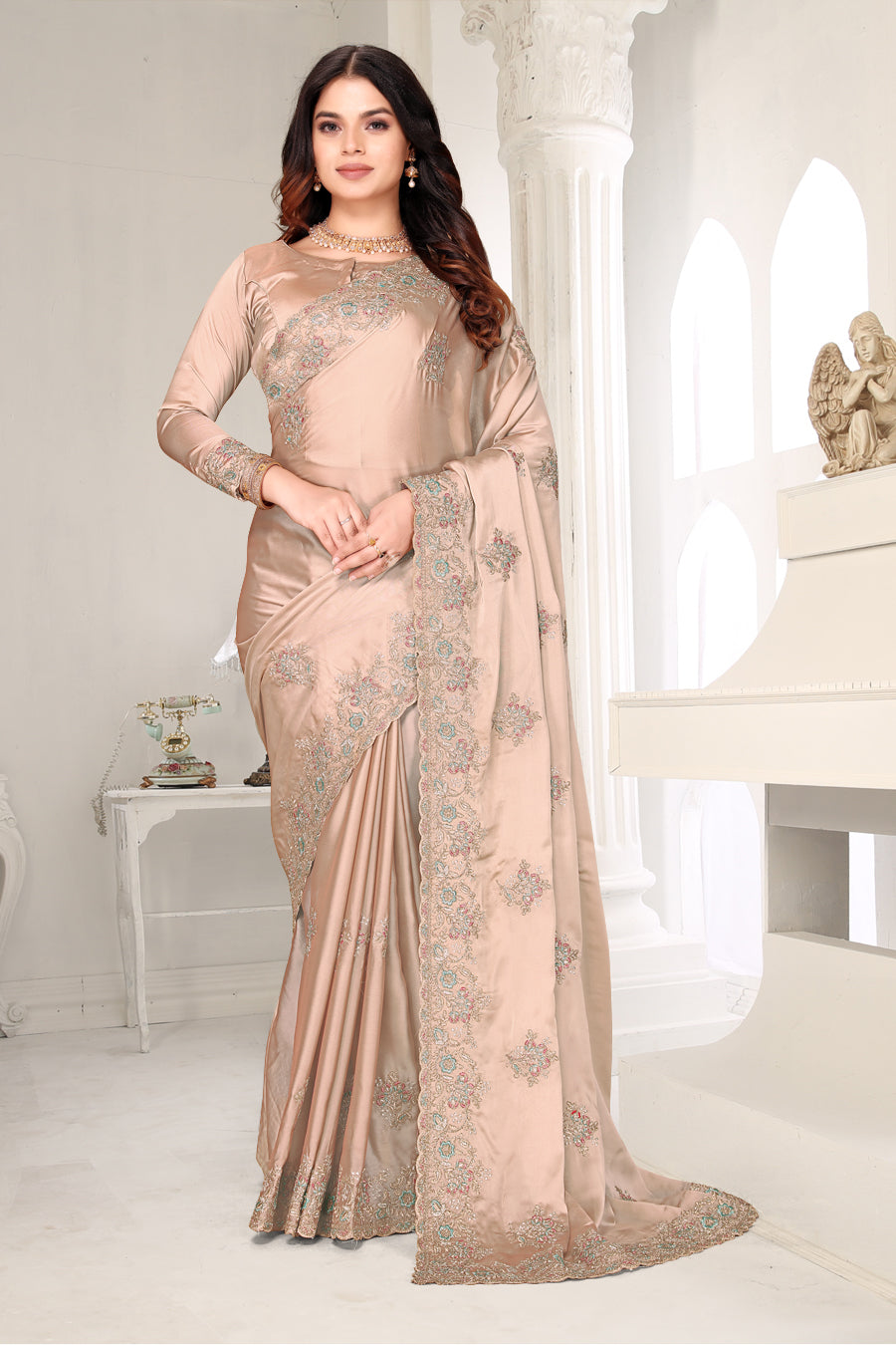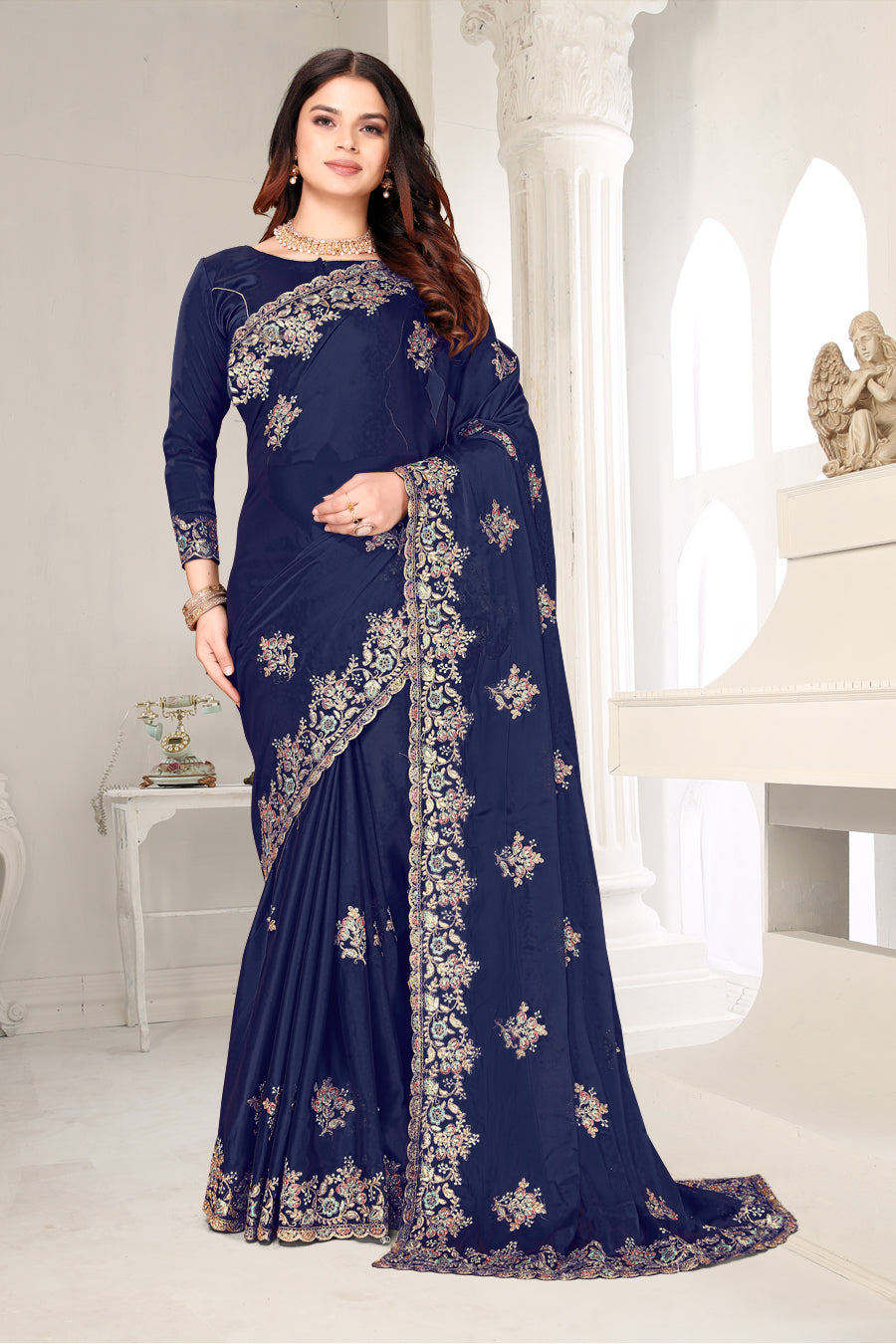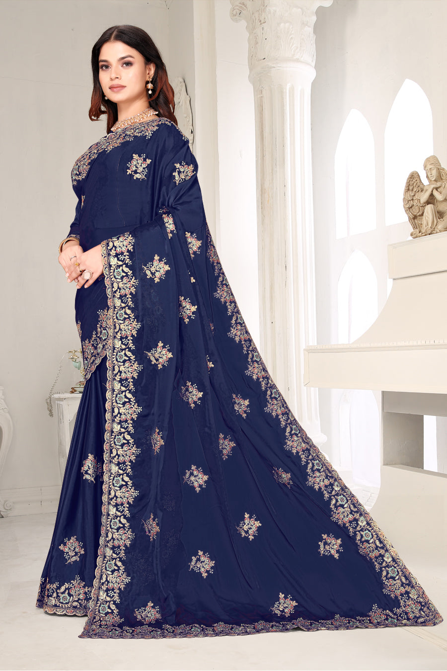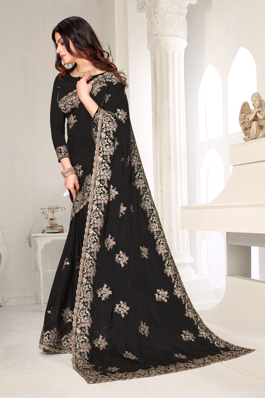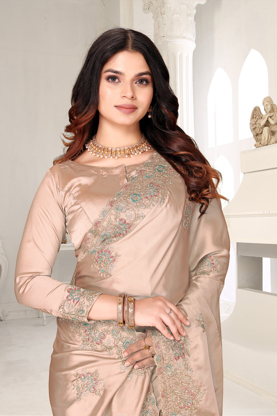 Grace and grandeur meet in this exquisite saree, adorned with intricately embroidered floral motifs and a richly detailed border. Made from luxurious silk fabric, this saree exudes sophistication and is ideal for weddings, festive celebrations, or grand evening functions. The subtle pastel embroidery in hues of gold, green, and pink adds a vintage charm, making it a timeless addition to your ethnic collection.