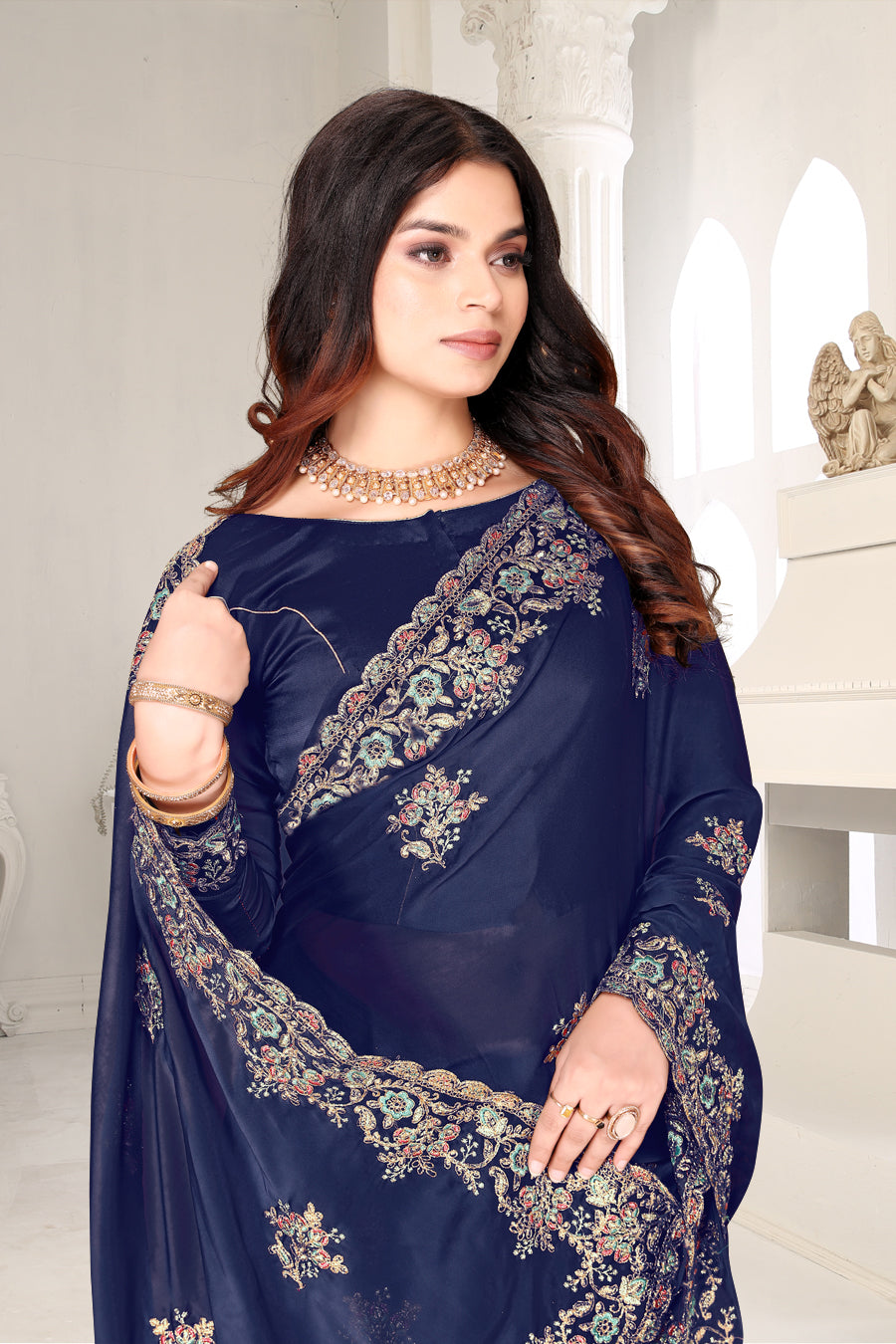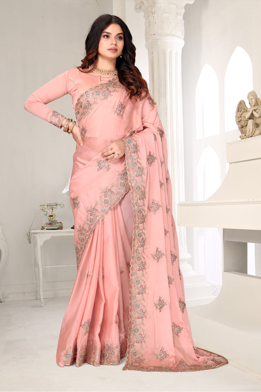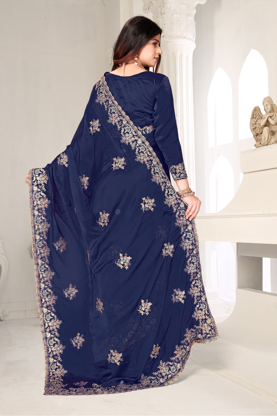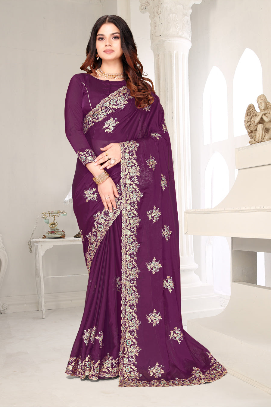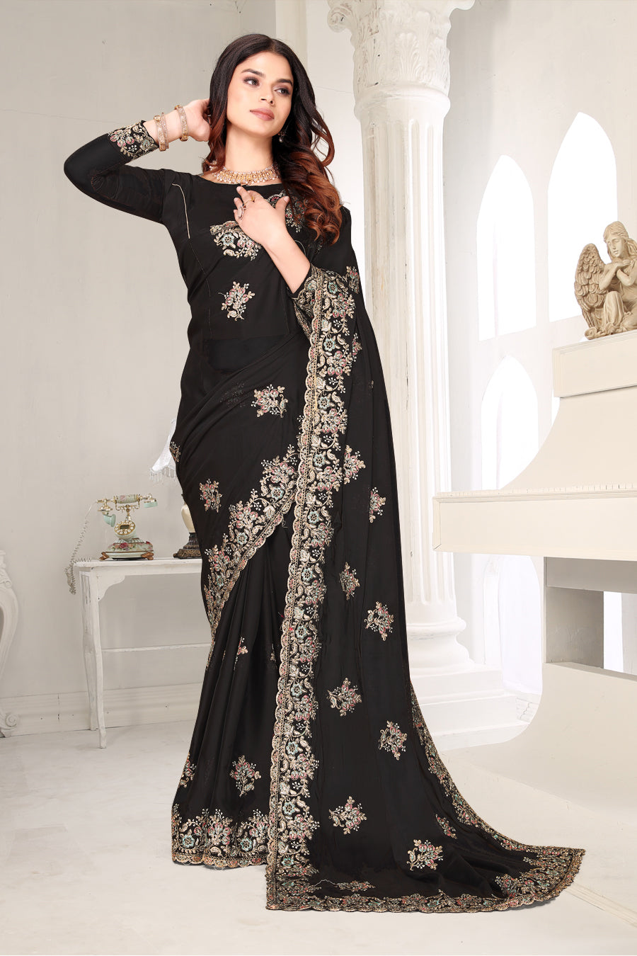 Grace and grandeur meet in this exquisite saree, adorned with intricately embroidered floral motifs and a richly detailed border. Made from luxurious silk fabric, this saree exudes sophistication and is ideal for weddings, festive celebrations, or grand evening functions. The subtle pastel embroidery in hues of gold, green, and pink adds a vintage charm, making it a timeless addition to your ethnic collection.