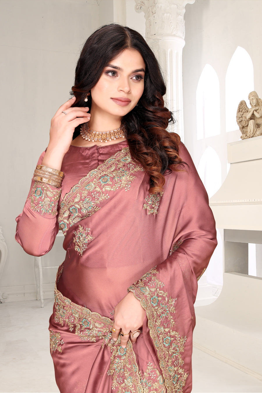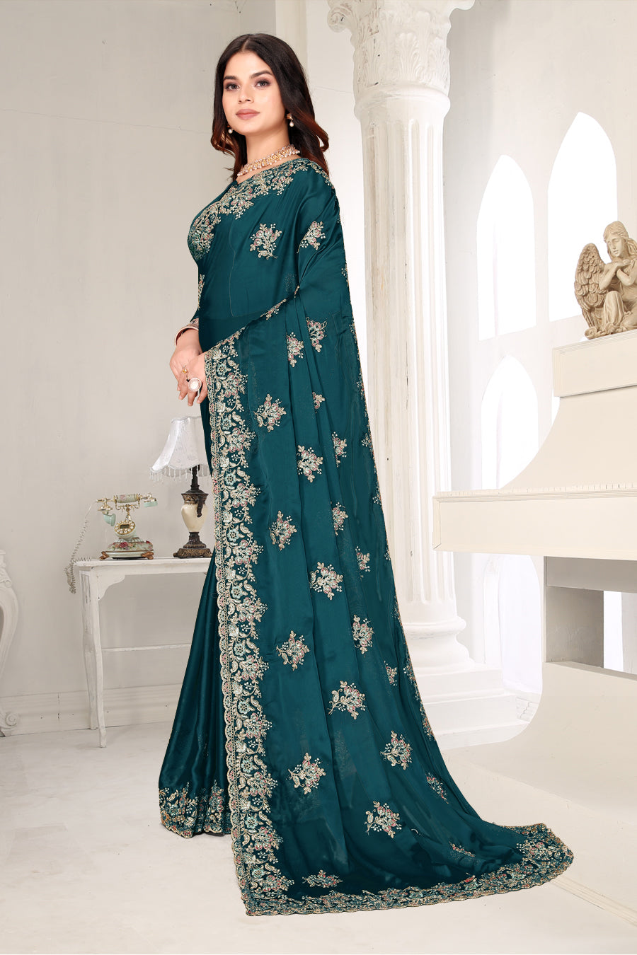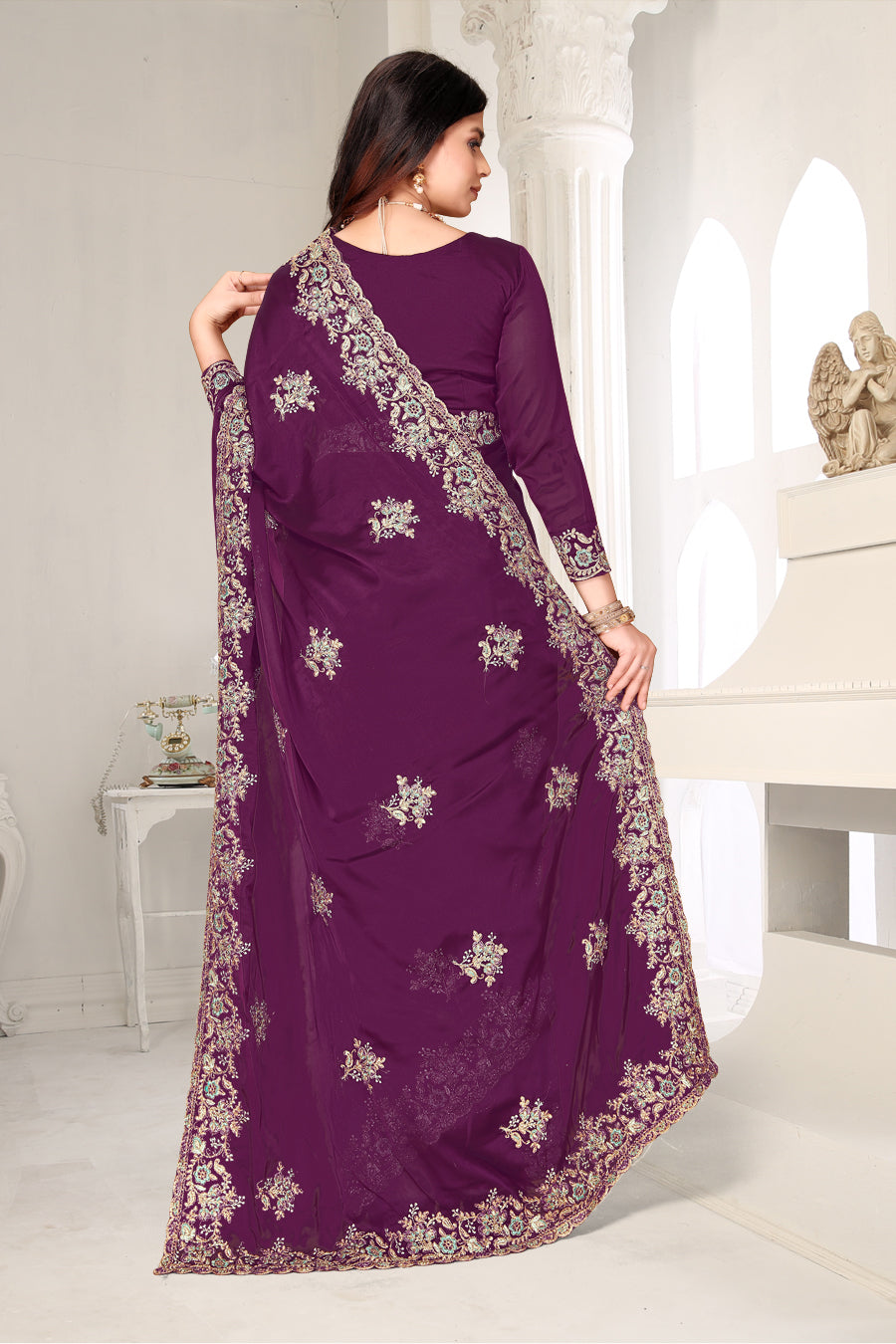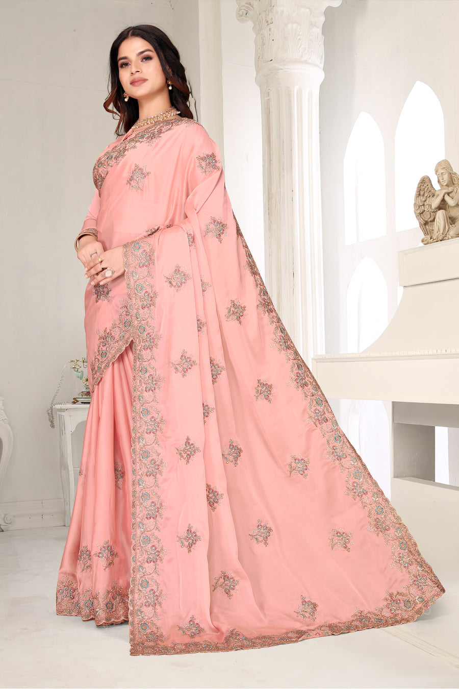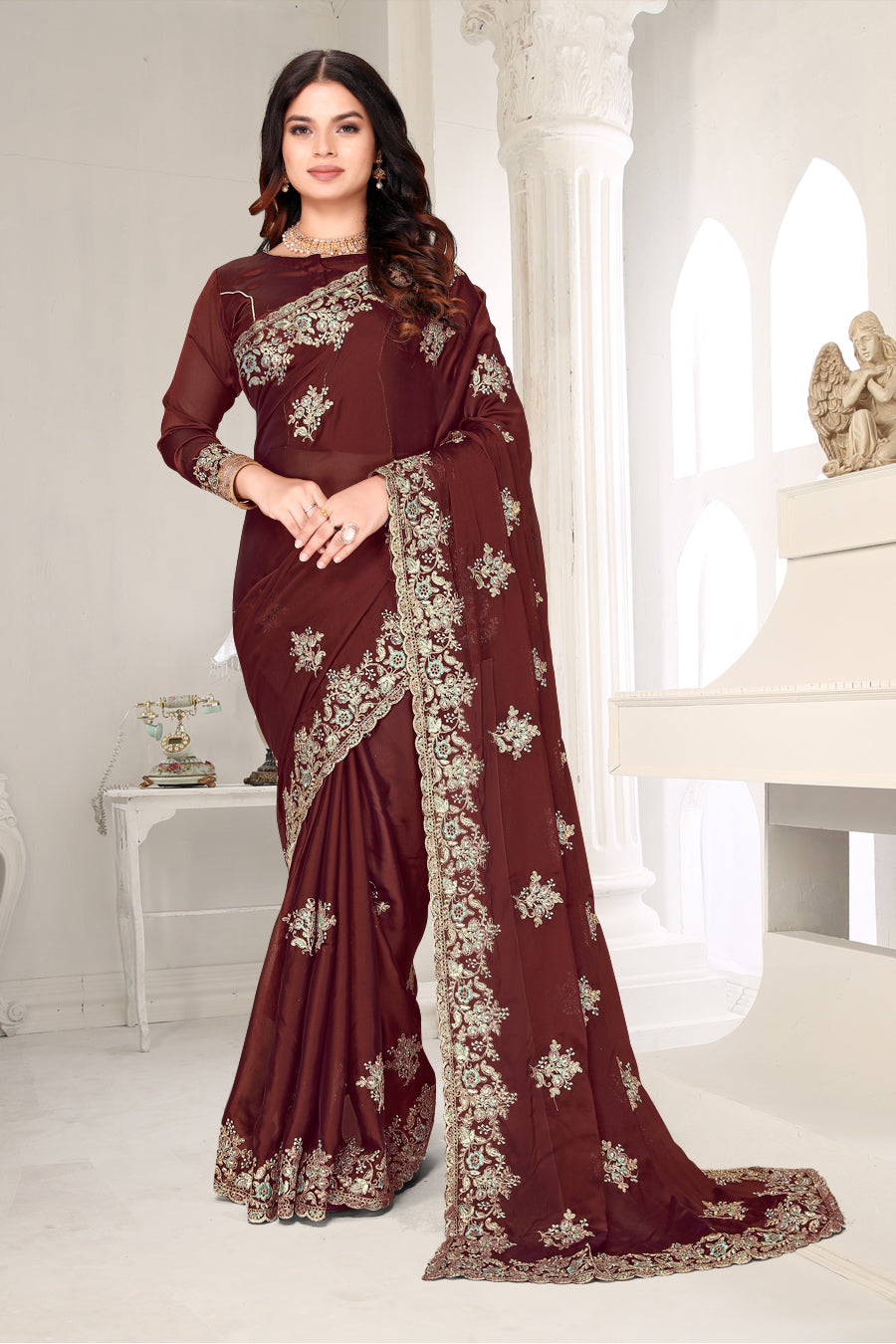 Grace and grandeur meet in this exquisite saree, adorned with intricately embroidered floral motifs and a richly detailed border. Made from luxurious silk fabric, this saree exudes sophistication and is ideal for weddings, festive celebrations, or grand evening functions. The subtle pastel embroidery in hues of gold, green, and pink adds a vintage charm, making it a timeless addition to your ethnic collection.