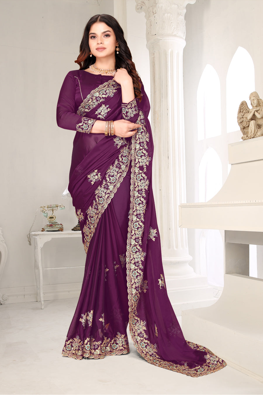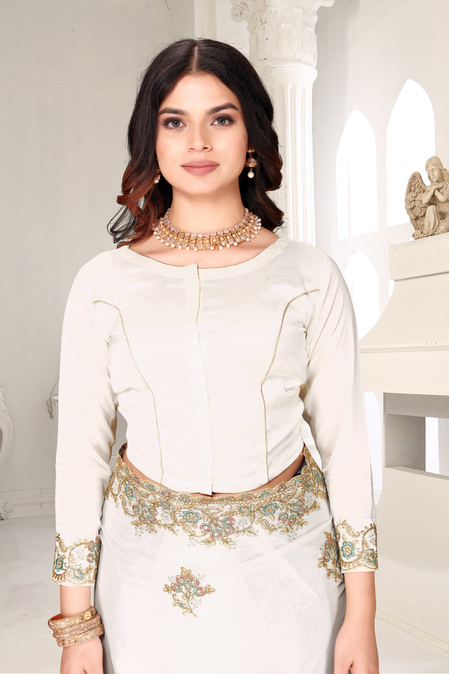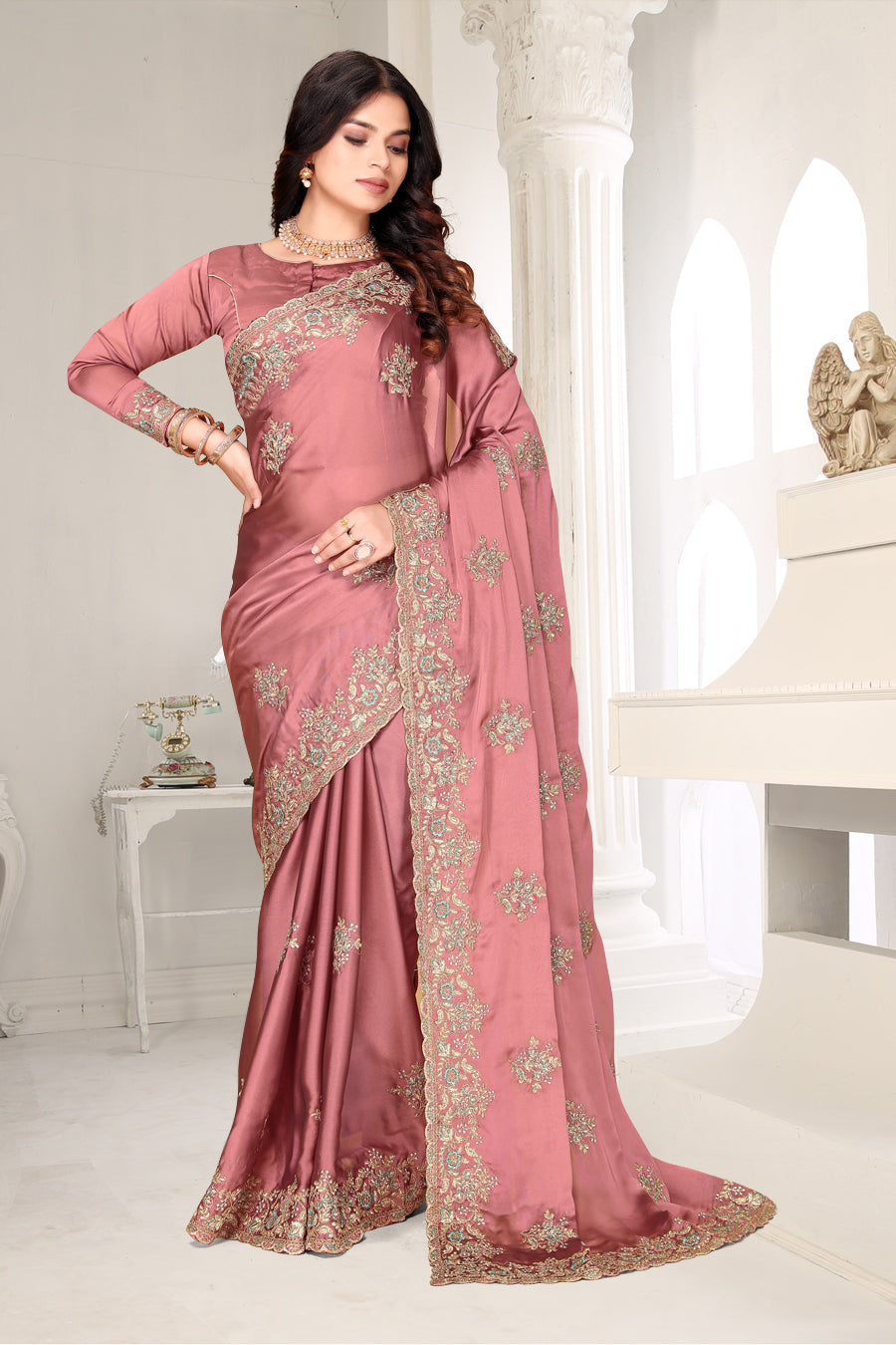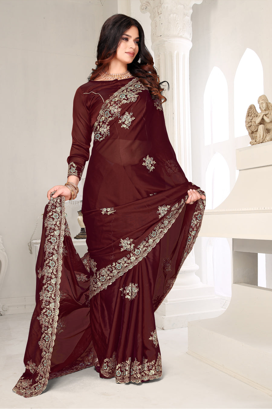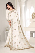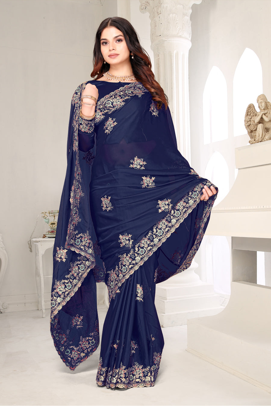 Grace and grandeur meet in this exquisite saree, adorned with intricately embroidered floral motifs and a richly detailed border. Made from luxurious silk fabric, this saree exudes sophistication and is ideal for weddings, festive celebrations, or grand evening functions. The subtle pastel embroidery in hues of gold, green, and pink adds a vintage charm, making it a timeless addition to your ethnic collection.