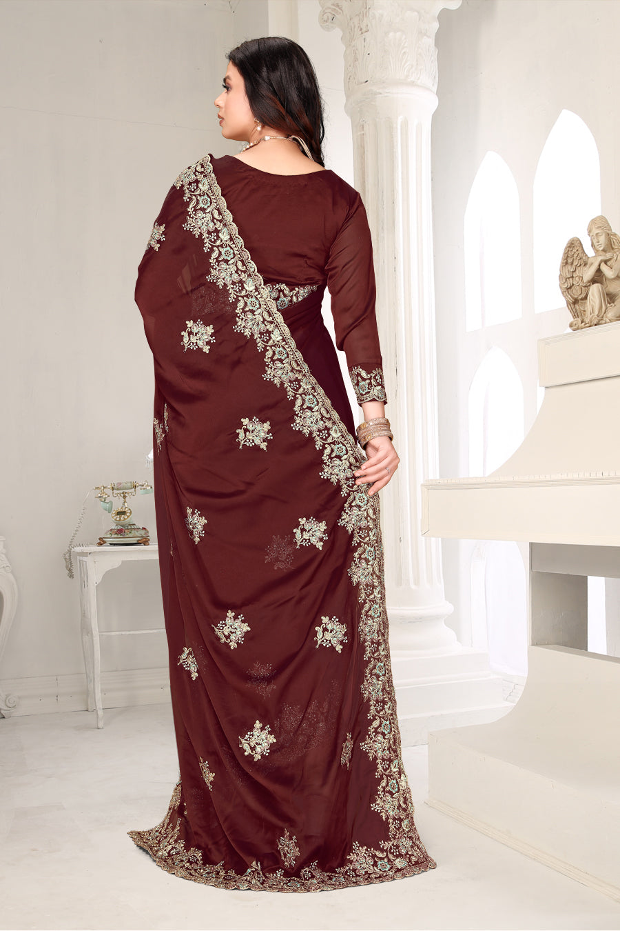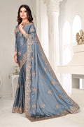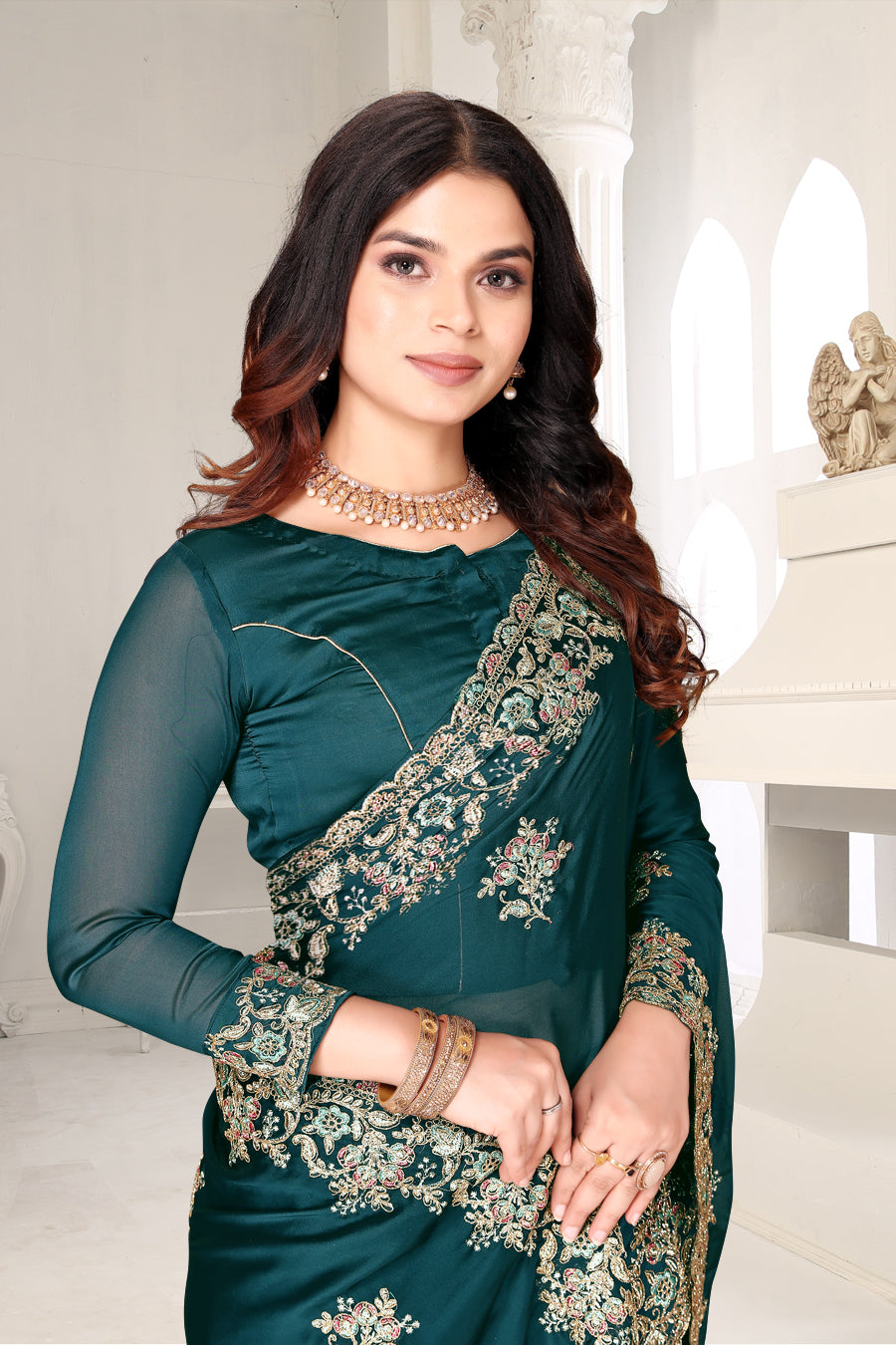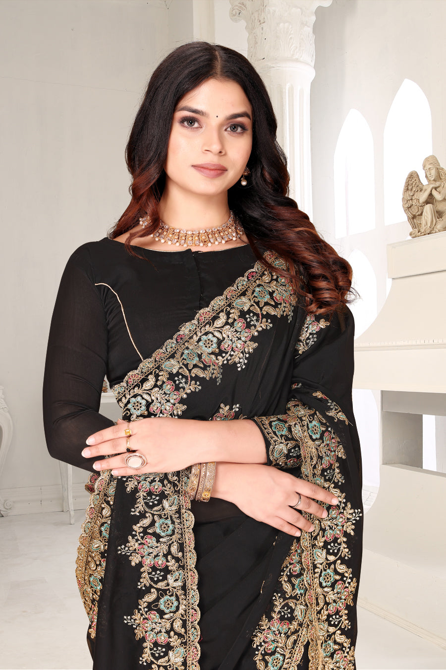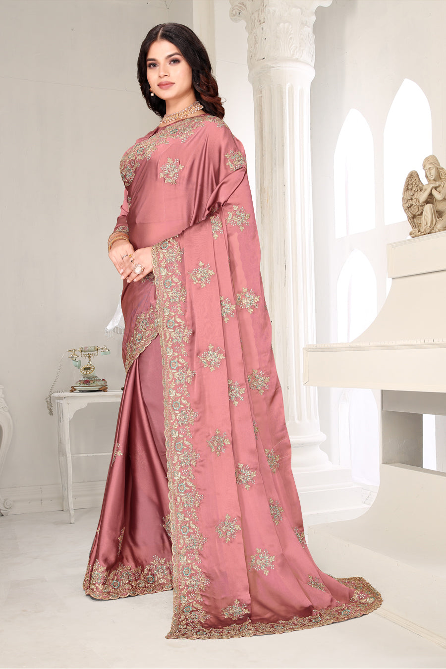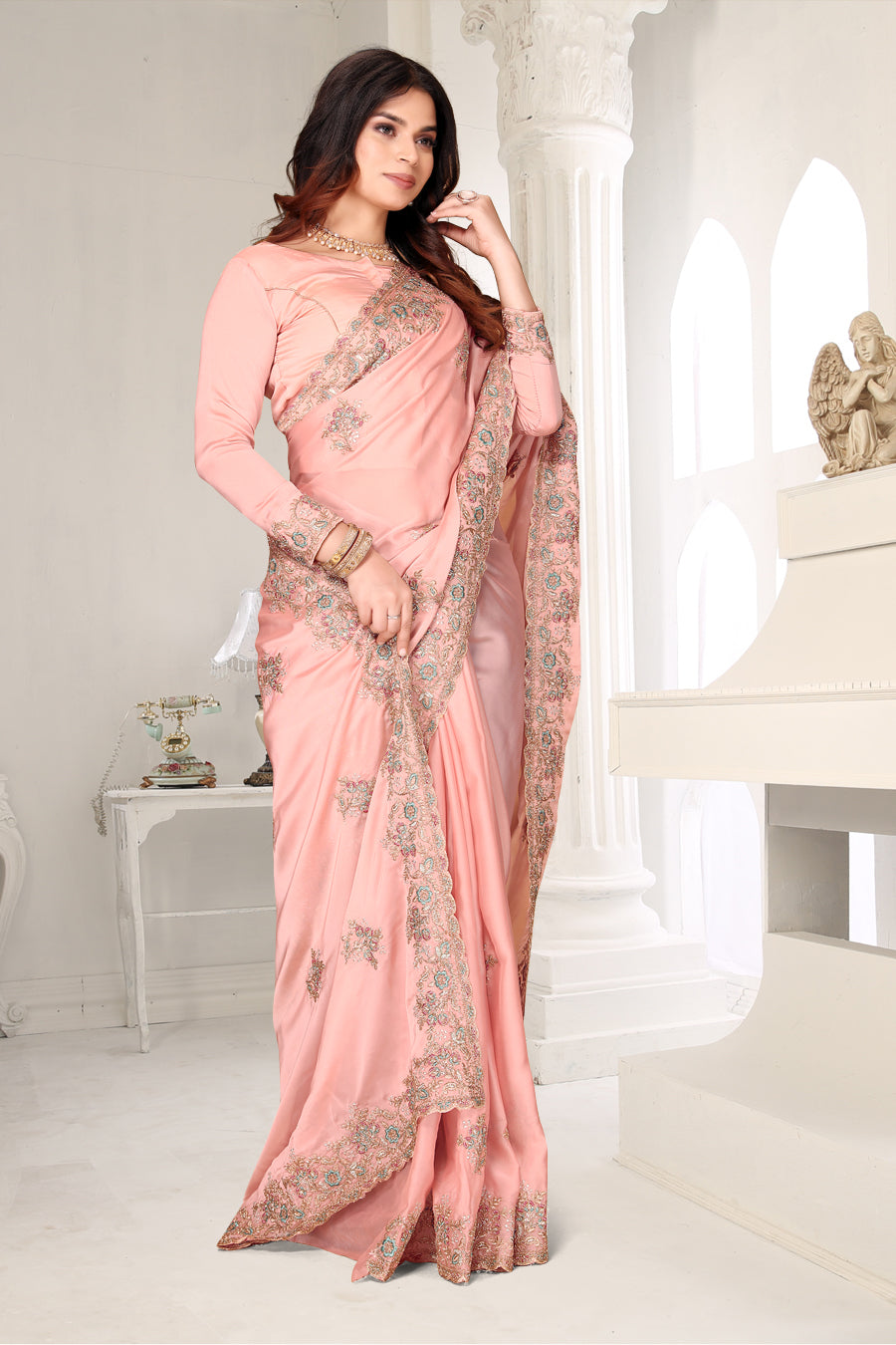 Grace and grandeur meet in this exquisite saree, adorned with intricately embroidered floral motifs and a richly detailed border. Made from luxurious silk fabric, this saree exudes sophistication and is ideal for weddings, festive celebrations, or grand evening functions. The subtle pastel embroidery in hues of gold, green, and pink adds a vintage charm, making it a timeless addition to your ethnic collection.