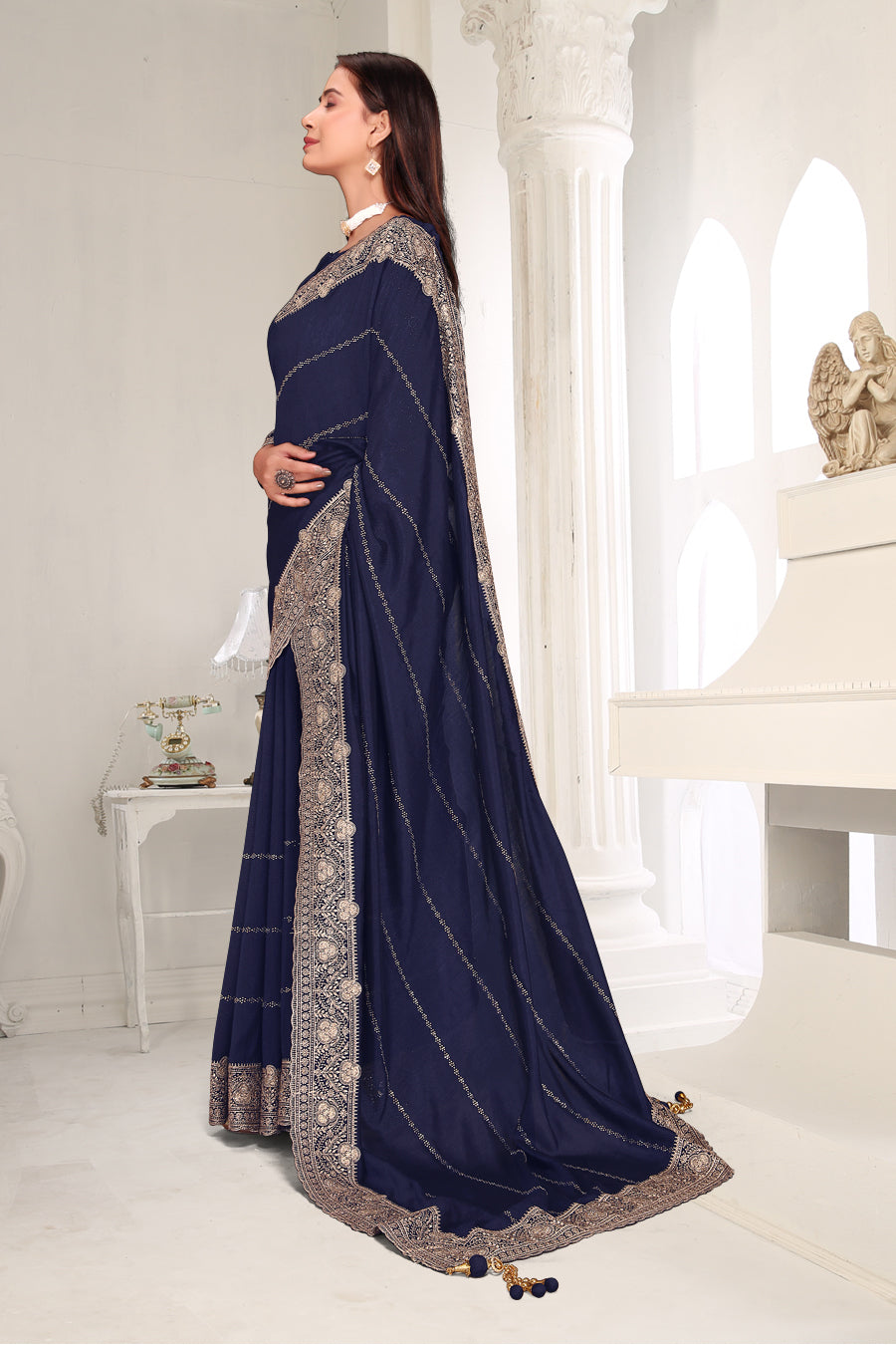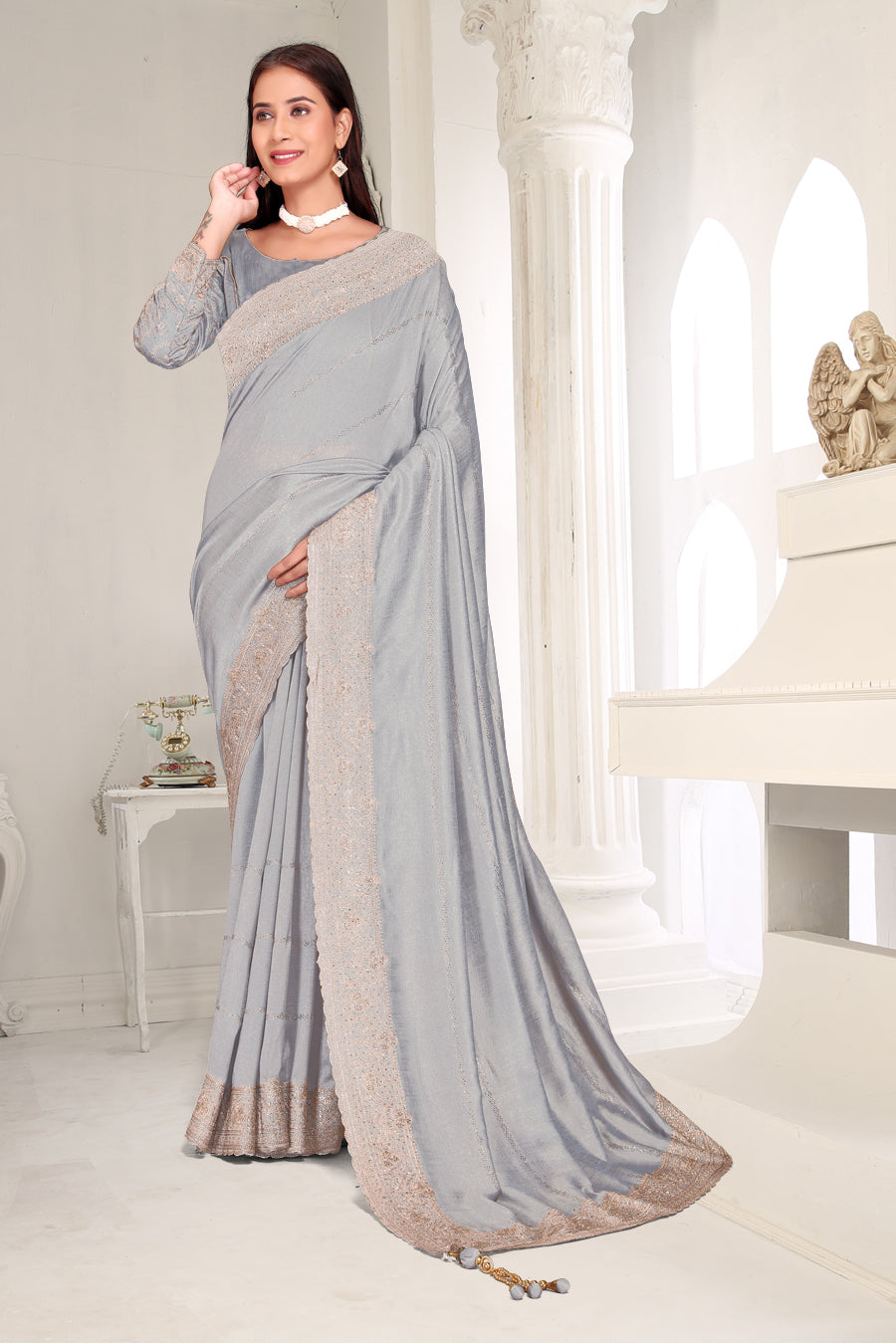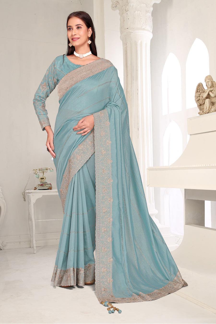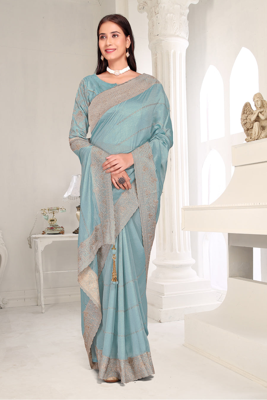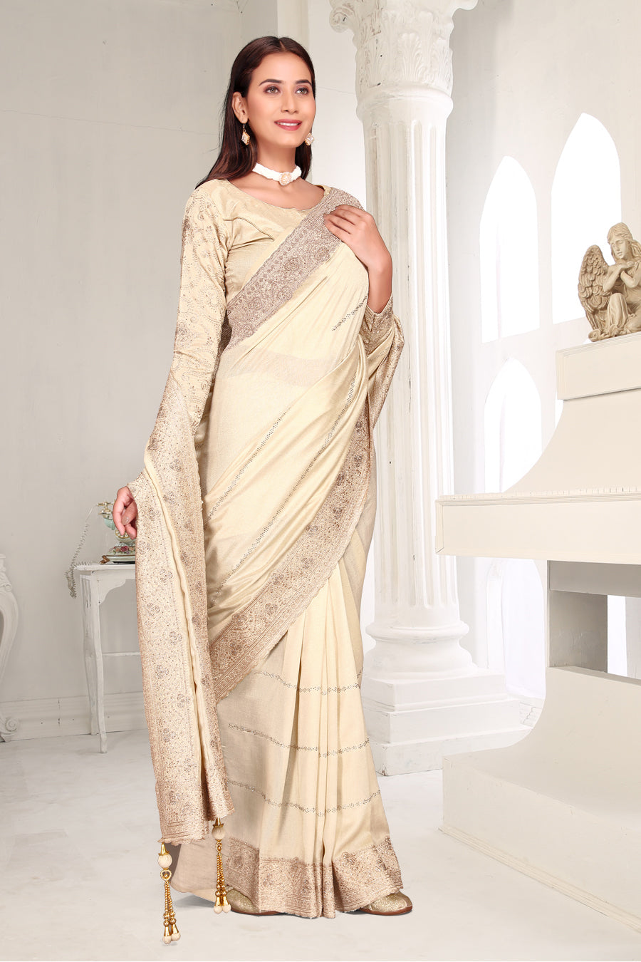 Drape yourself in timeless grace with this exquisite creation from the Fabeha Prêt Collection. Crafted from Premium Soft Vichitra, this saree is defined by its incredibly soft feel and flowy drape. Unlike stiff fabrics, it sits comfortably against the skin, offering a subtle, sophisticated sheen that looks rich without being overly shiny. The beauty lies in the refined detailing. The saree features intricate Gold Zari embroidery running along the borders. To add a touch of modern glamour, we have embellished the drape with lines of shimmering Micro Crystals scattered across the fabric. These delicate stones create a sophisticated, linear sparkle that catches the light with every movement. Finished with stylish latkans (tassels) on the pallu, this ensemble is pure, regal charm. The Perfect Fit: Couture-Style Adjustable BlouseExperience the confidence of a custom fit with our ready-to-wear Princess Cut blouse. Engineered to hug your curves with a convenient front opening, it marries comfort with absolute glamour.