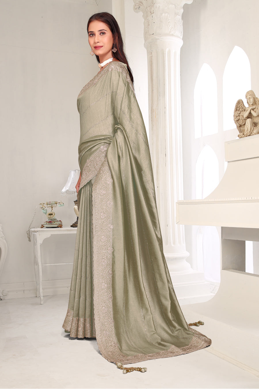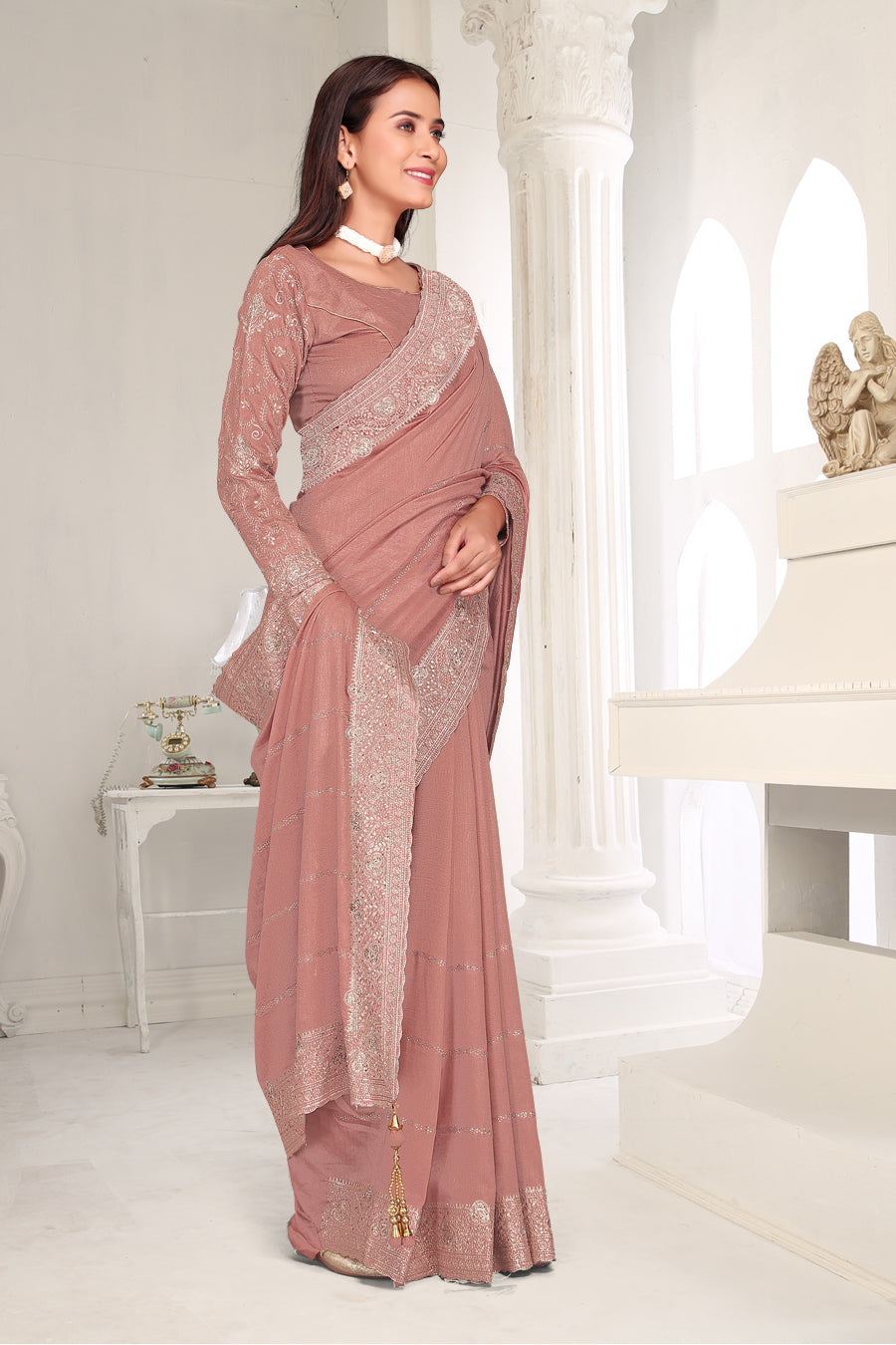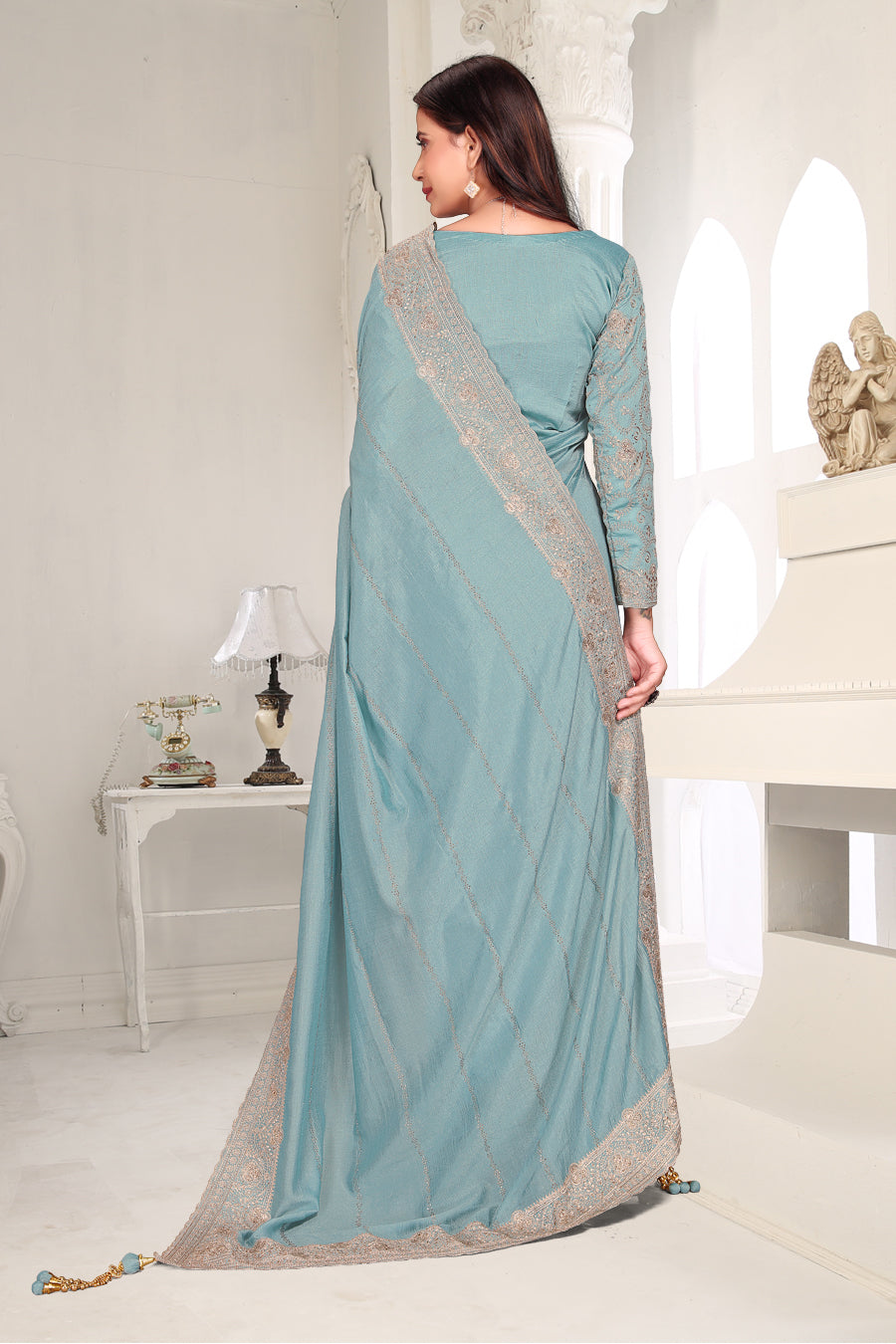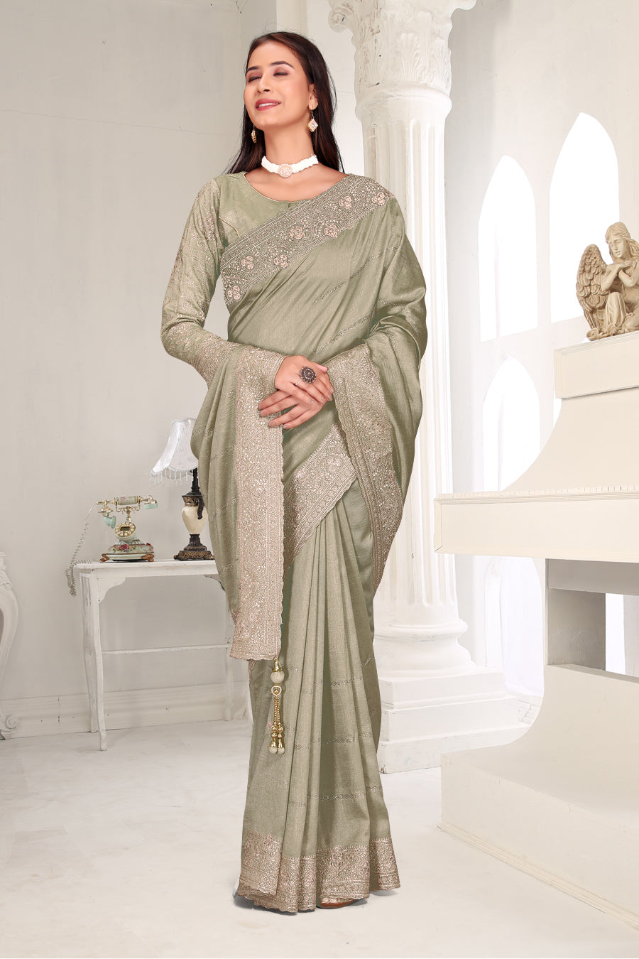 Drape yourself in timeless grace with this exquisite creation from the Fabeha Prêt Collection. Crafted from Premium Soft Vichitra, this saree is defined by its incredibly soft feel and flowy drape. Unlike stiff fabrics, it sits comfortably against the skin, offering a subtle, sophisticated sheen that looks rich without being overly shiny. The beauty lies in the refined detailing. The saree features intricate Gold Zari embroidery running along the borders. To add a touch of modern glamour, we have embellished the drape with lines of shimmering Micro Crystals scattered across the fabric. These delicate stones create a sophisticated, linear sparkle that catches the light with every movement. Finished with stylish latkans (tassels) on the pallu, this ensemble is pure, regal charm. The Perfect Fit: Couture-Style Adjustable BlouseExperience the confidence of a custom fit with our ready-to-wear Princess Cut blouse. Engineered to hug your curves with a convenient front opening, it marries comfort with absolute glamour.