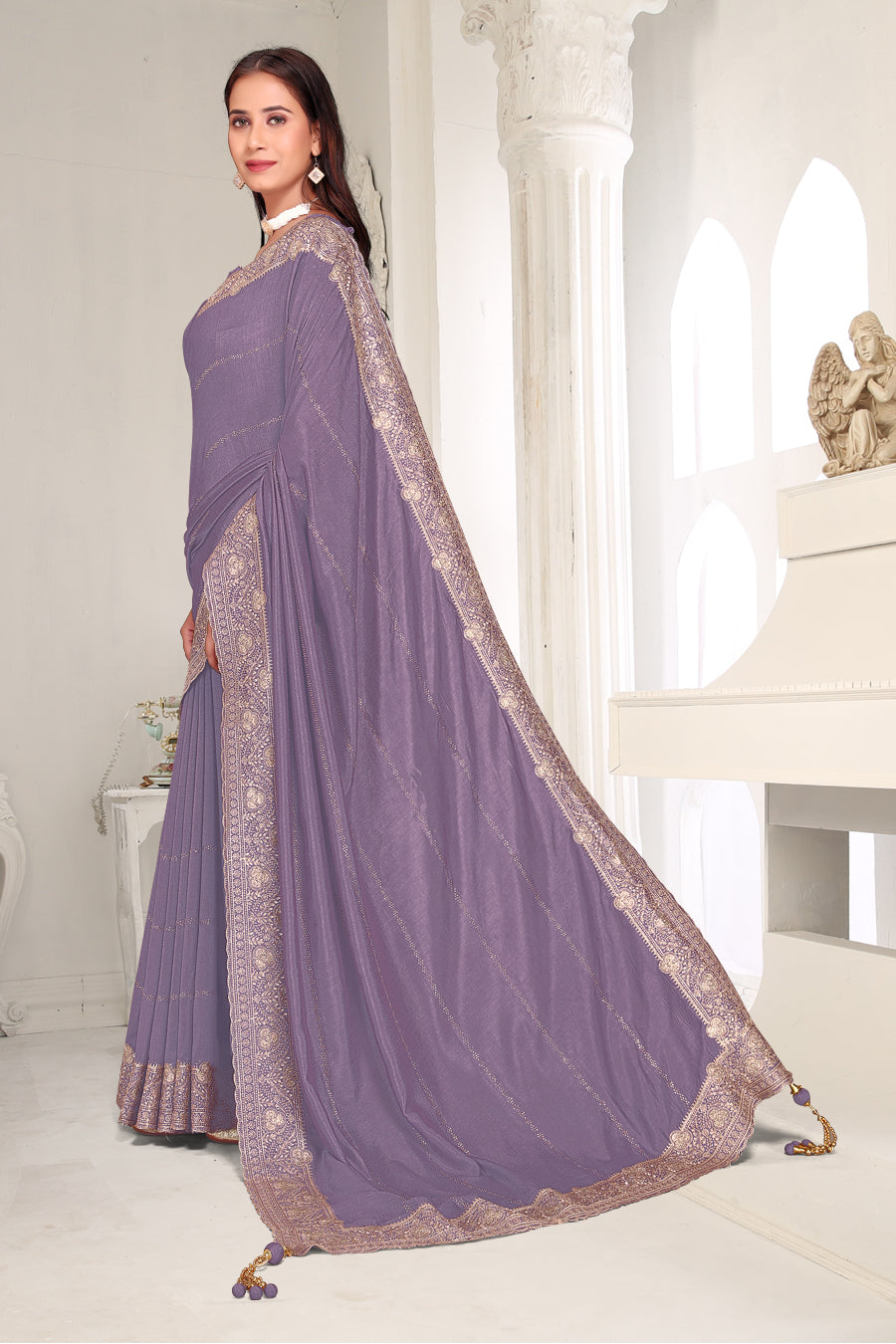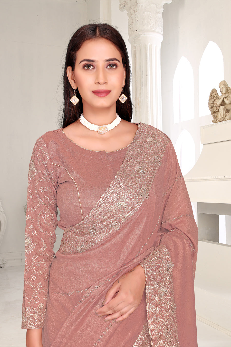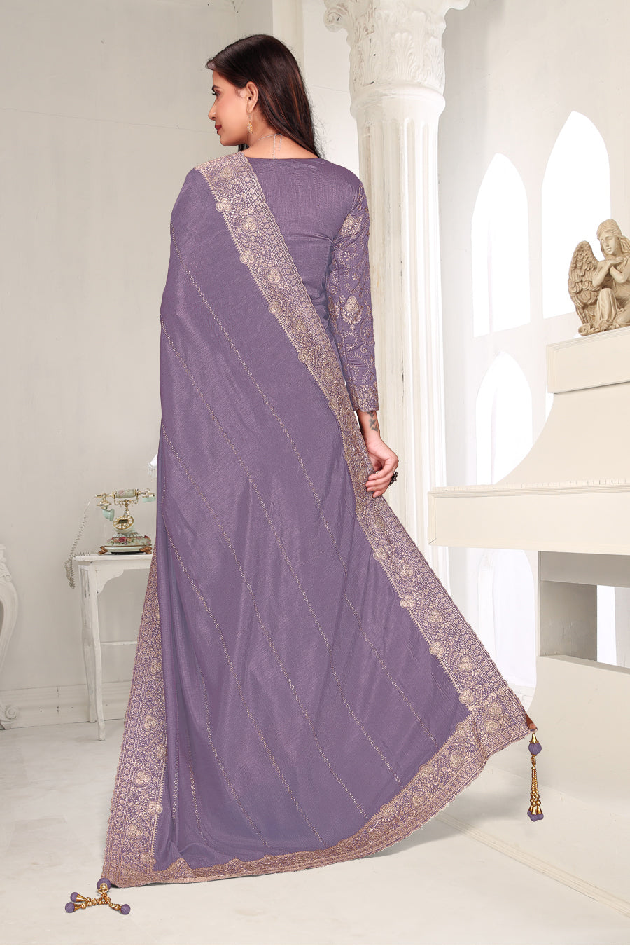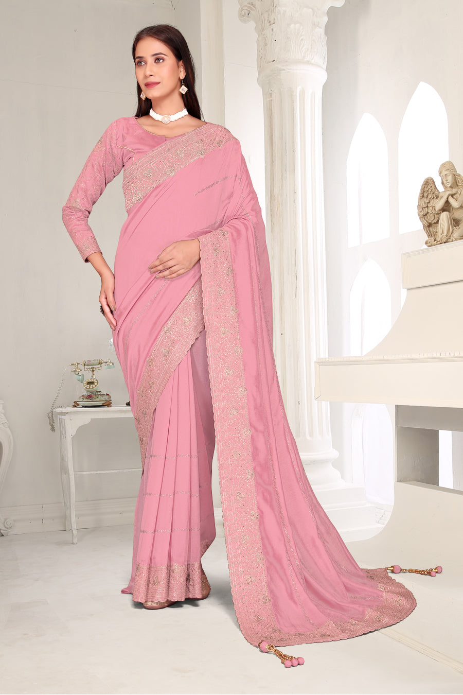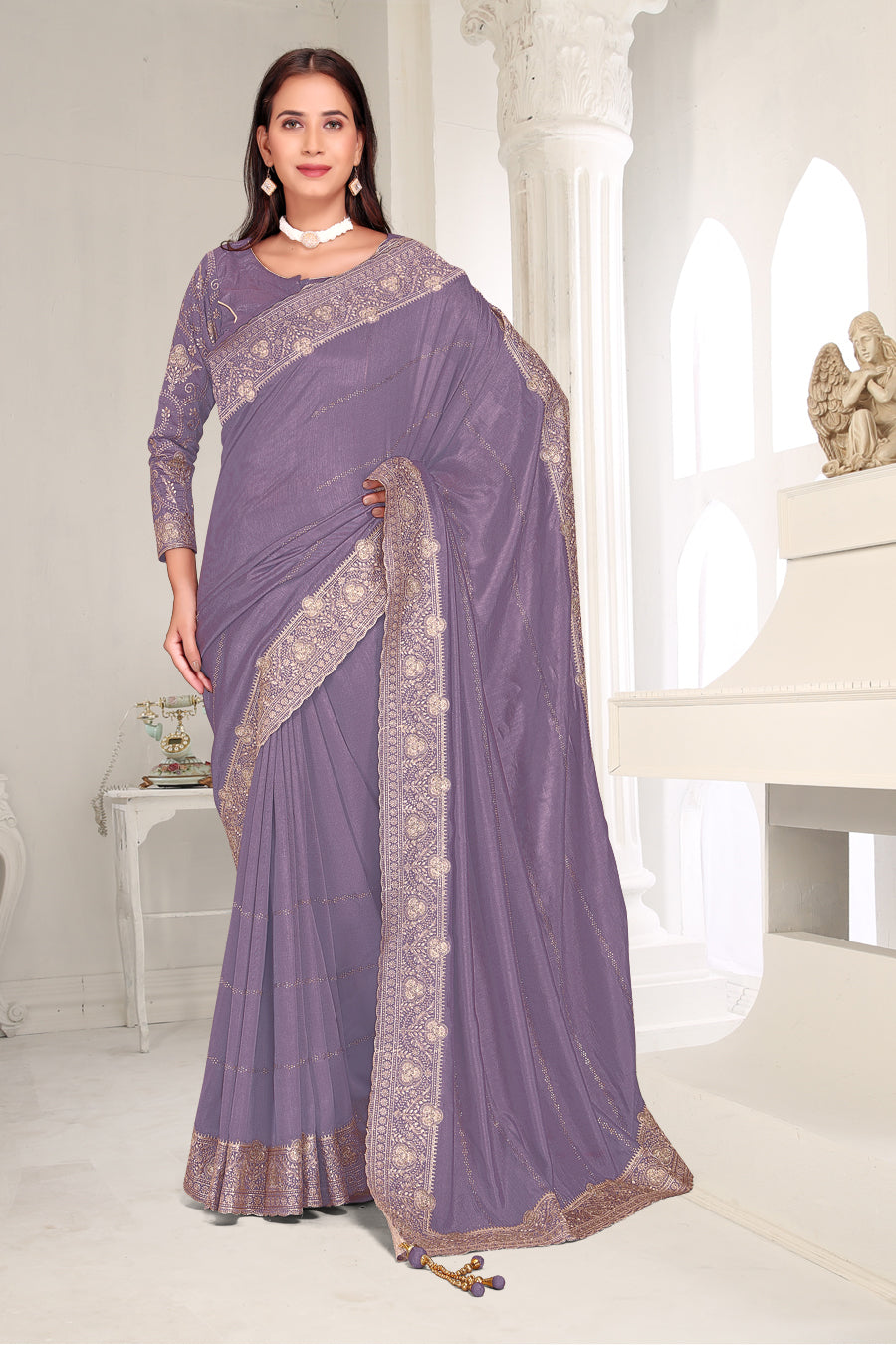 Drape yourself in timeless grace with this exquisite creation from the Fabeha Prêt Collection. Crafted from Premium Soft Vichitra, this saree is defined by its incredibly soft feel and flowy drape. Unlike stiff fabrics, it sits comfortably against the skin, offering a subtle, sophisticated sheen that looks rich without being overly shiny. The beauty lies in the refined detailing. The saree features intricate Gold Zari embroidery running along the borders. To add a touch of modern glamour, we have embellished the drape with lines of shimmering Micro Crystals scattered across the fabric. These delicate stones create a sophisticated, linear sparkle that catches the light with every movement. Finished with stylish latkans (tassels) on the pallu, this ensemble is pure, regal charm. The Perfect Fit: Couture-Style Adjustable BlouseExperience the confidence of a custom fit with our ready-to-wear Princess Cut blouse. Engineered to hug your curves with a convenient front opening, it marries comfort with absolute glamour.