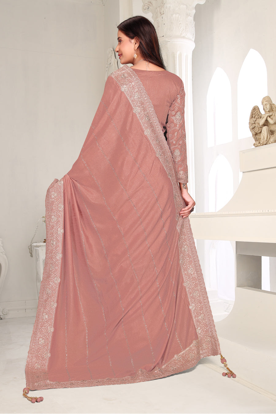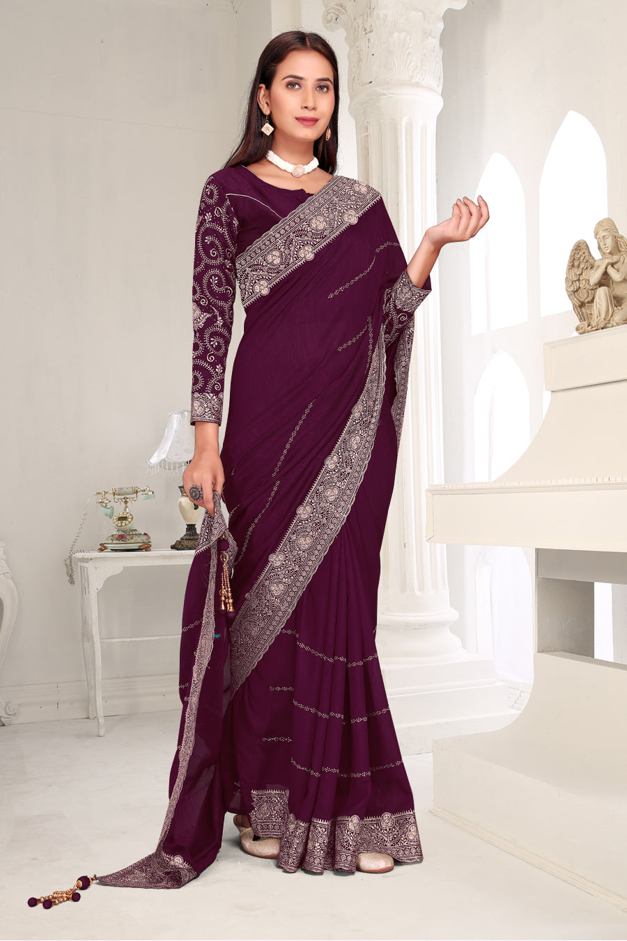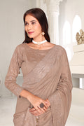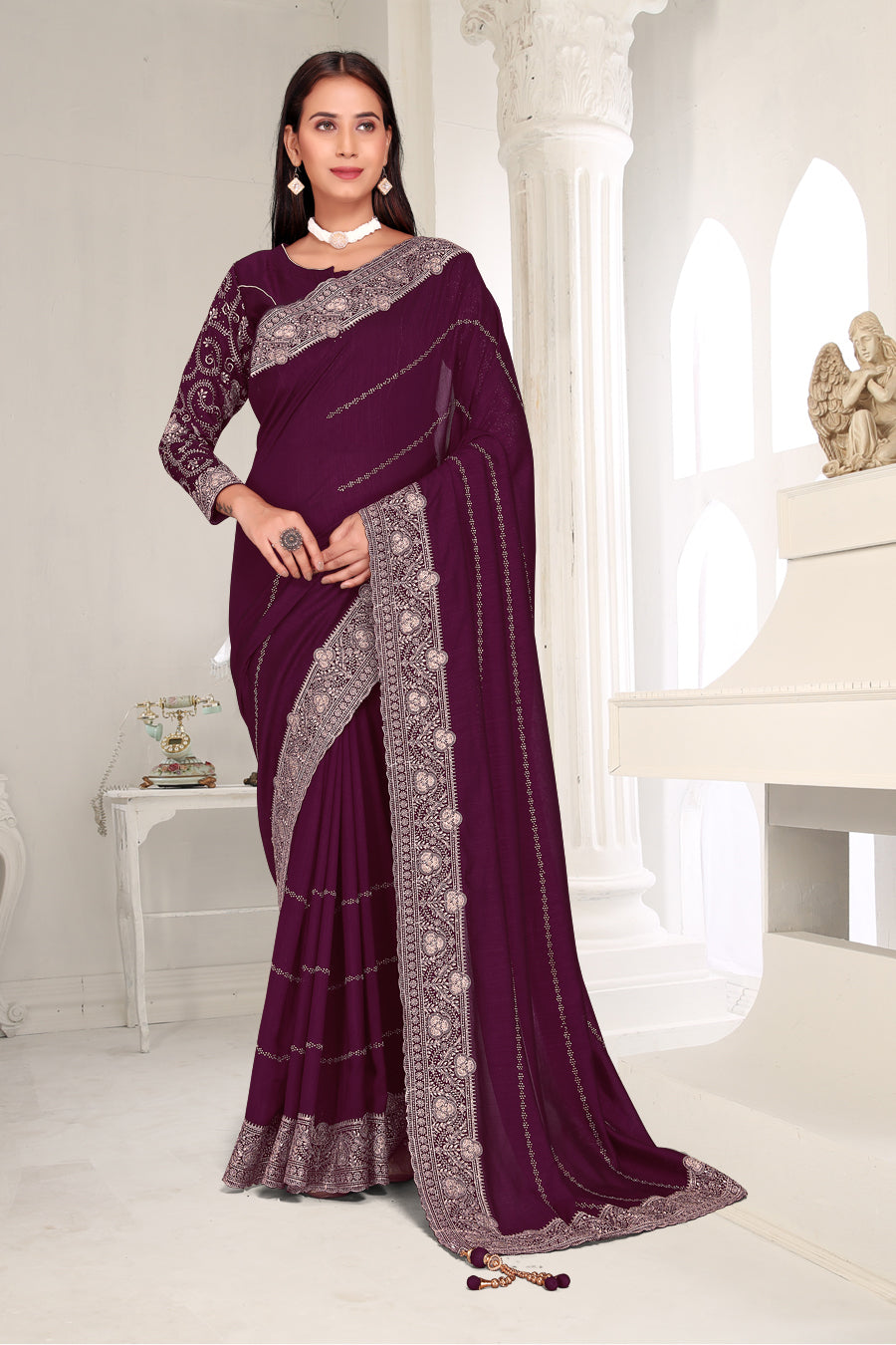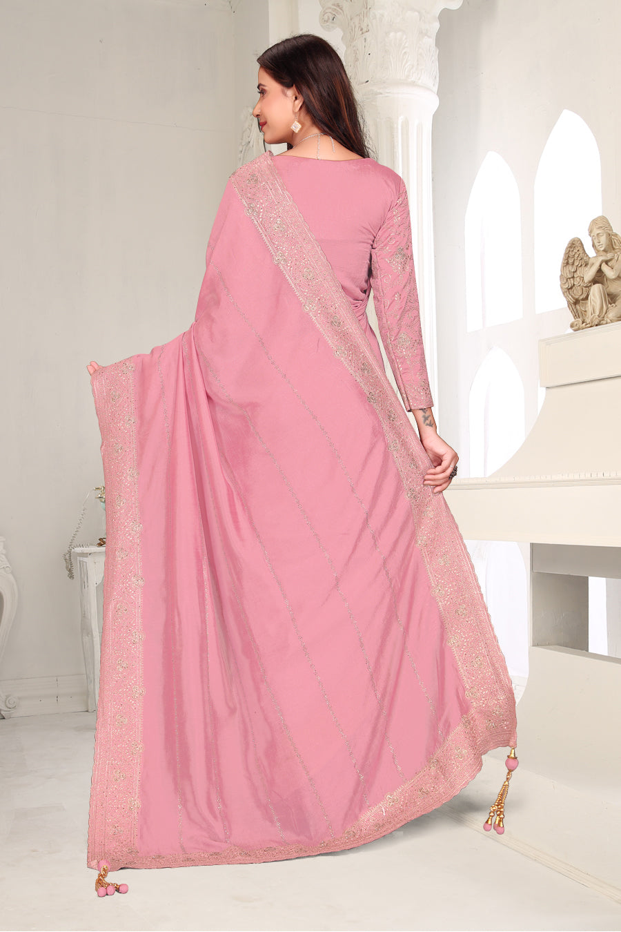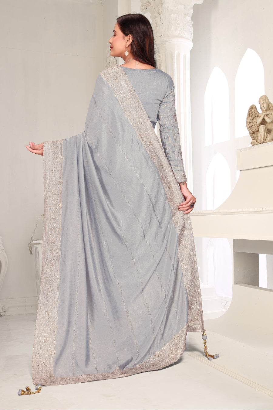 Drape yourself in timeless grace with this exquisite creation from the Fabeha Prêt Collection. Crafted from Premium Soft Vichitra, this saree is defined by its incredibly soft feel and flowy drape. Unlike stiff fabrics, it sits comfortably against the skin, offering a subtle, sophisticated sheen that looks rich without being overly shiny. The beauty lies in the refined detailing. The saree features intricate Gold Zari embroidery running along the borders. To add a touch of modern glamour, we have embellished the drape with lines of shimmering Micro Crystals scattered across the fabric. These delicate stones create a sophisticated, linear sparkle that catches the light with every movement. Finished with stylish latkans (tassels) on the pallu, this ensemble is pure, regal charm. The Perfect Fit: Couture-Style Adjustable BlouseExperience the confidence of a custom fit with our ready-to-wear Princess Cut blouse. Engineered to hug your curves with a convenient front opening, it marries comfort with absolute glamour.