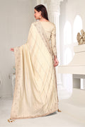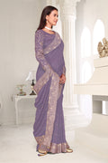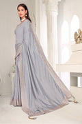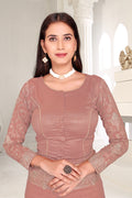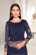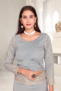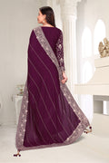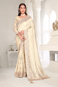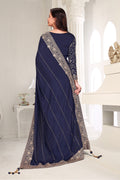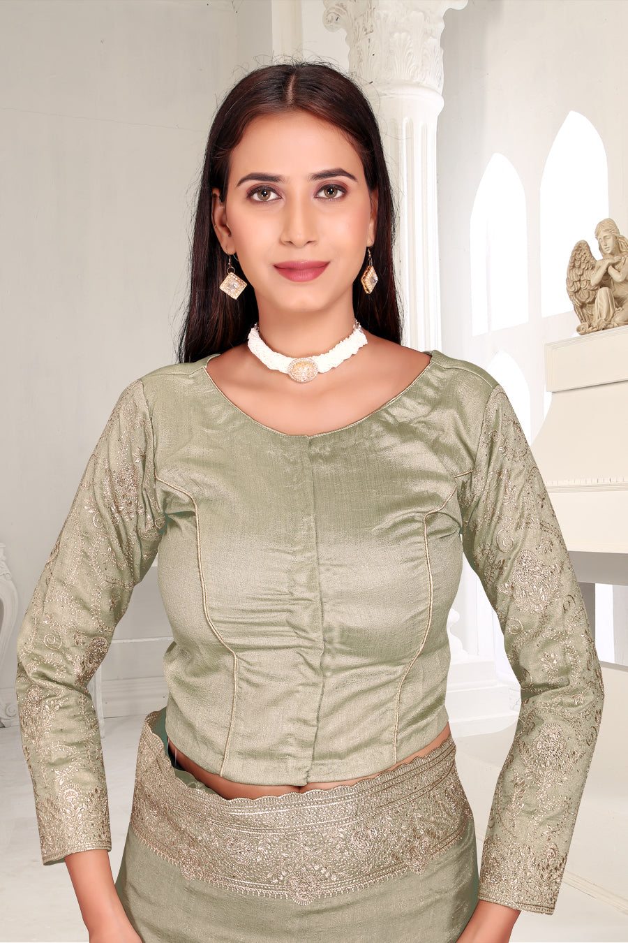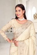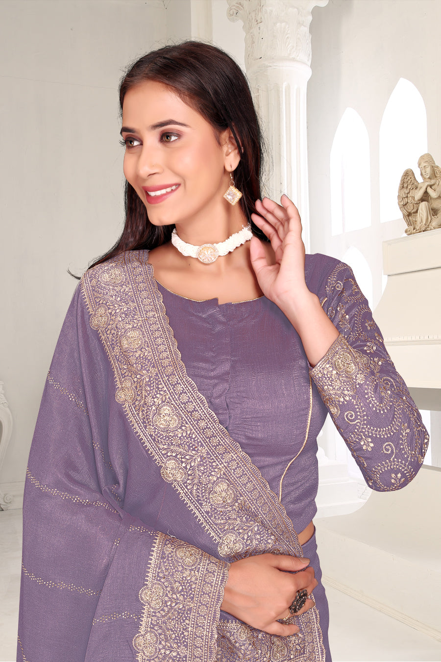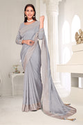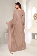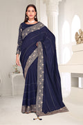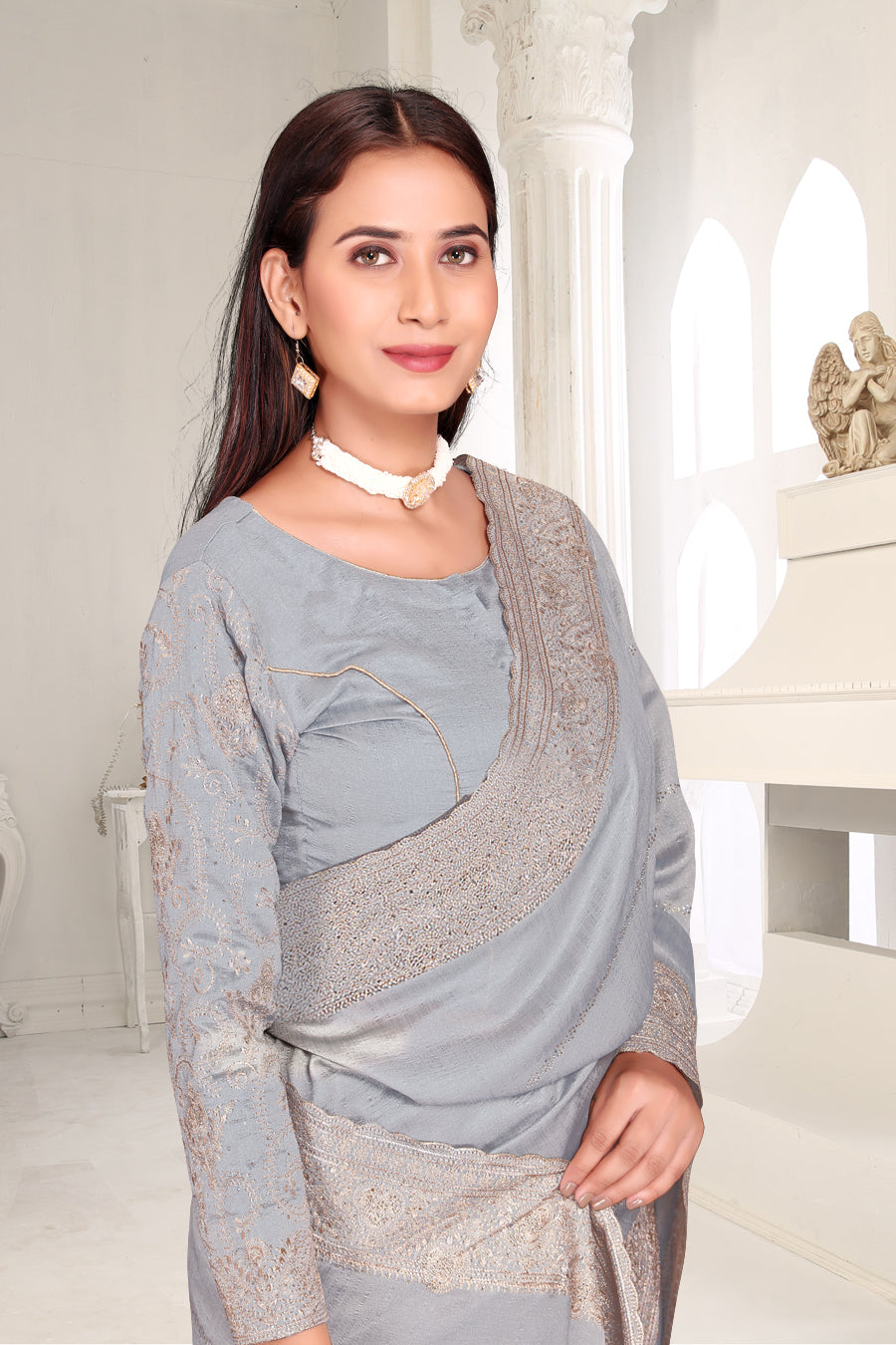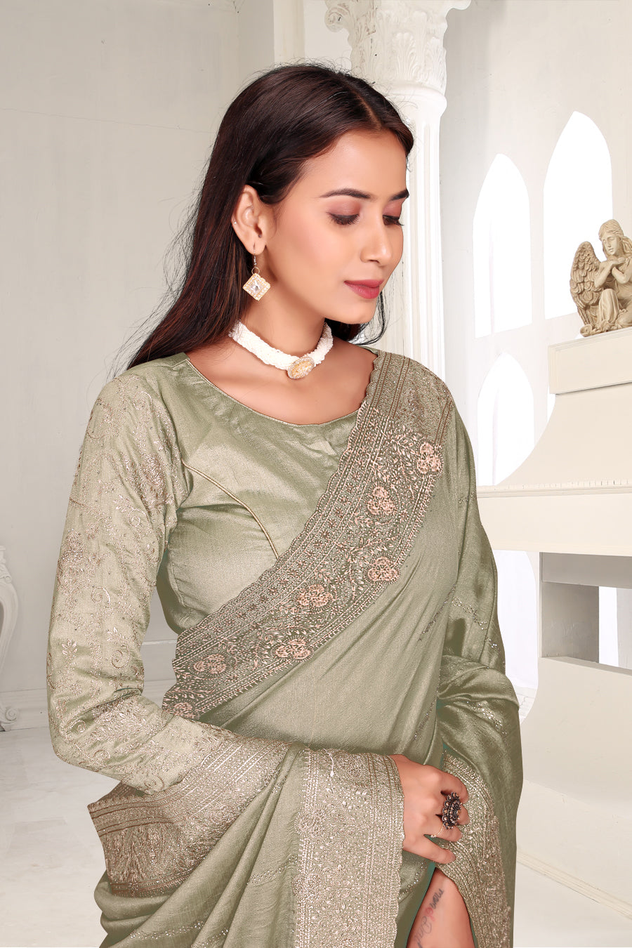 Drape yourself in timeless grace with this exquisite creation from the Fabeha Prêt Collection. Crafted from Premium Soft Vichitra, this saree is defined by its incredibly soft feel and flowy drape. Unlike stiff fabrics, it sits comfortably against the skin, offering a subtle, sophisticated sheen that looks rich without being overly shiny. The beauty lies in the refined detailing. The saree features intricate Gold Zari embroidery running along the borders. To add a touch of modern glamour, we have embellished the drape with lines of shimmering Micro Crystals scattered across the fabric. These delicate stones create a sophisticated, linear sparkle that catches the light with every movement. Finished with stylish latkans (tassels) on the pallu, this ensemble is pure, regal charm. The Perfect Fit: Couture-Style Adjustable BlouseExperience the confidence of a custom fit with our ready-to-wear Princess Cut blouse. Engineered to hug your curves with a convenient front opening, it marries comfort with absolute glamour.